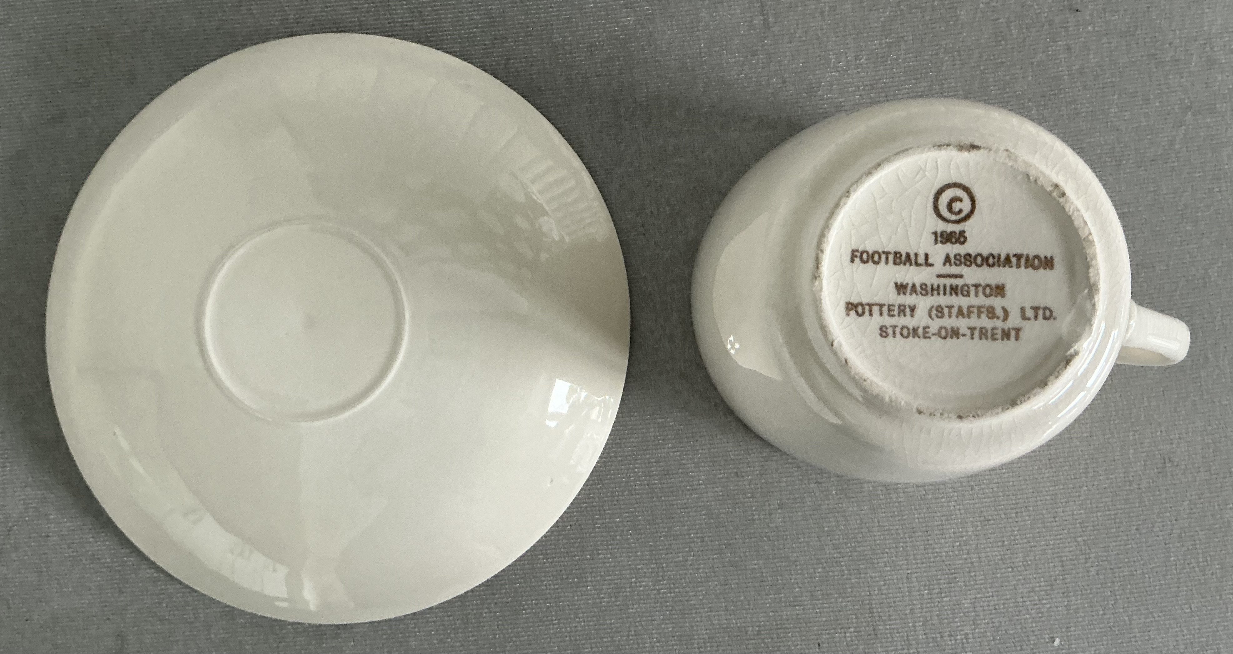 1966 World Cup Willie Tea Cup: Stunning condition featuring a colourful WC Willie cup with handle. Underneath the Football Association copyright. C/W saucer that we are informed belongs with the cup but without FA copyright we are not so certain. (2)