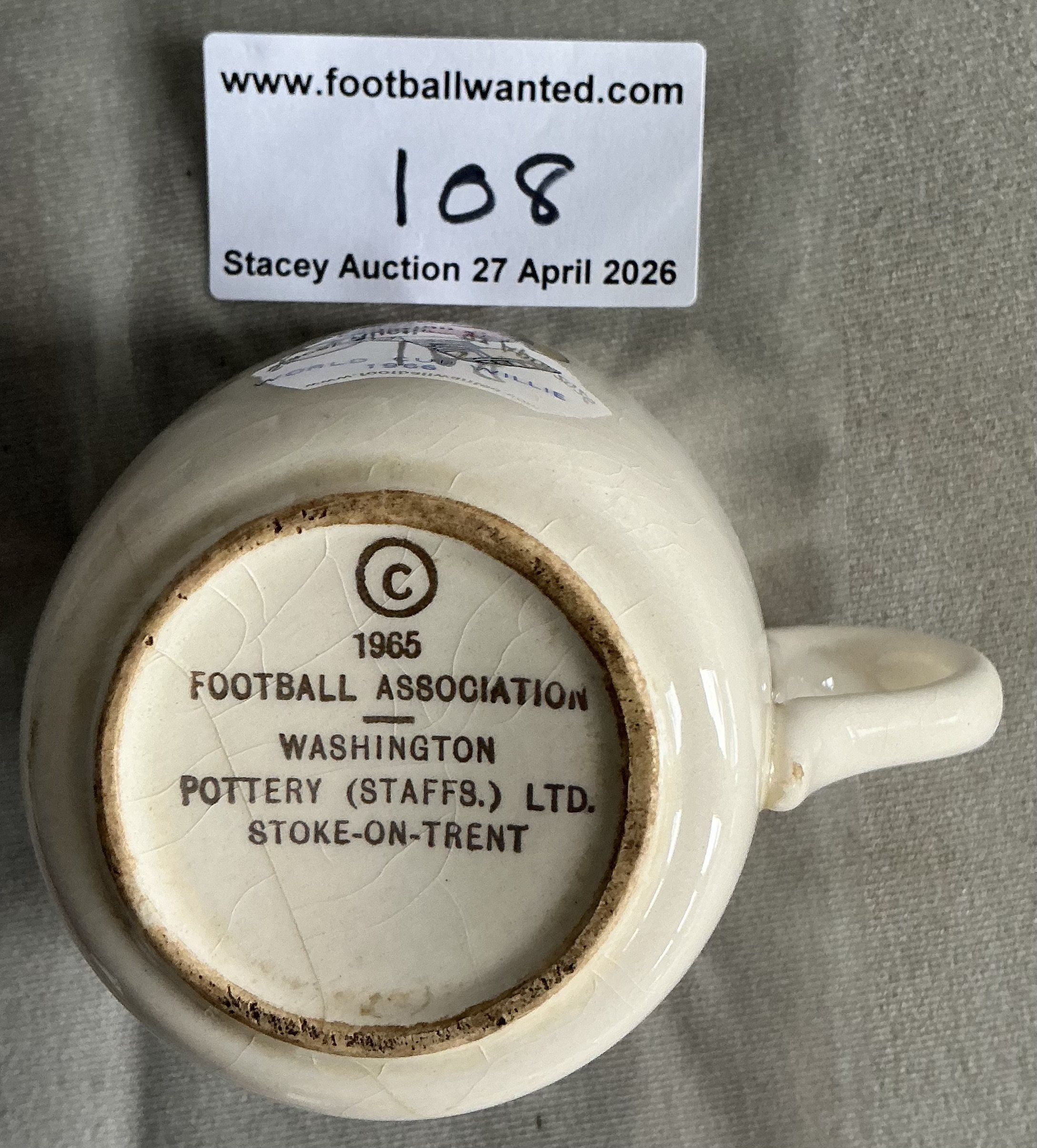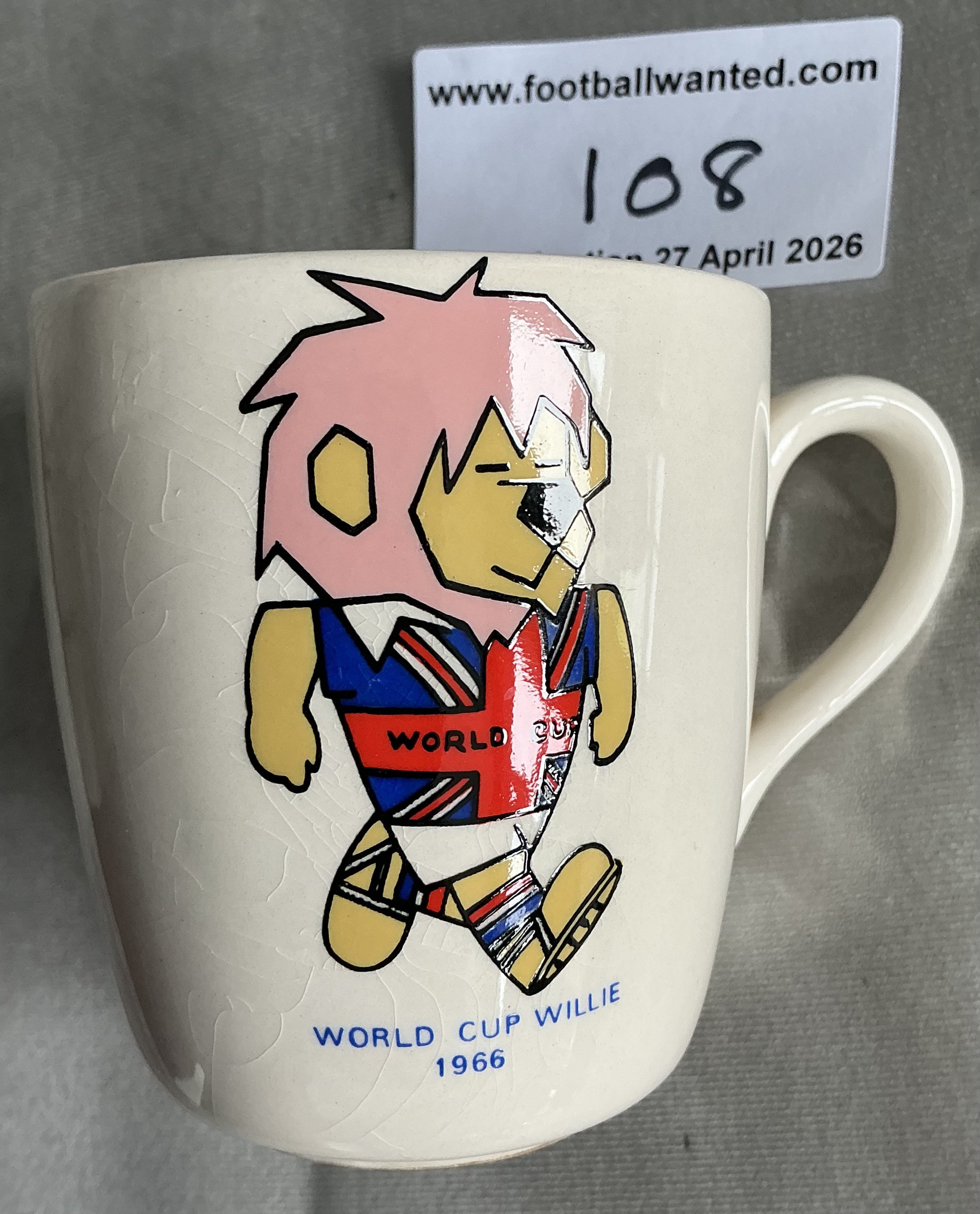 1966 World Cup Willie Football Mug: Good condition white mug with a colourful WC Willie to one side. Football Association copyright to base. Never been broken but you can see a crack.