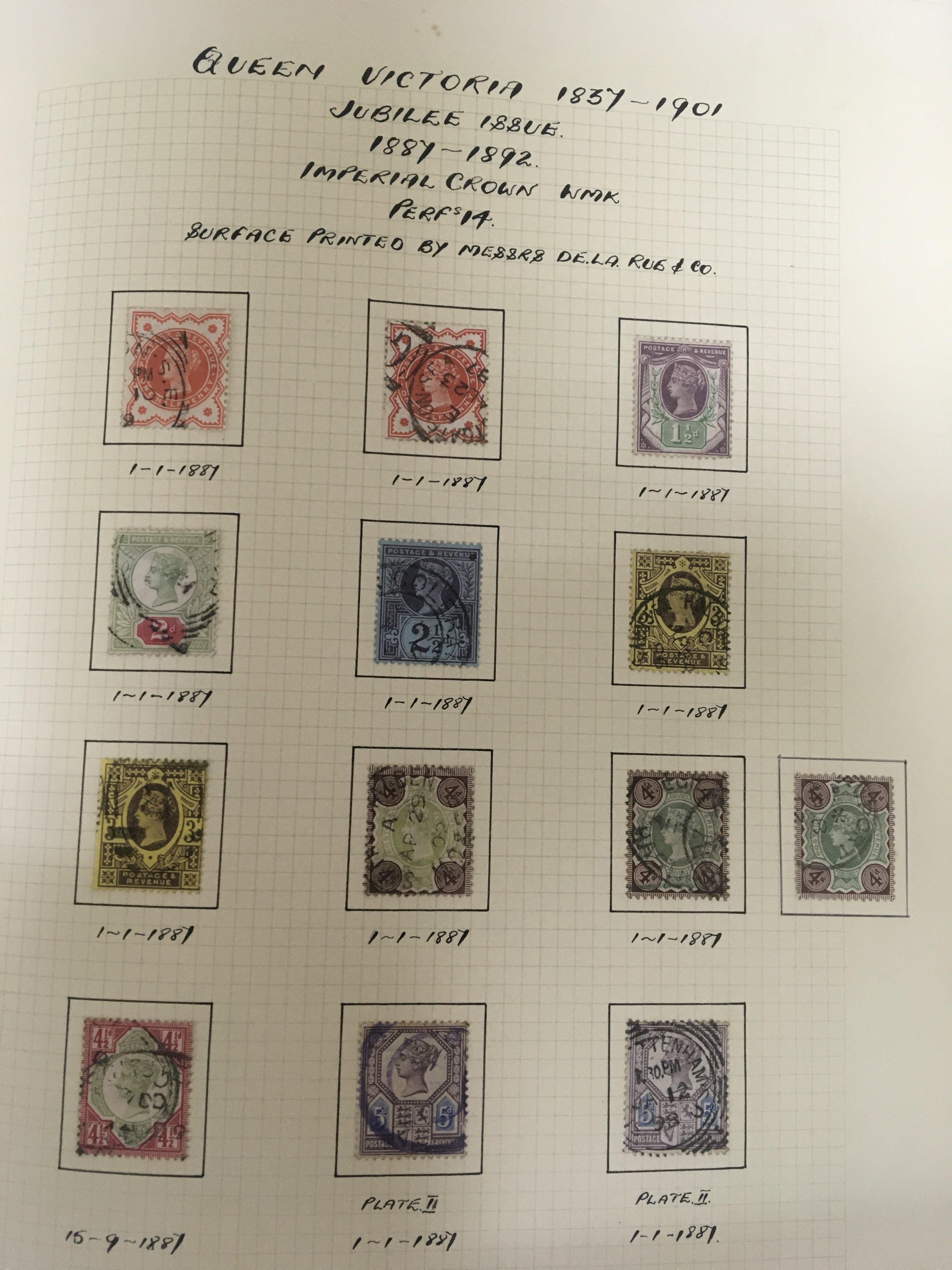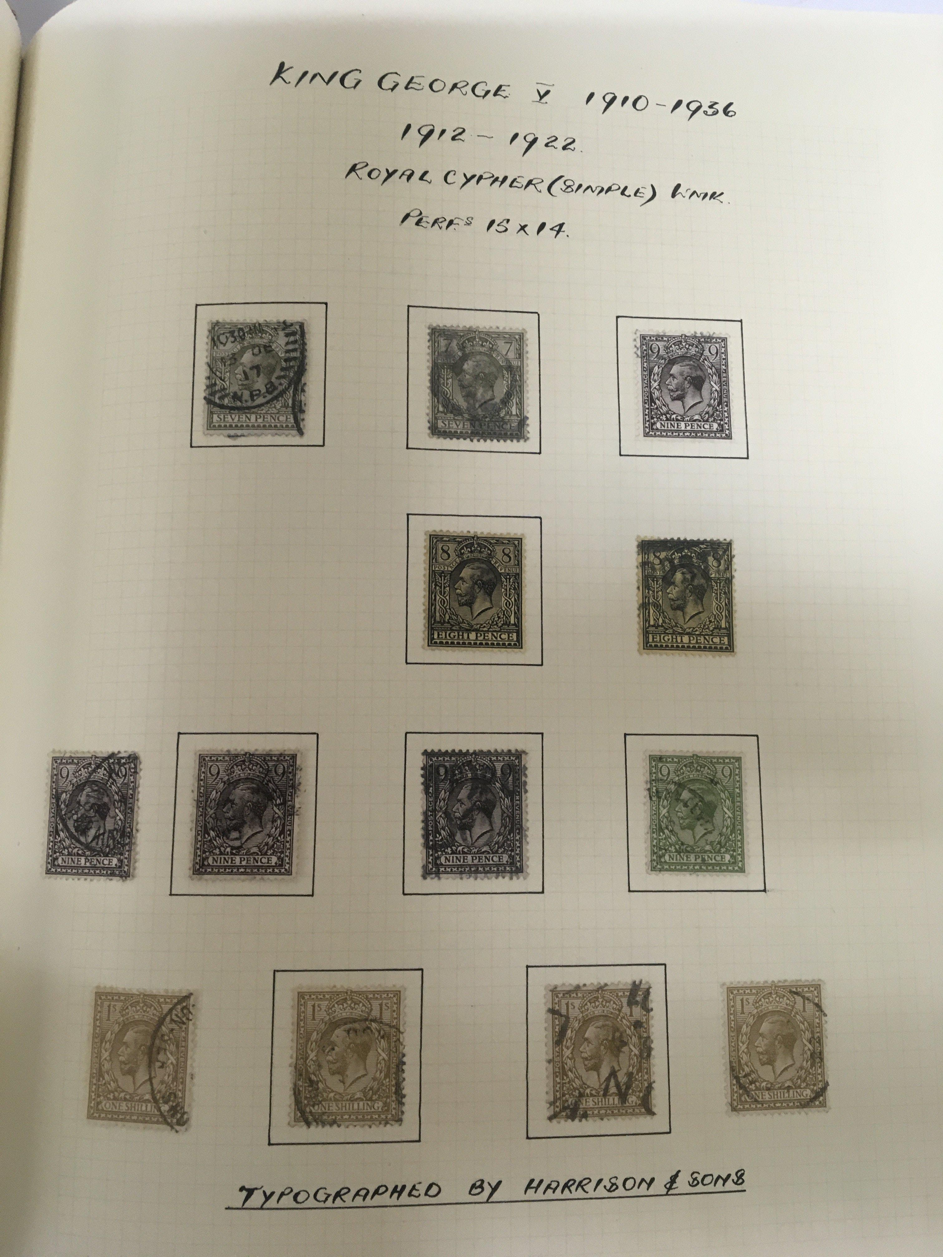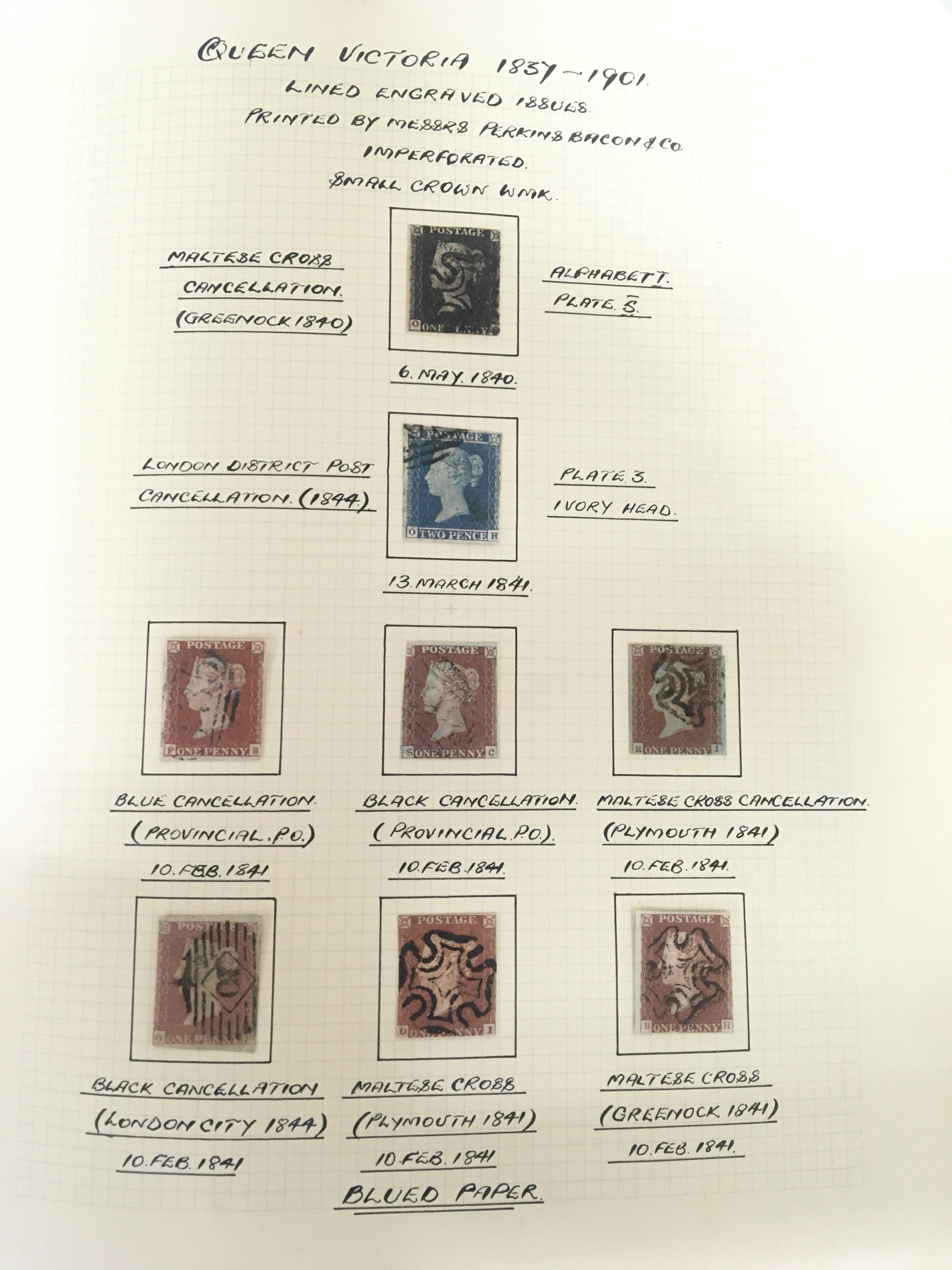 An extremely well presented album of British stamp history from 1840-1958. Starting with a Penny black each stamp detailed hand written description.