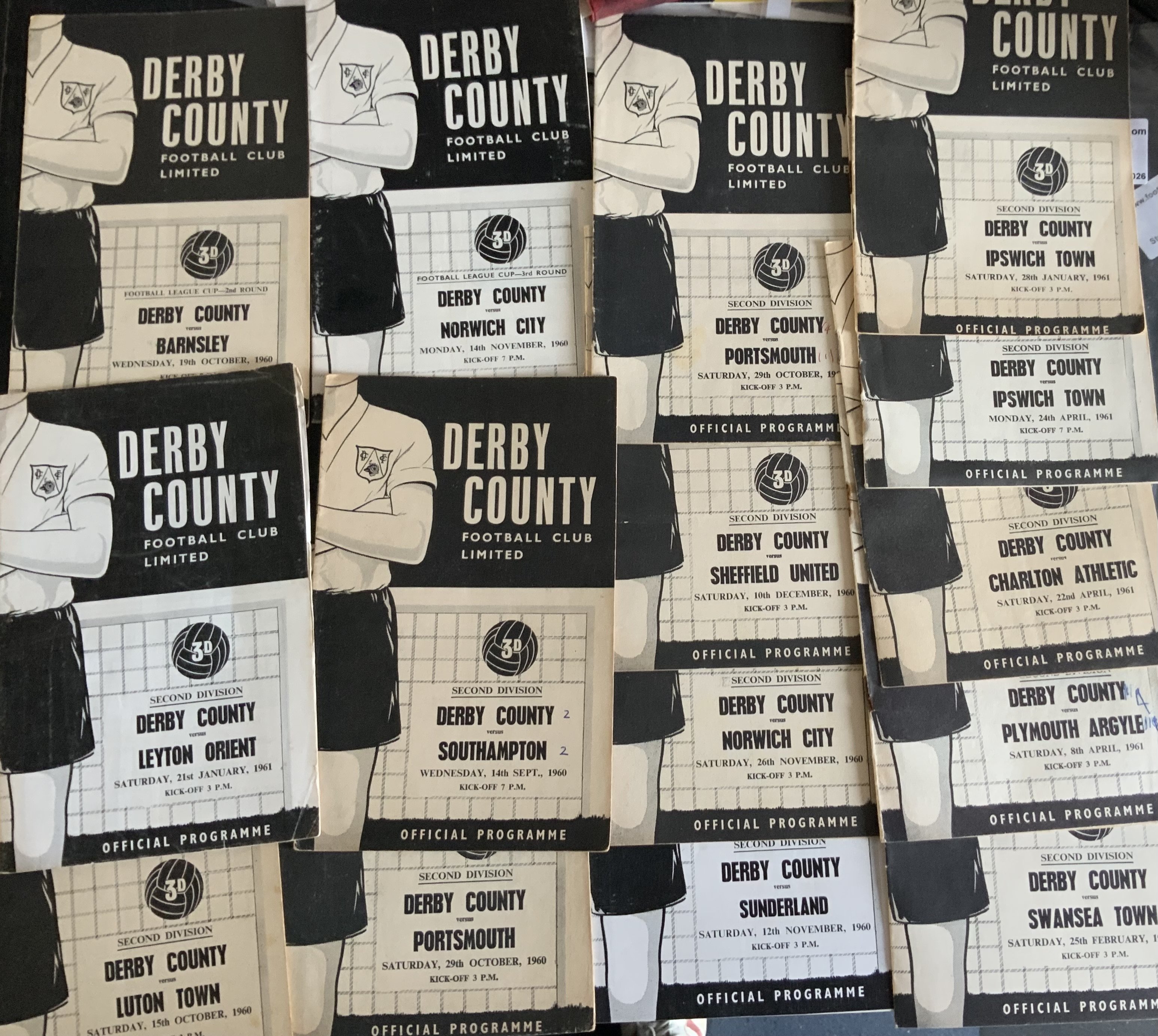 Derby County Home Football Programmes: 9 from the late 50s, 15 from 60/61 to include Barnsley and Norwich League Cup. Fair/good. Instructions to sell. (24)