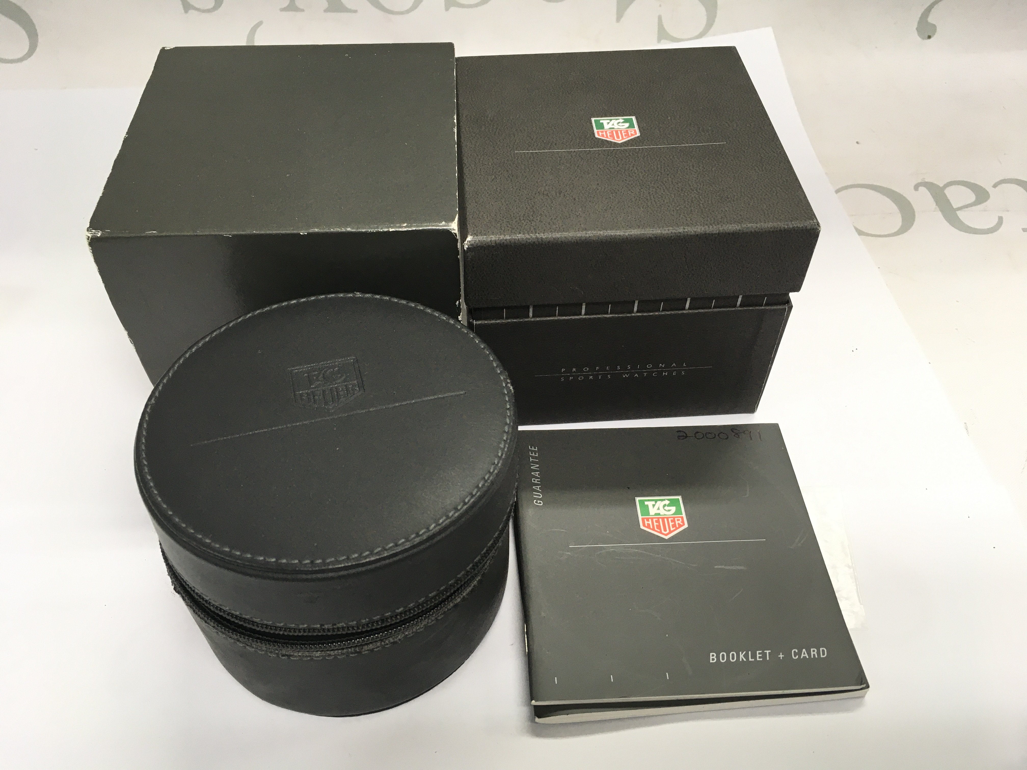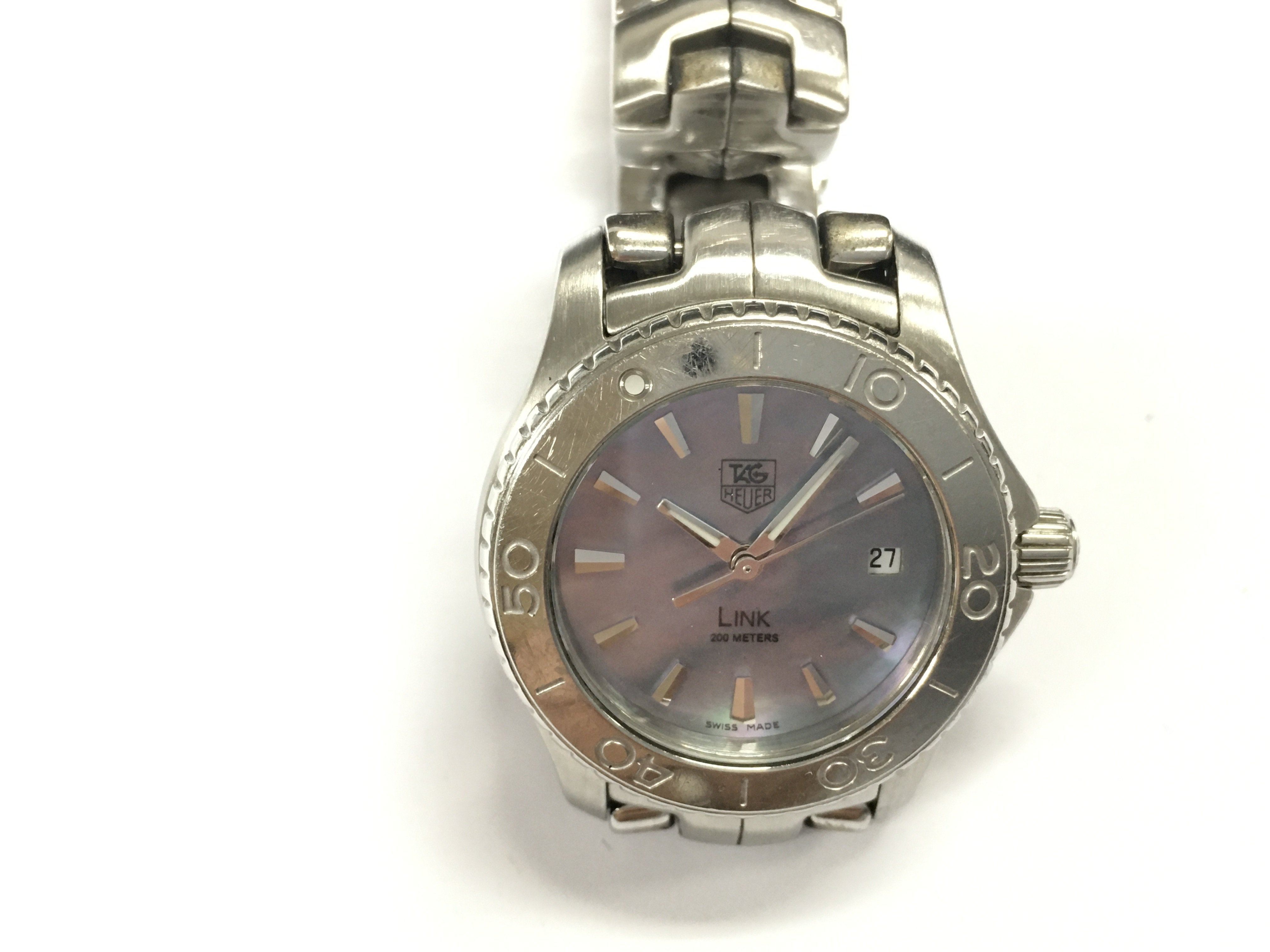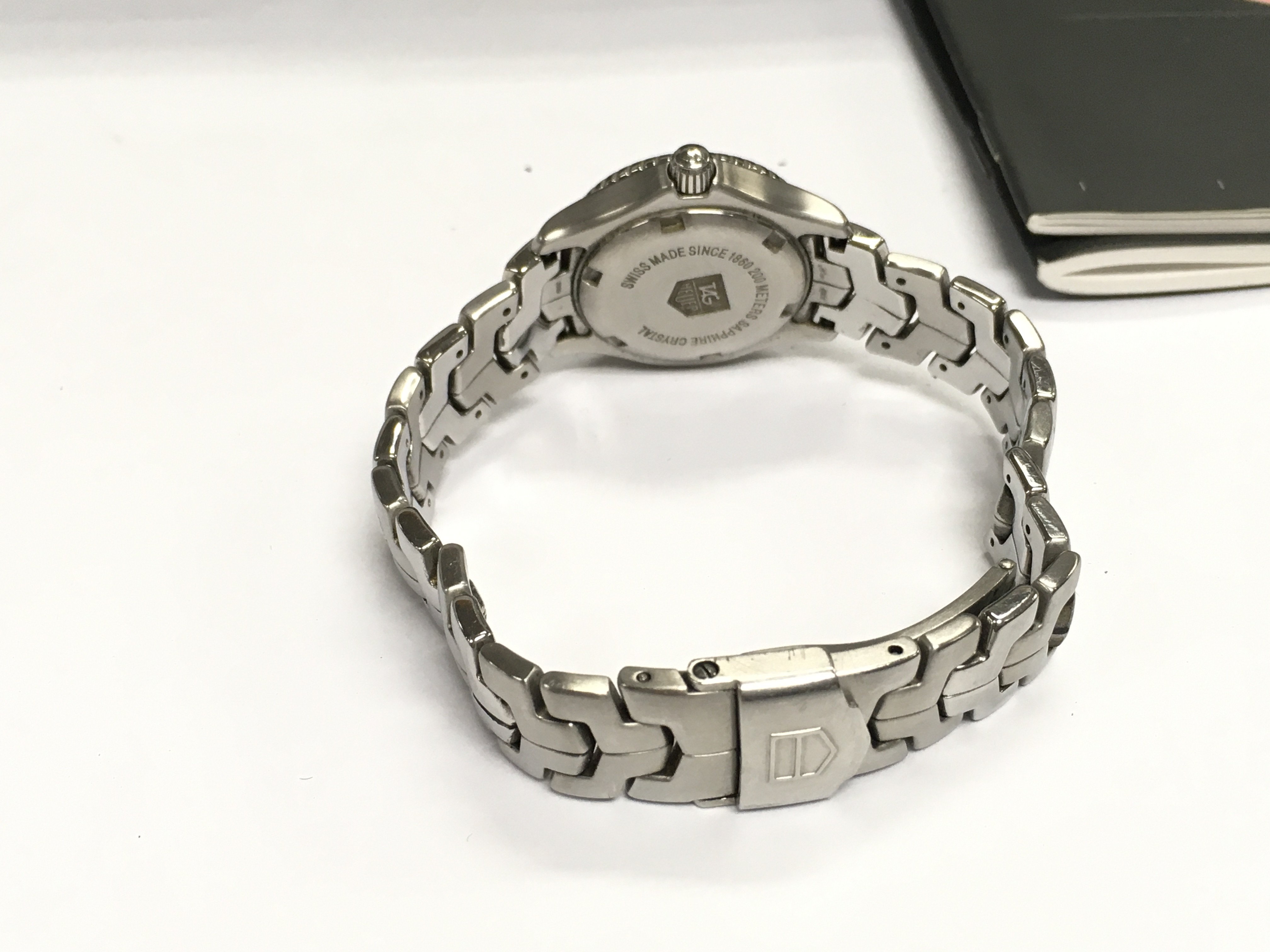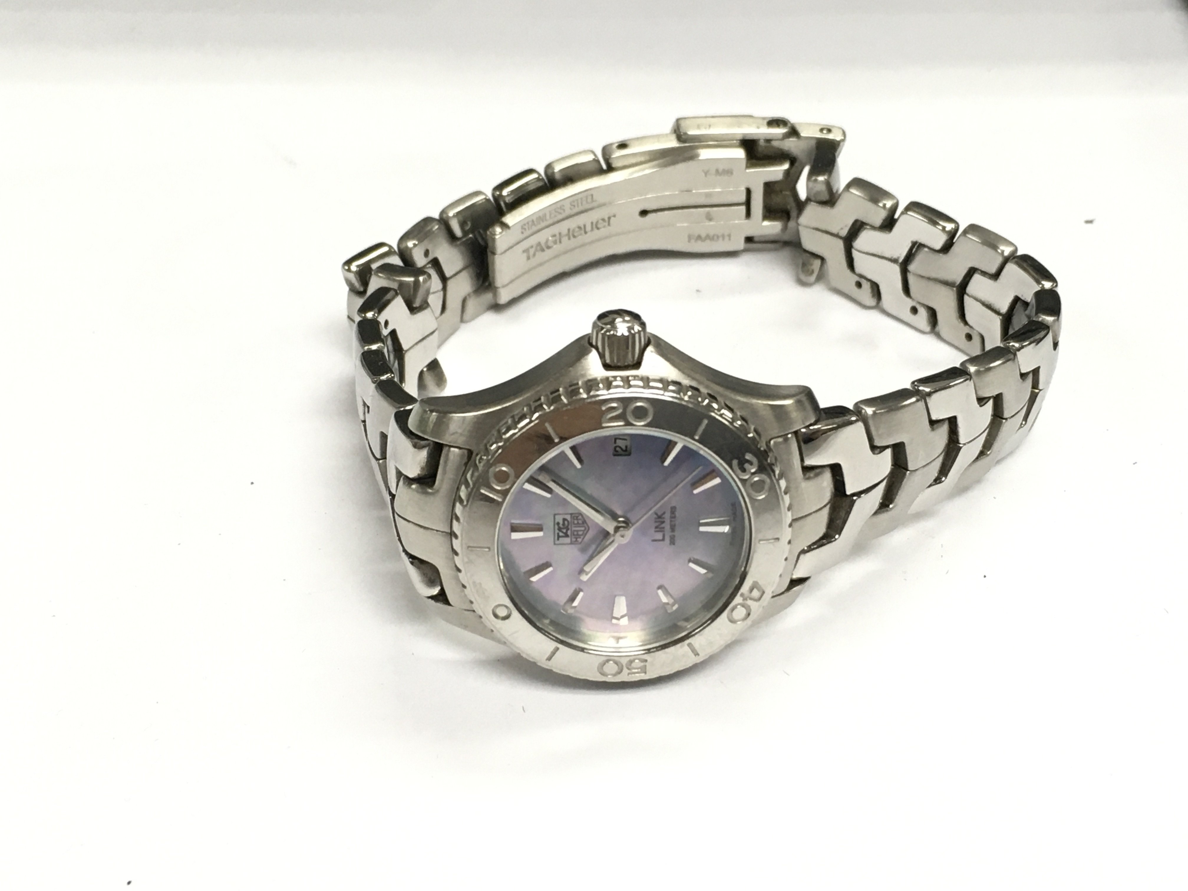 A ladies Tag Heuer link quartz watch. Stainless steel case and bracelet with a mother of Pearl dial. Comes with box and papers.