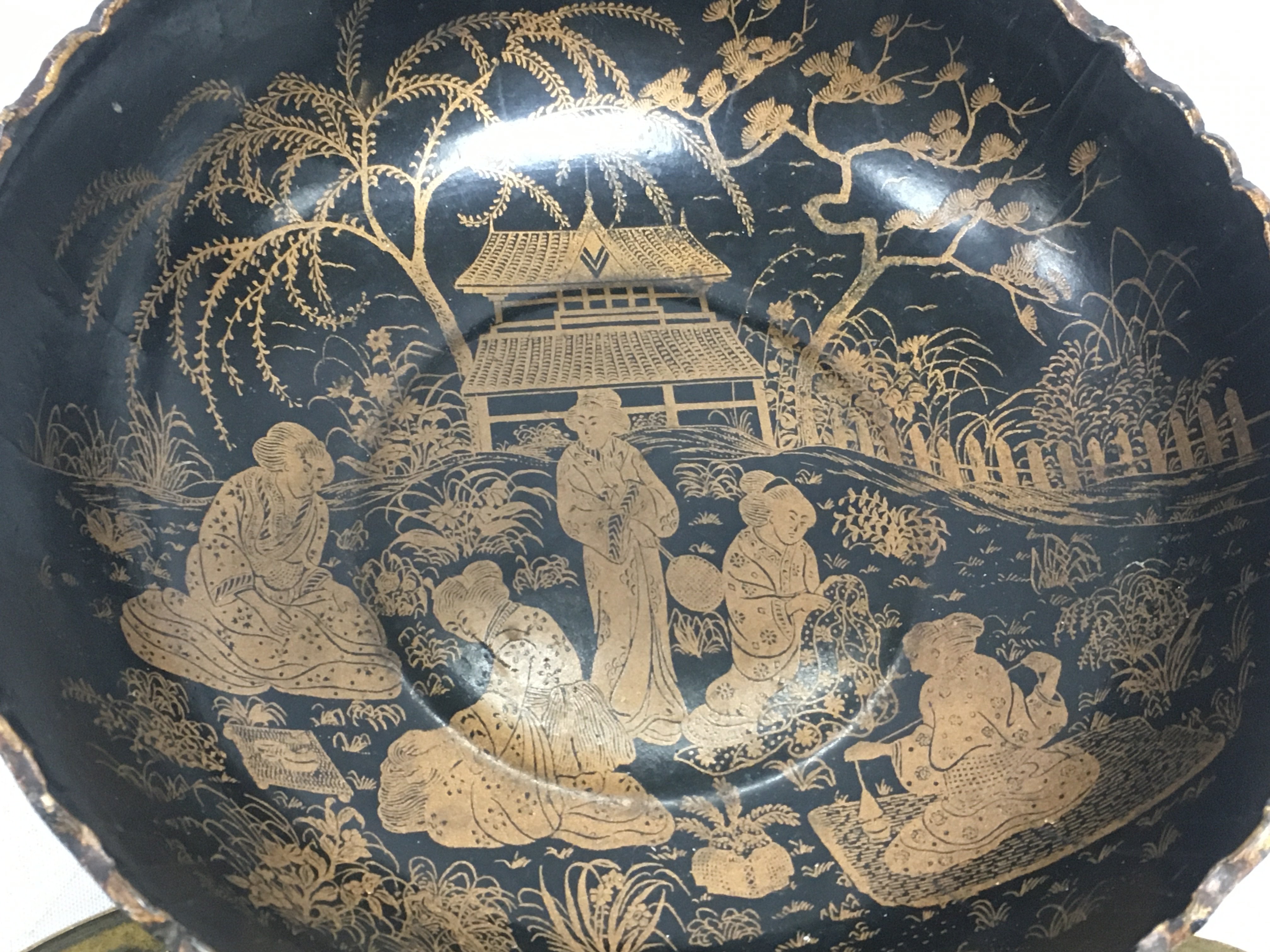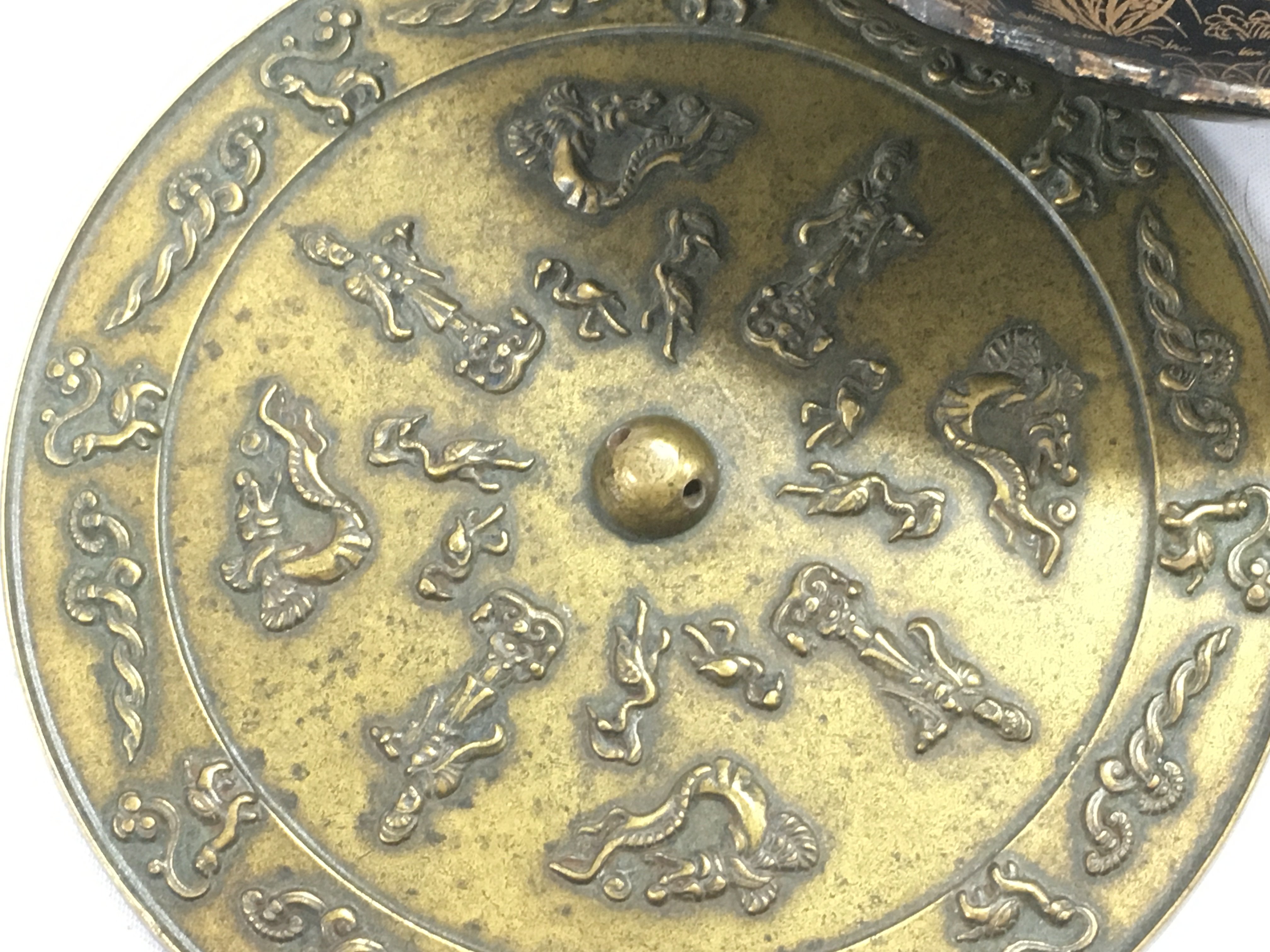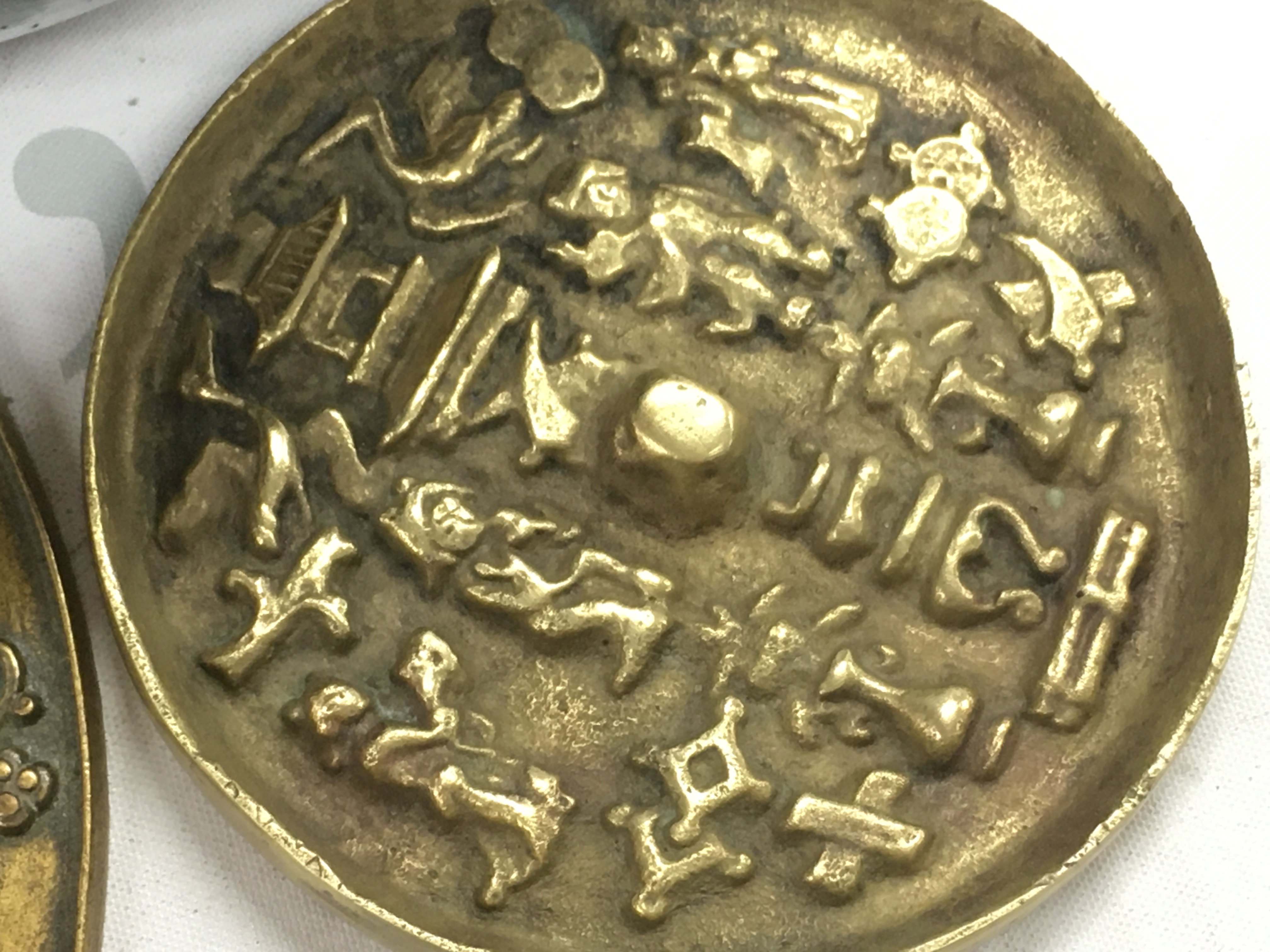 Two Chinese bronze mirrors 17 and 10cm wide and a Japanese bowl 23cm wide. Postage category B