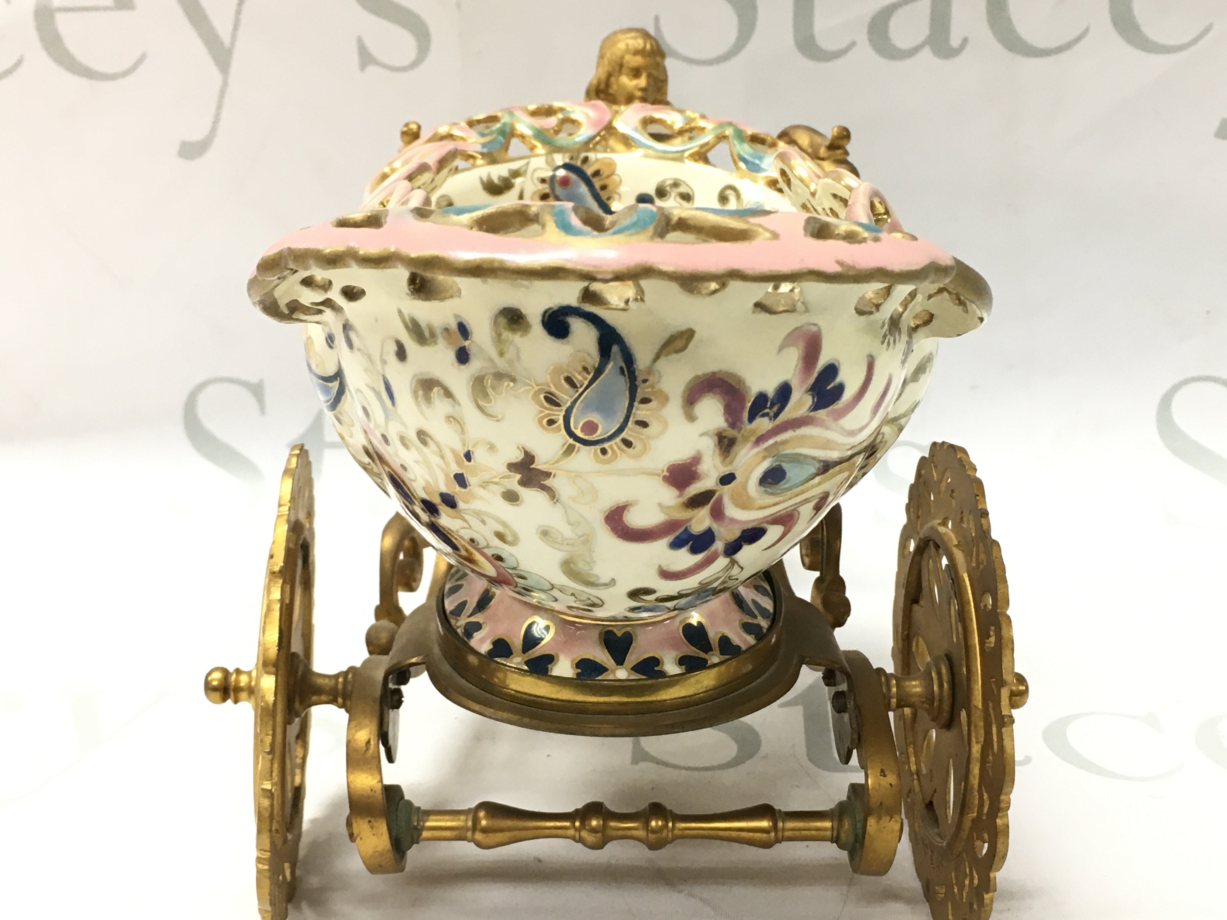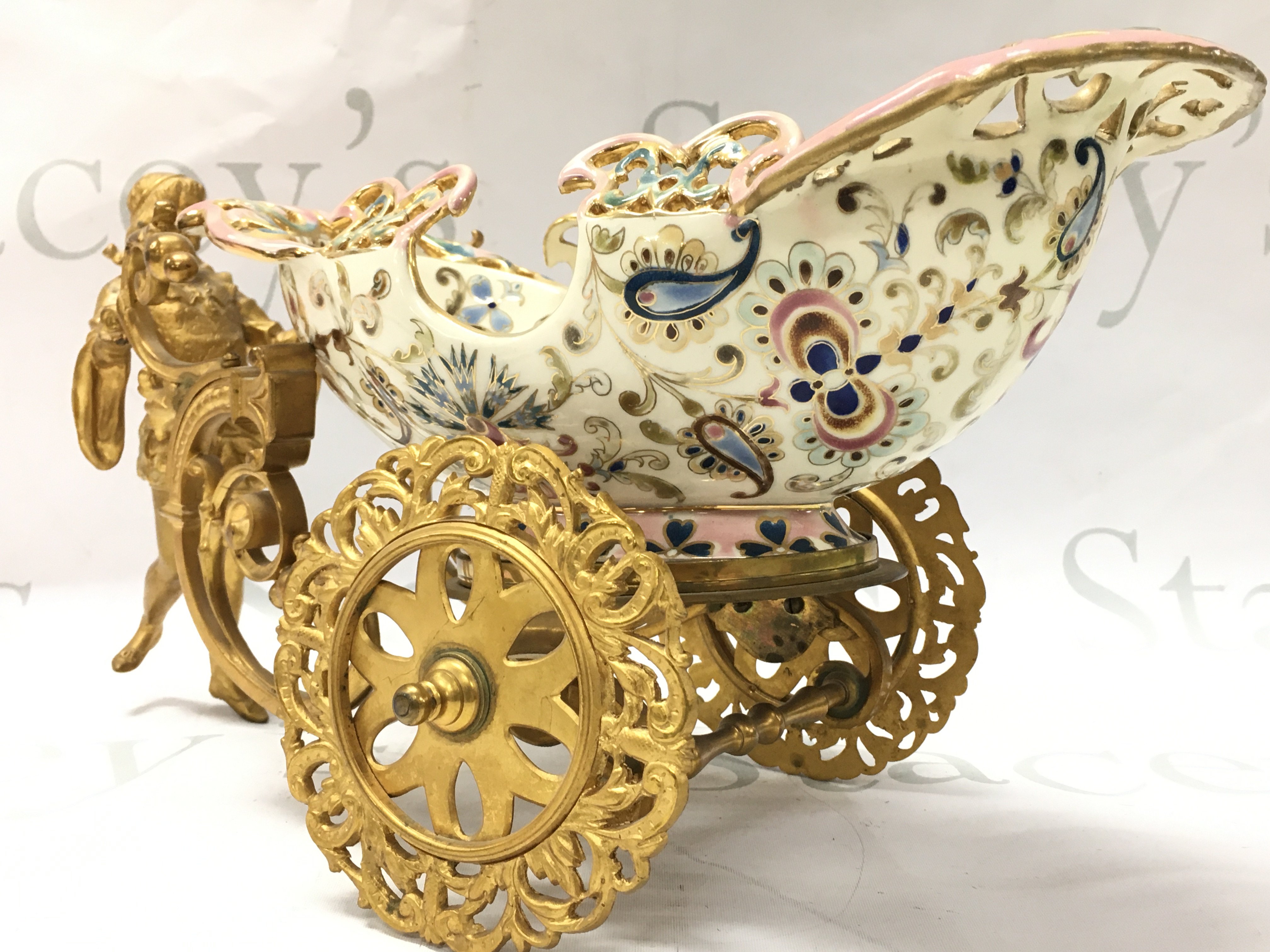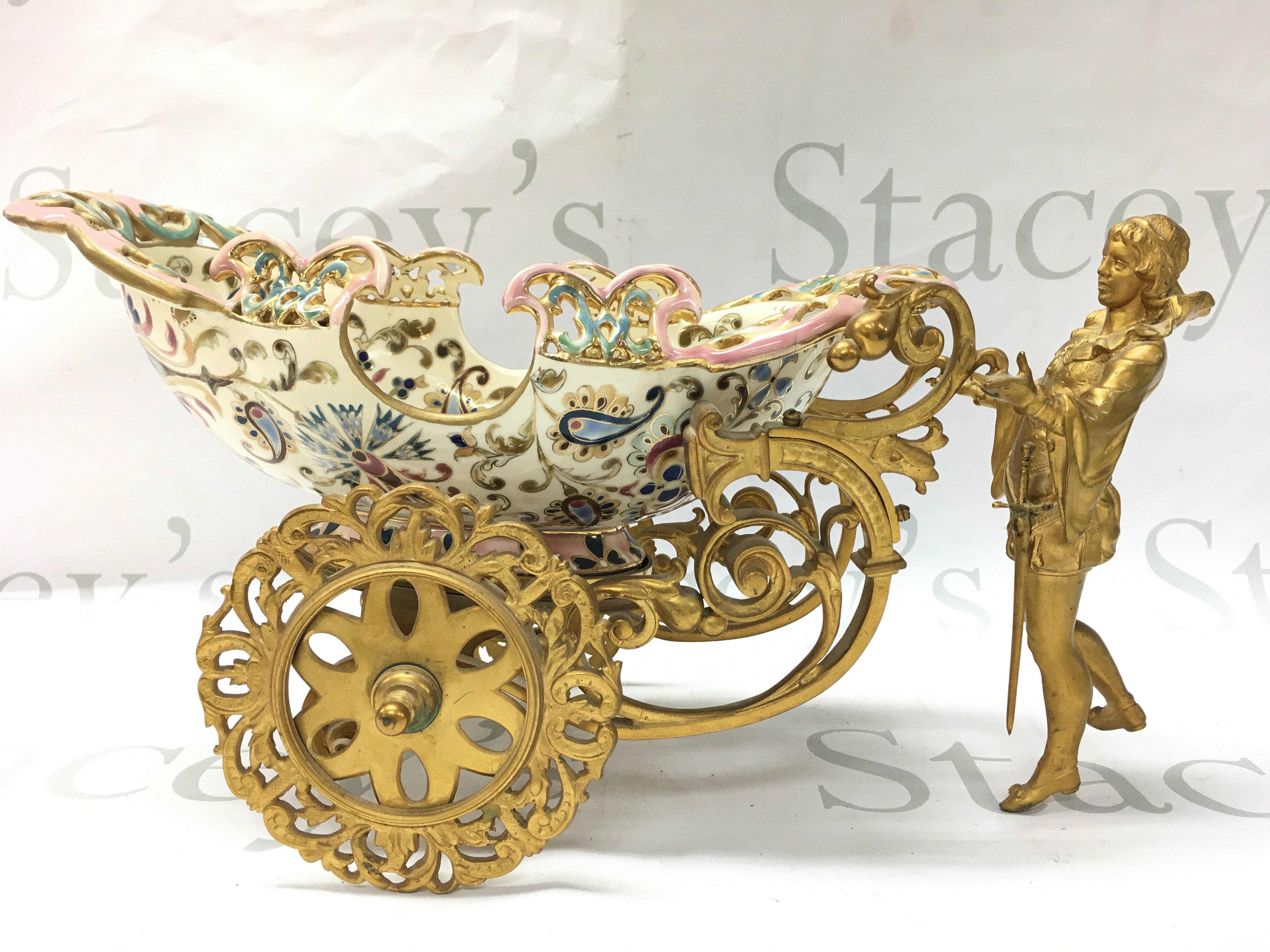 A carriage cachepot centrepiece bowl, gilted figure leading a boat shaped carriage with hand painted and gilted decoration and pierced border. Approximately 18cm tall 35cm long . Stored in a red velvet fitted case . This lot cannot be posted