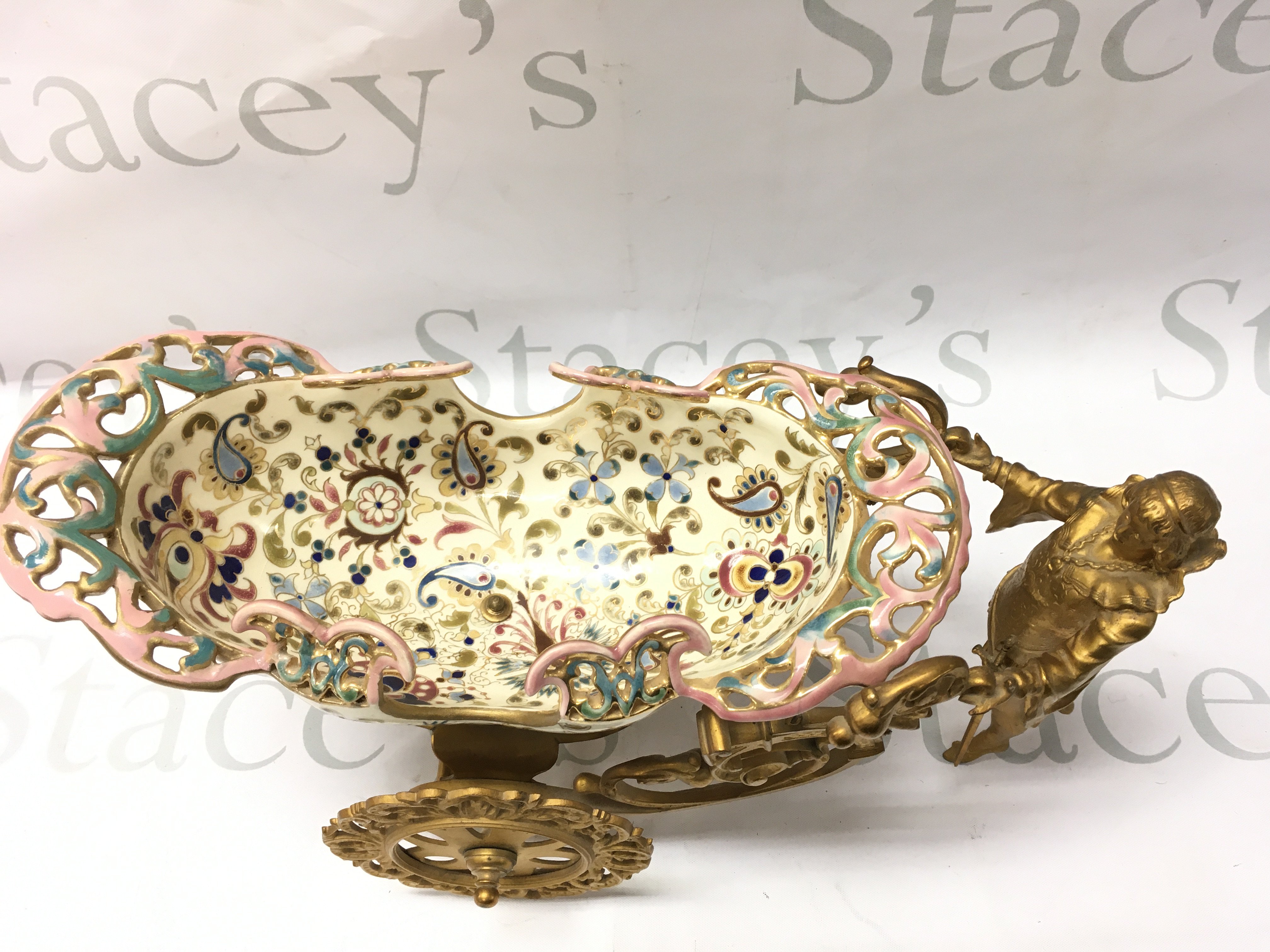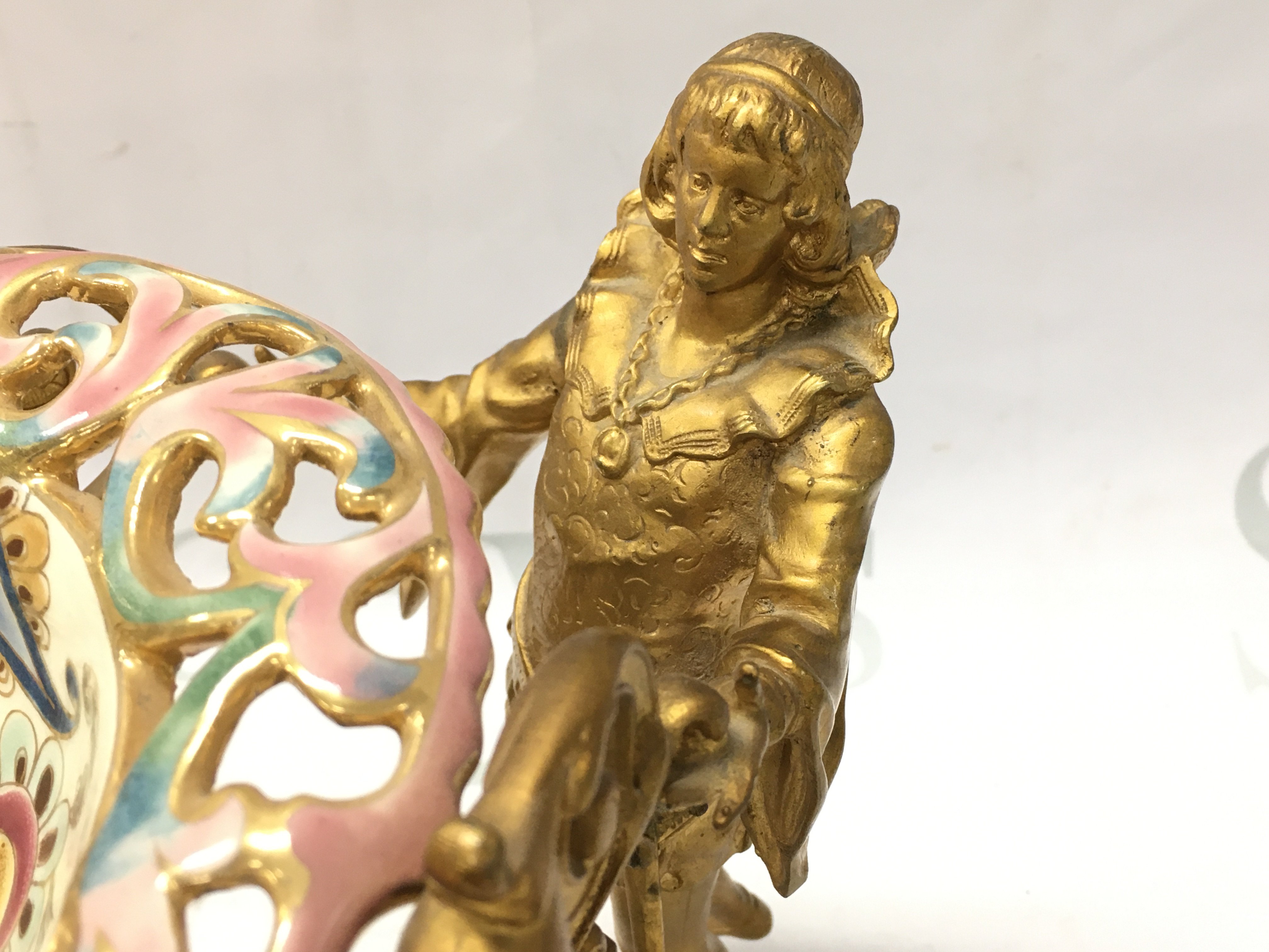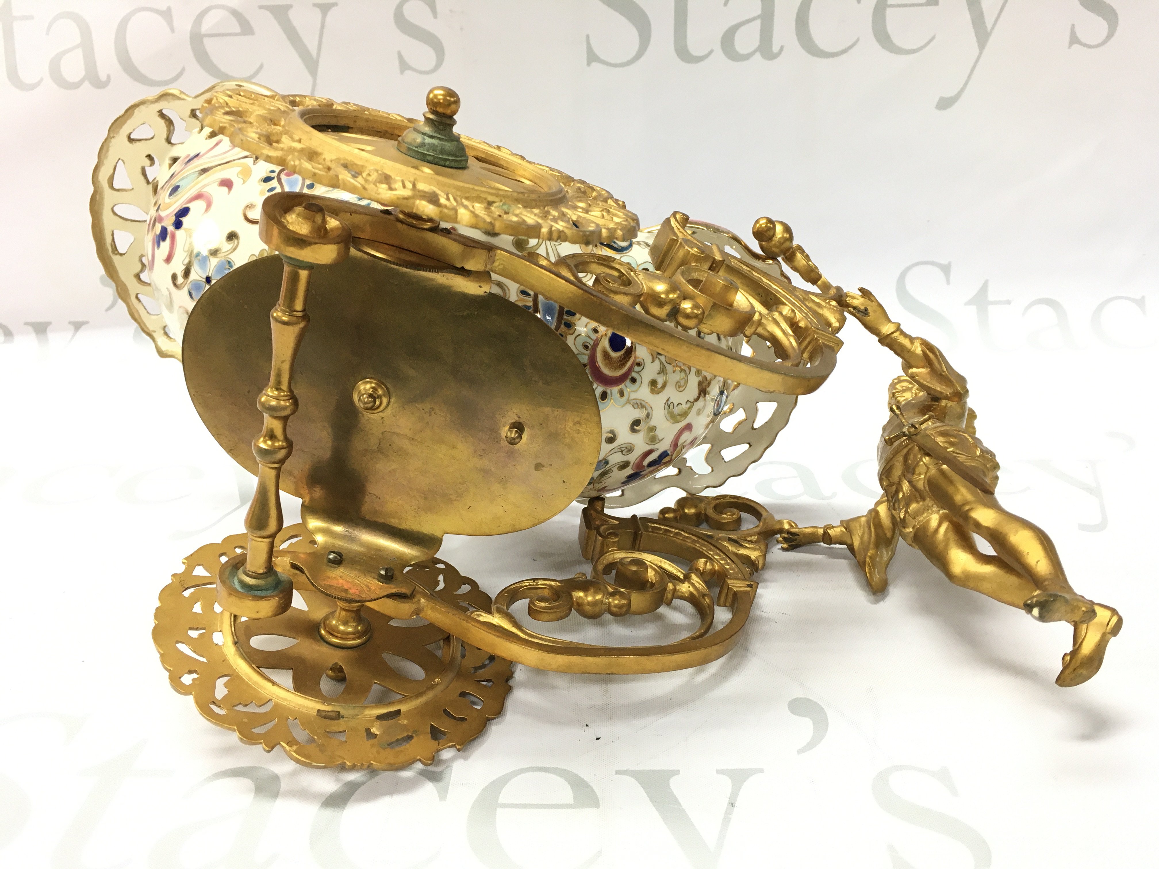 A carriage cachepot centrepiece bowl, gilted figure leading a boat shaped carriage with hand painted and gilted decoration and pierced border. Approximately 18cm tall 35cm long . Stored in a red velvet fitted case . This lot cannot be posted