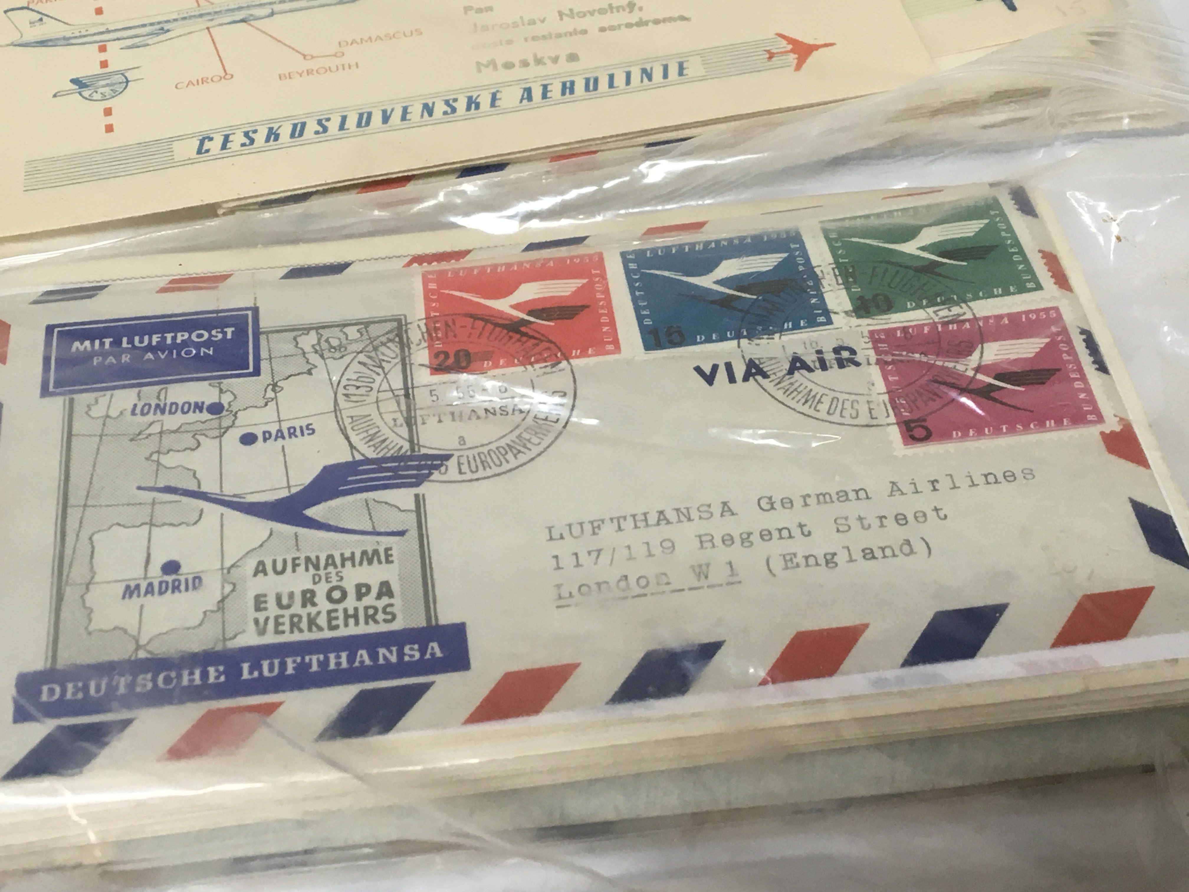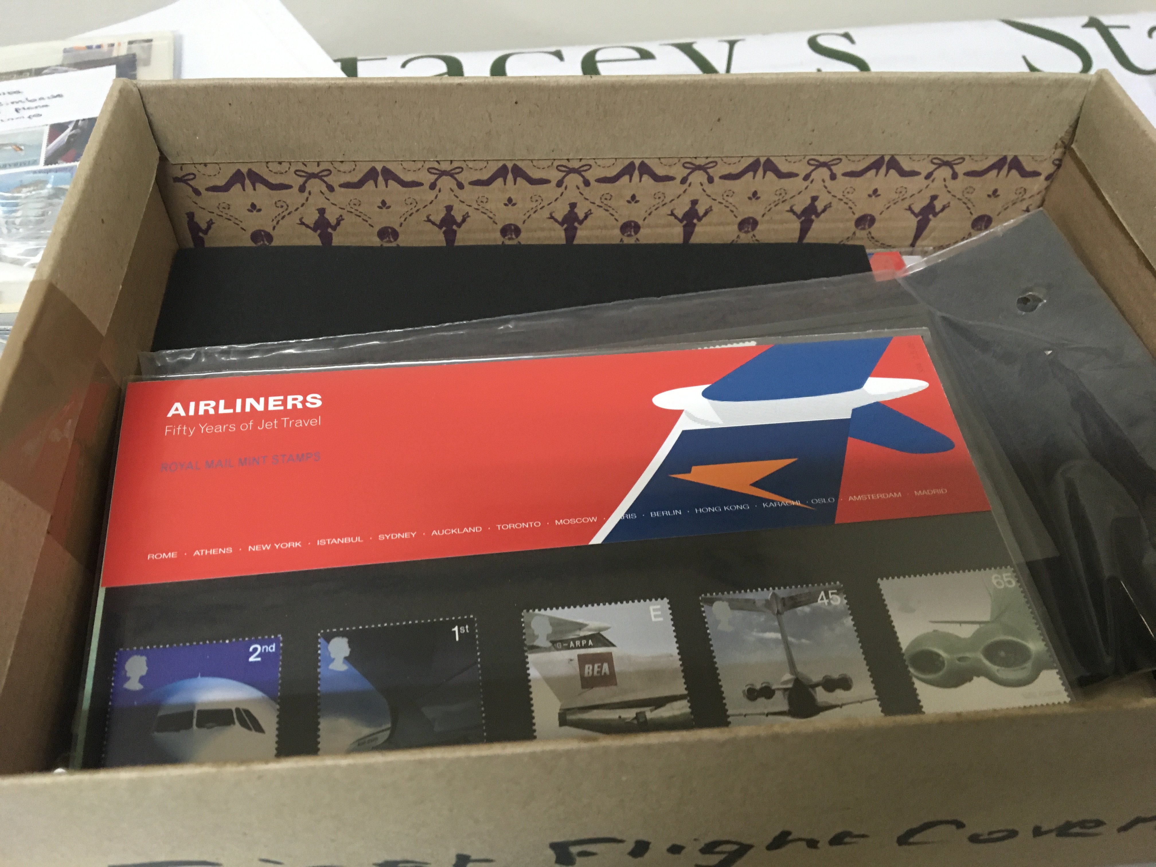 A box containing Aviation First Flight stamp covers aviation presentation stamp packs and other stamps