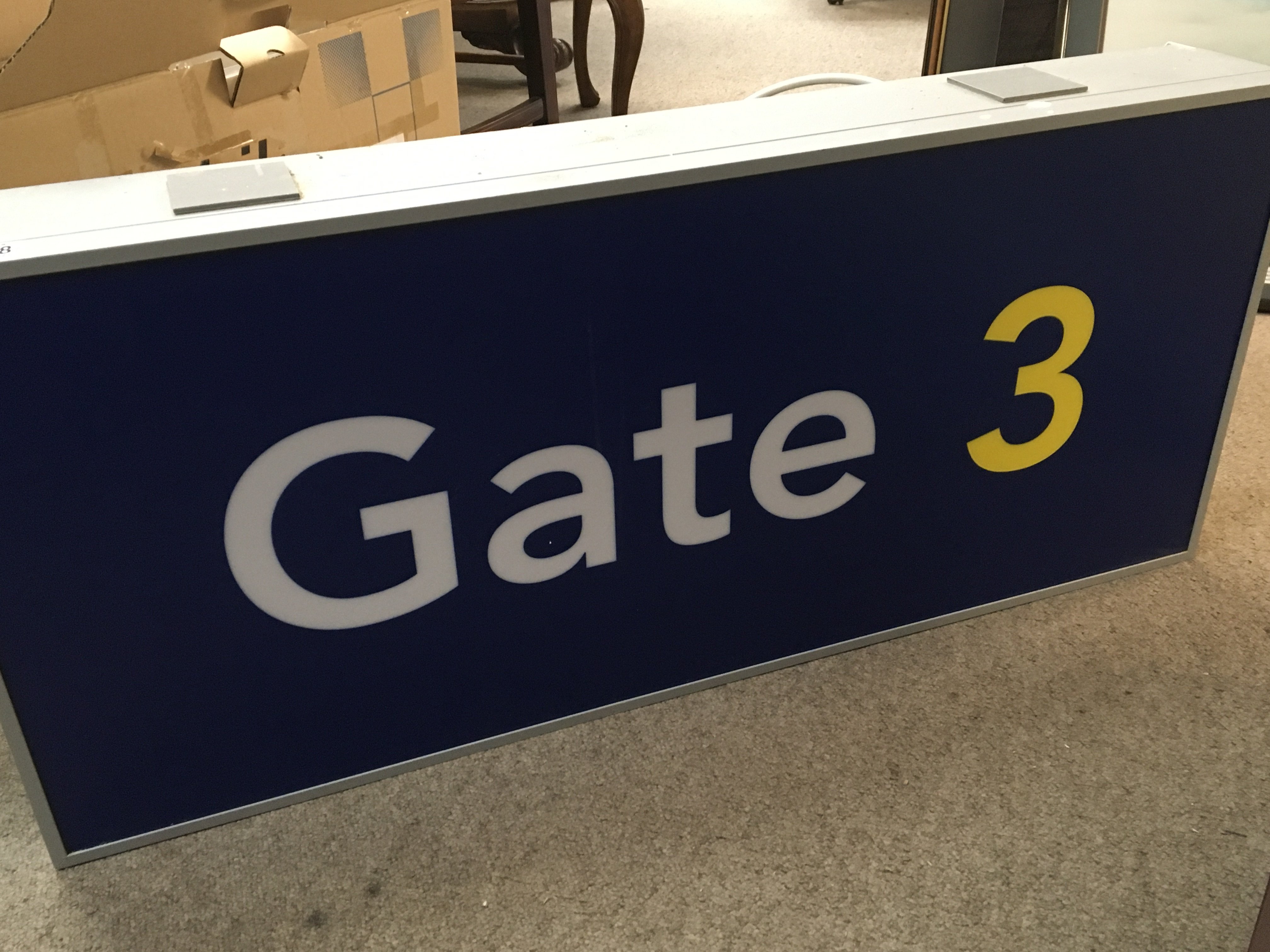 A Vintage illuminating Airport Sign Gate 3 a previous fixture of Southend Airport.