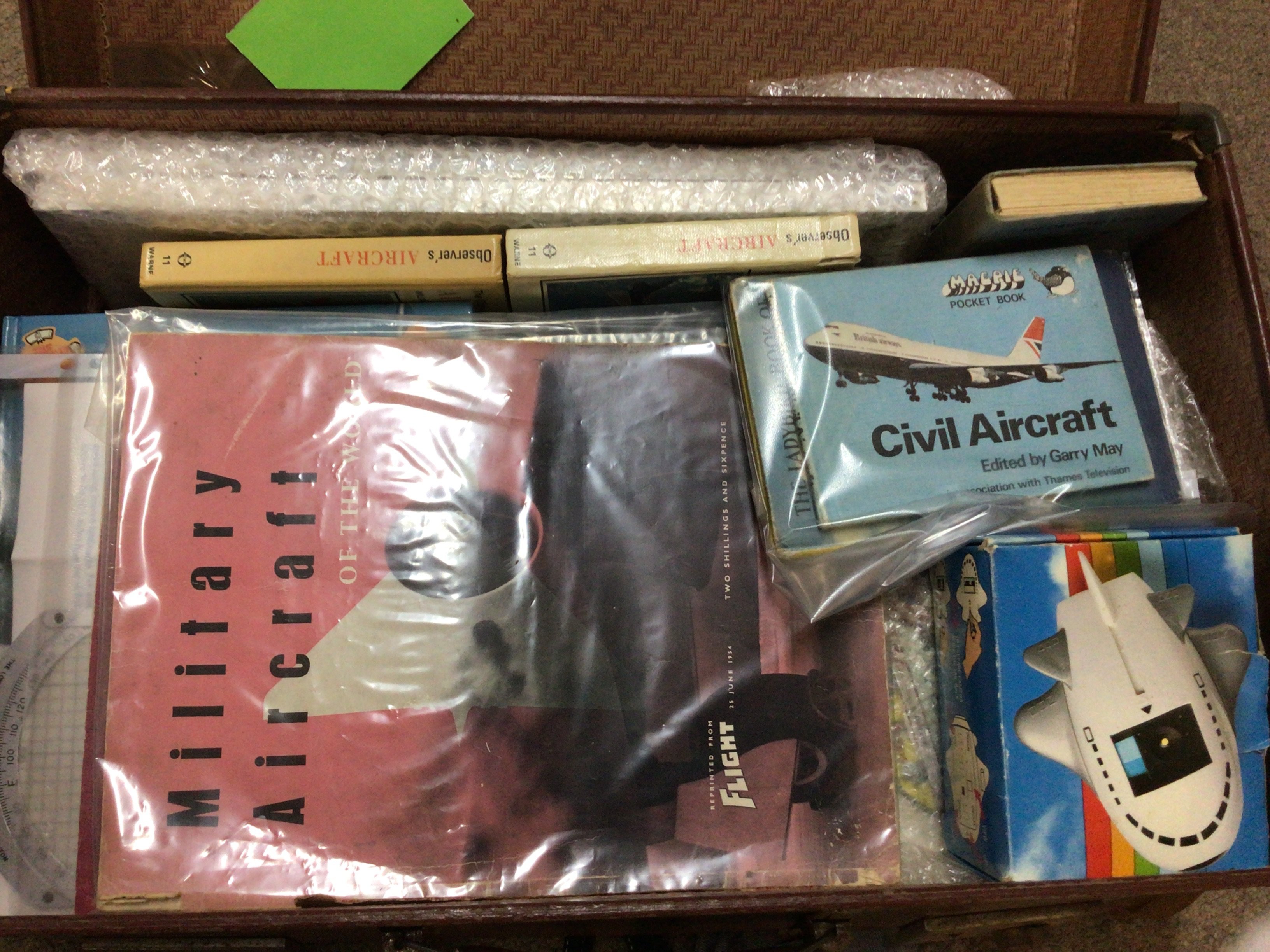 A vintage suite case containing Aircraft memorabilia including early promotional civil aviation brochures coin collection and other related ephemera.