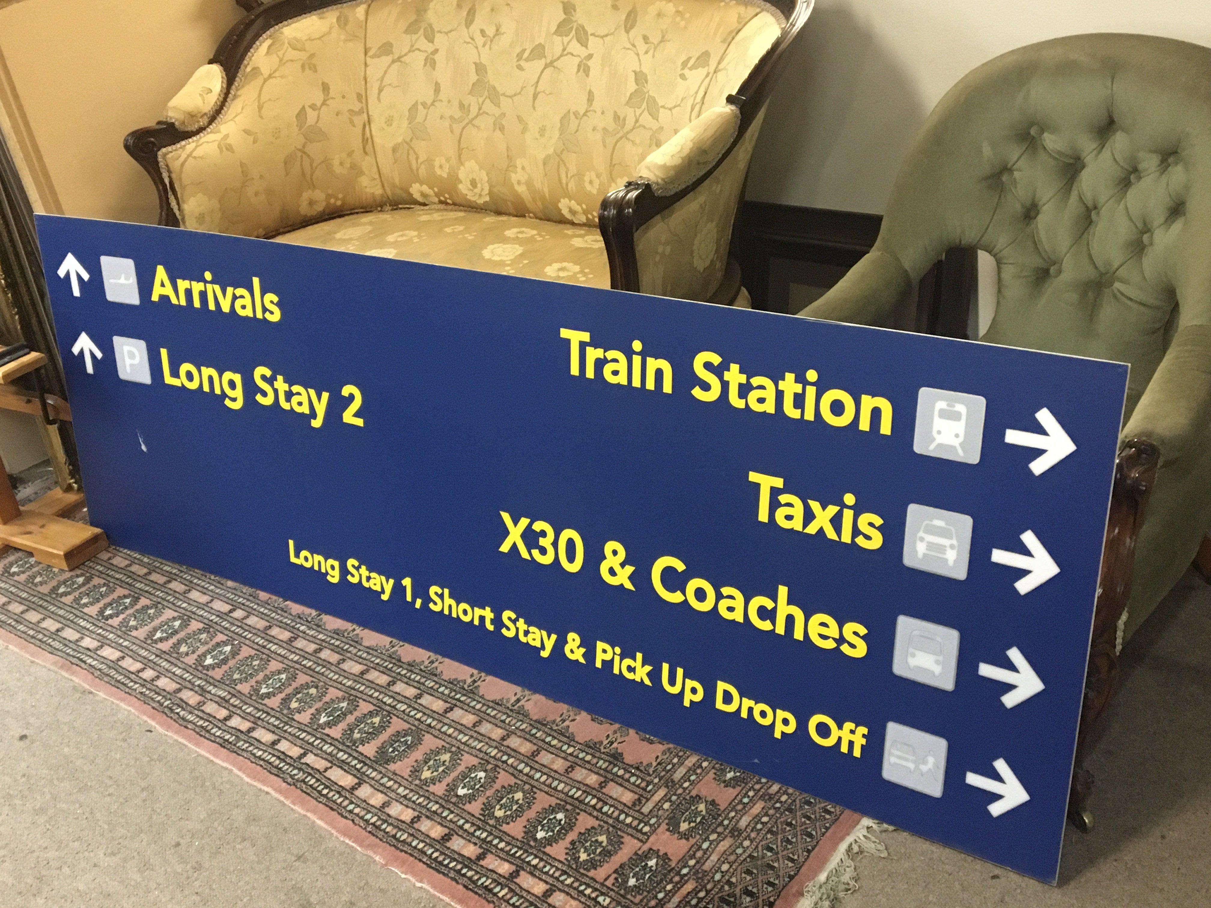 A large Airport information sign white .Perspex type board 182cm x 61cm