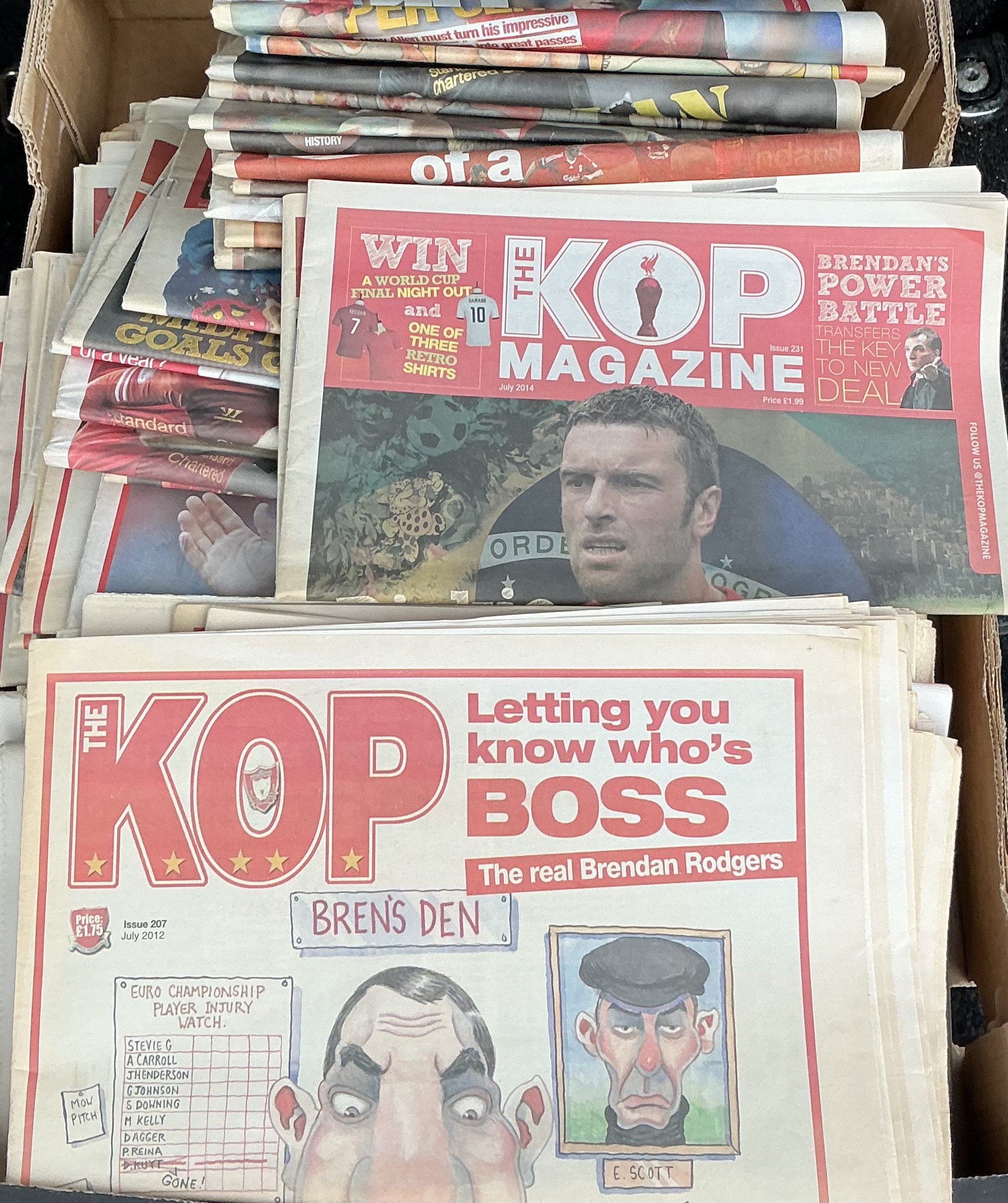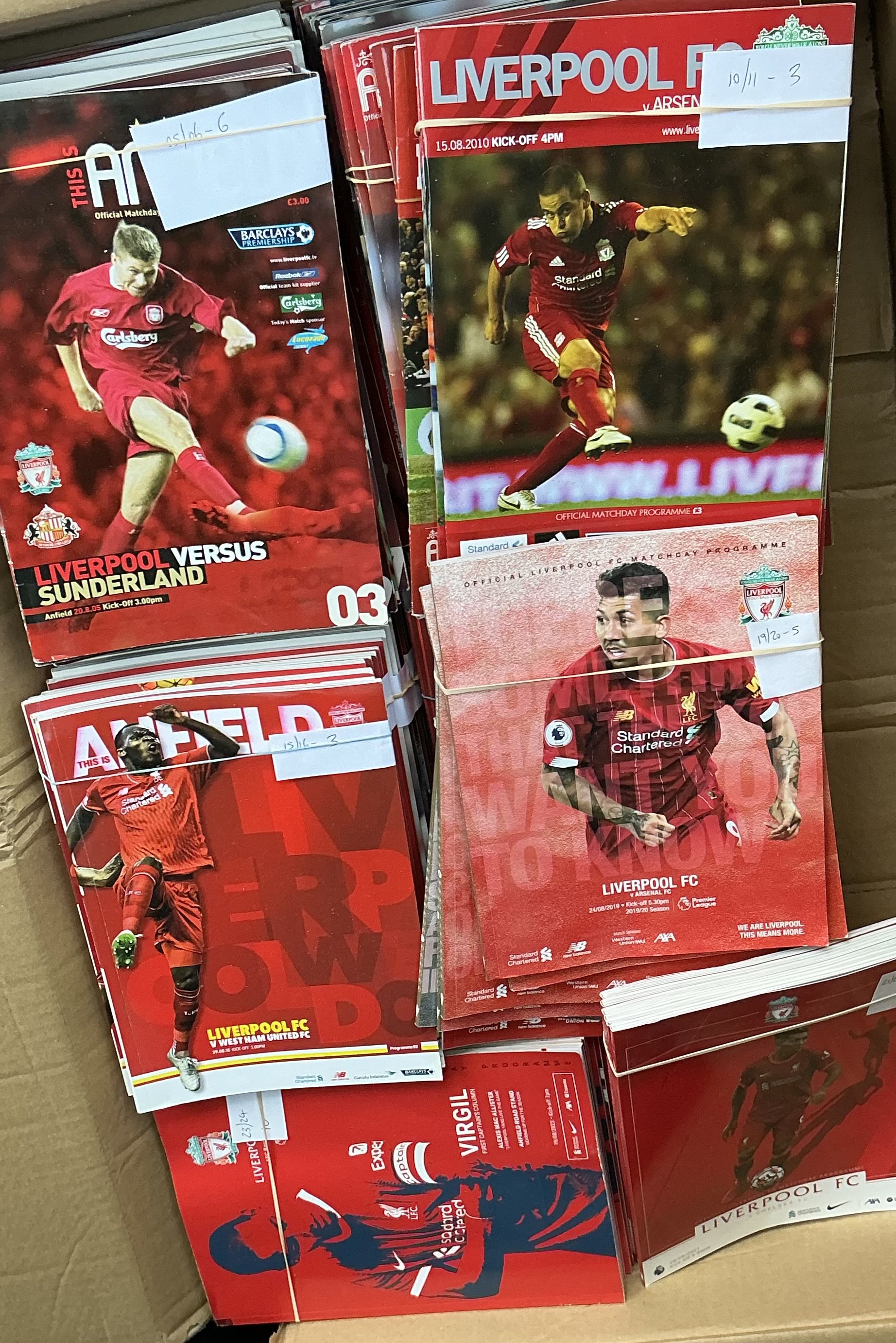 Liverpool Football Programmes + Fanzines: Includes approximately 70 Kop fanzines and over 130 modern home football programmes with no duplication. Instructions to sell. (2 boxes)