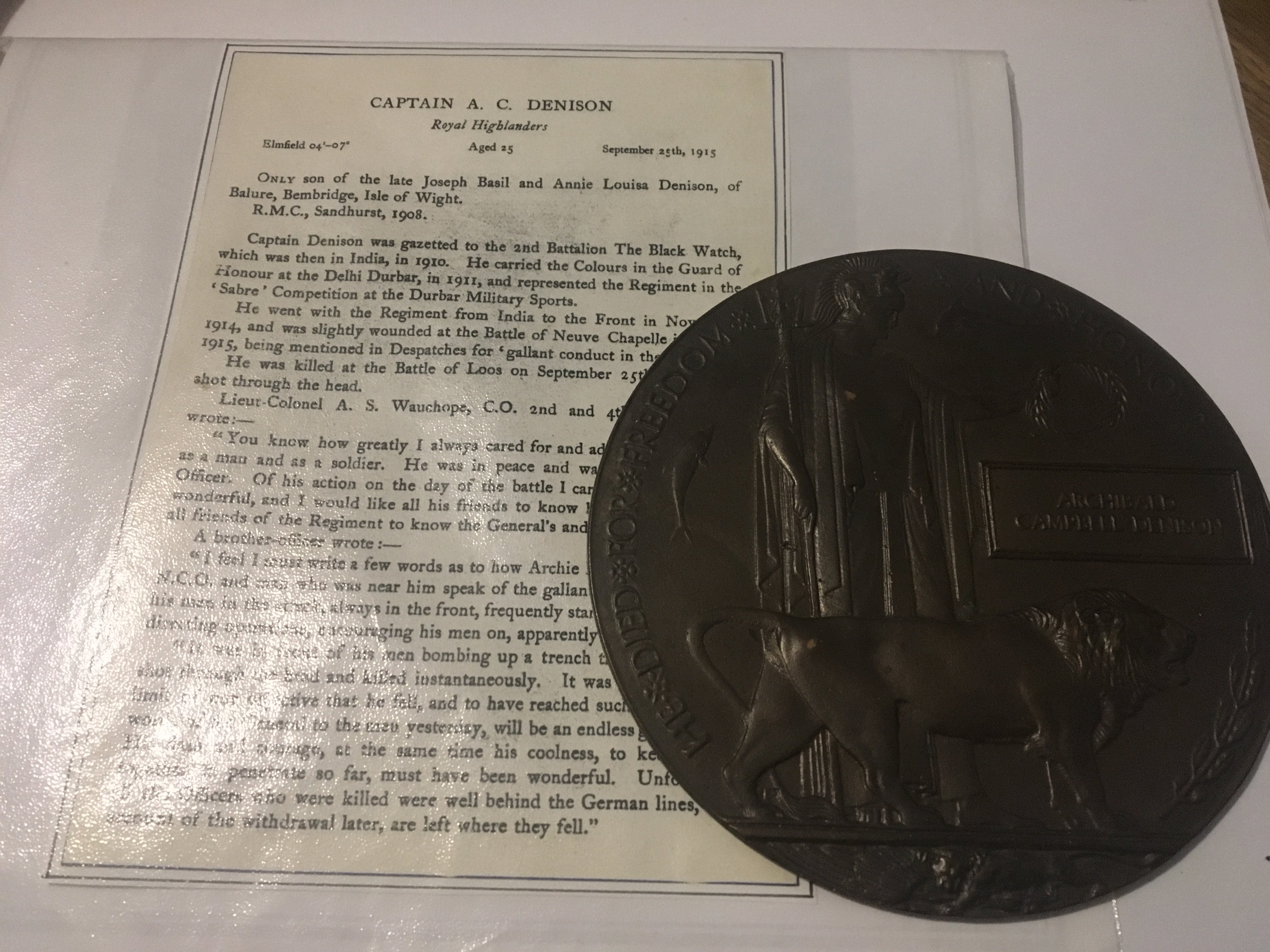 A I World War Memorial plaque Death Penny awarded to Captain A C Denison 2nd Battalion The Black Watch mentioned in dispatches for Gallant conducted in the field Killed at the Battle of Loos 25th September 1915. With detailed paperwork.