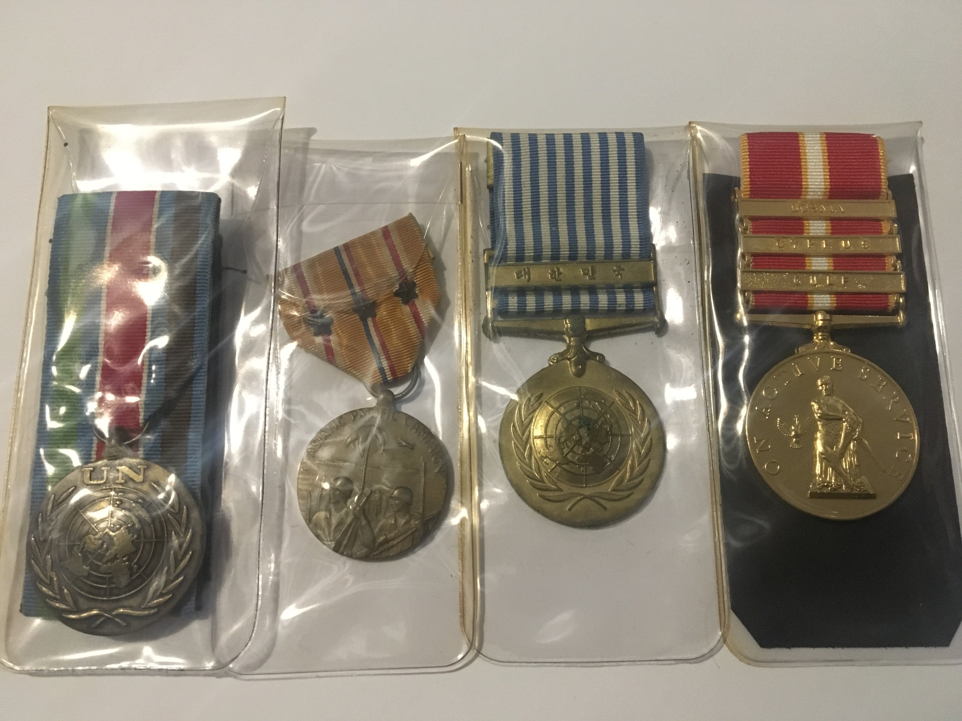 A Collection of medals A United Nations Medal Korea one other UN medal An active service medal three bar Gulf Cyprus Bosnia and an American Pacific Campaign medal three star.