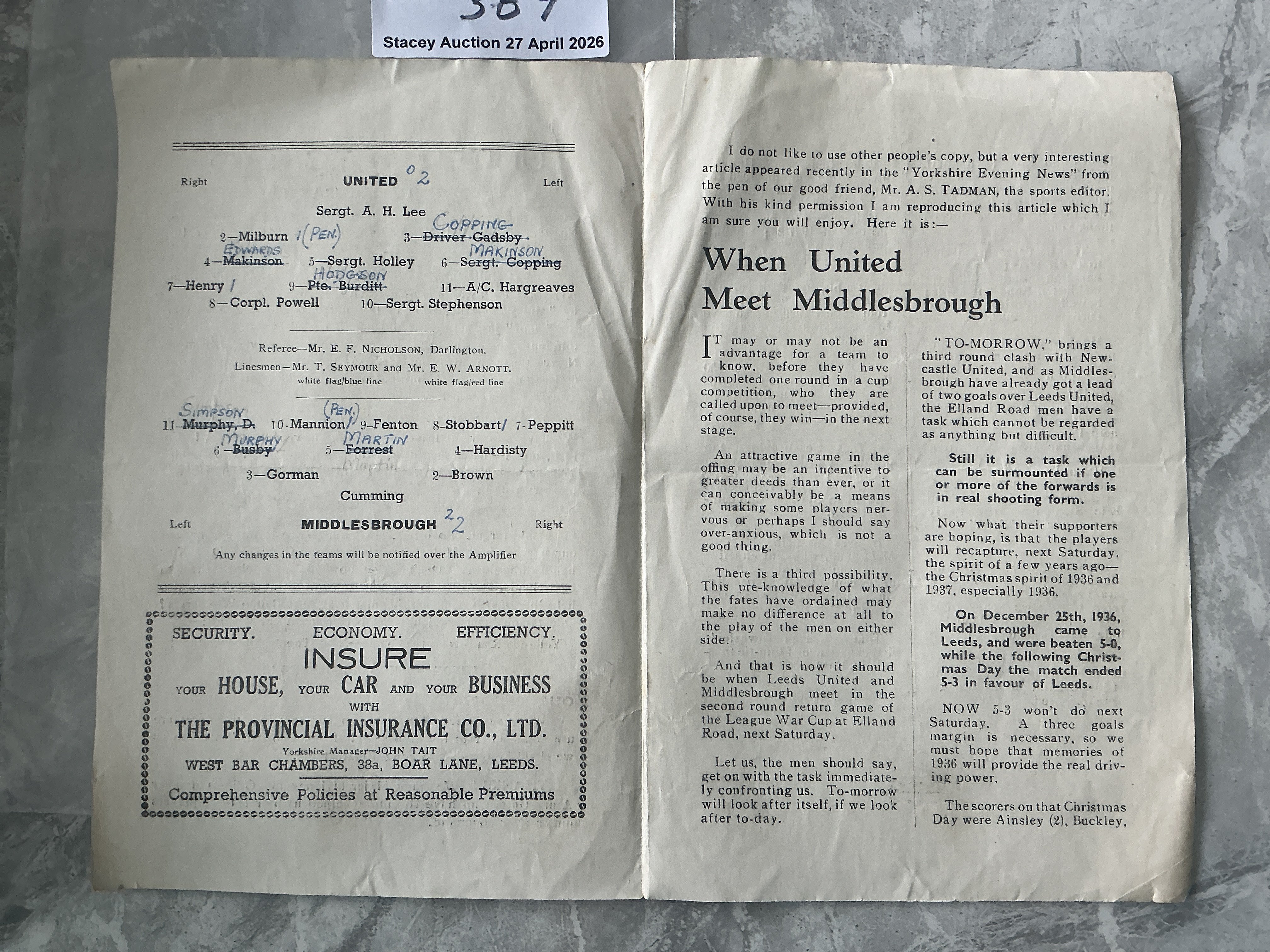 40/41 Leeds United v Middlesbrough Football Programme: Hard to obtain 4 pager with team changes and light creasing. Dated 15 3 1941.