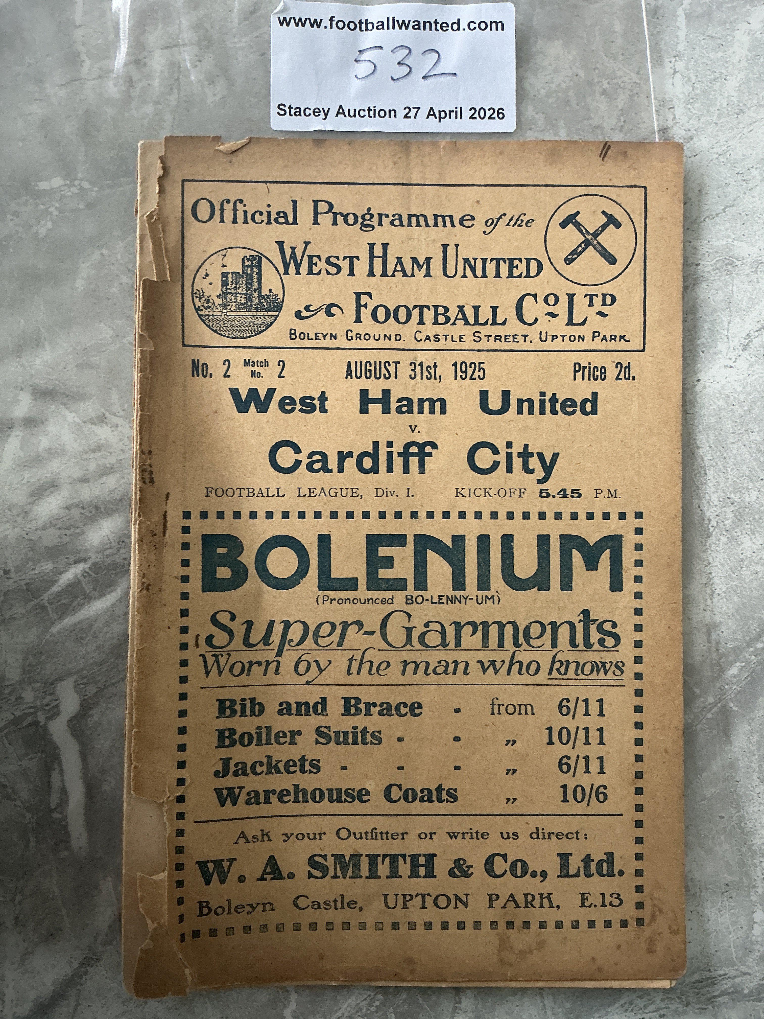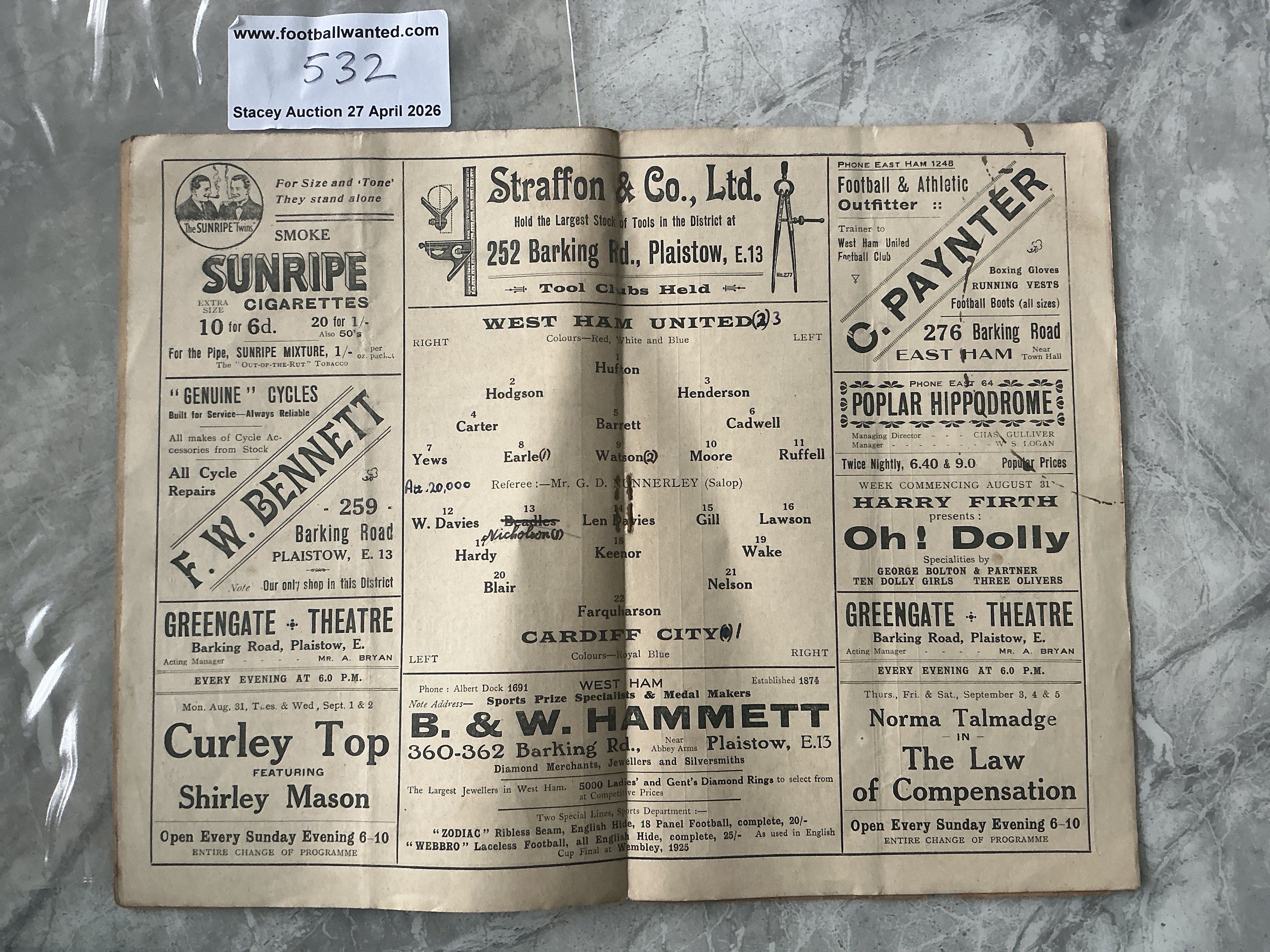 1925 - 1926 West Ham v Cardiff City Football Programme: A few months away from being 100 years old. The spine is completely split with minor paper loss. Writing to team page. Nice advert inside for Charlie Paynters sports shop.