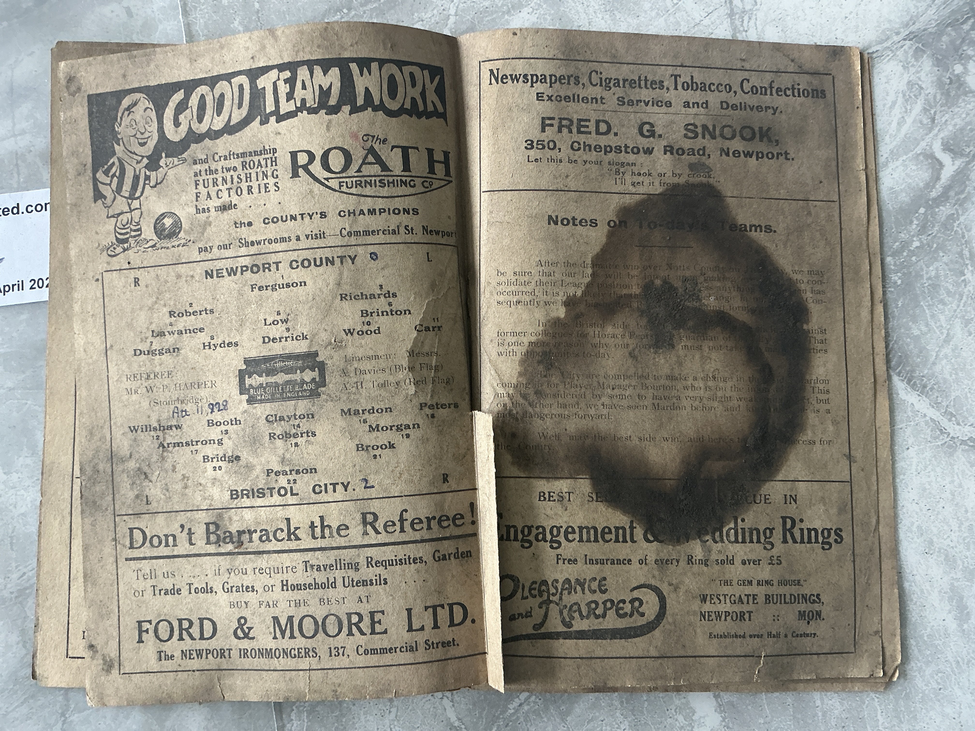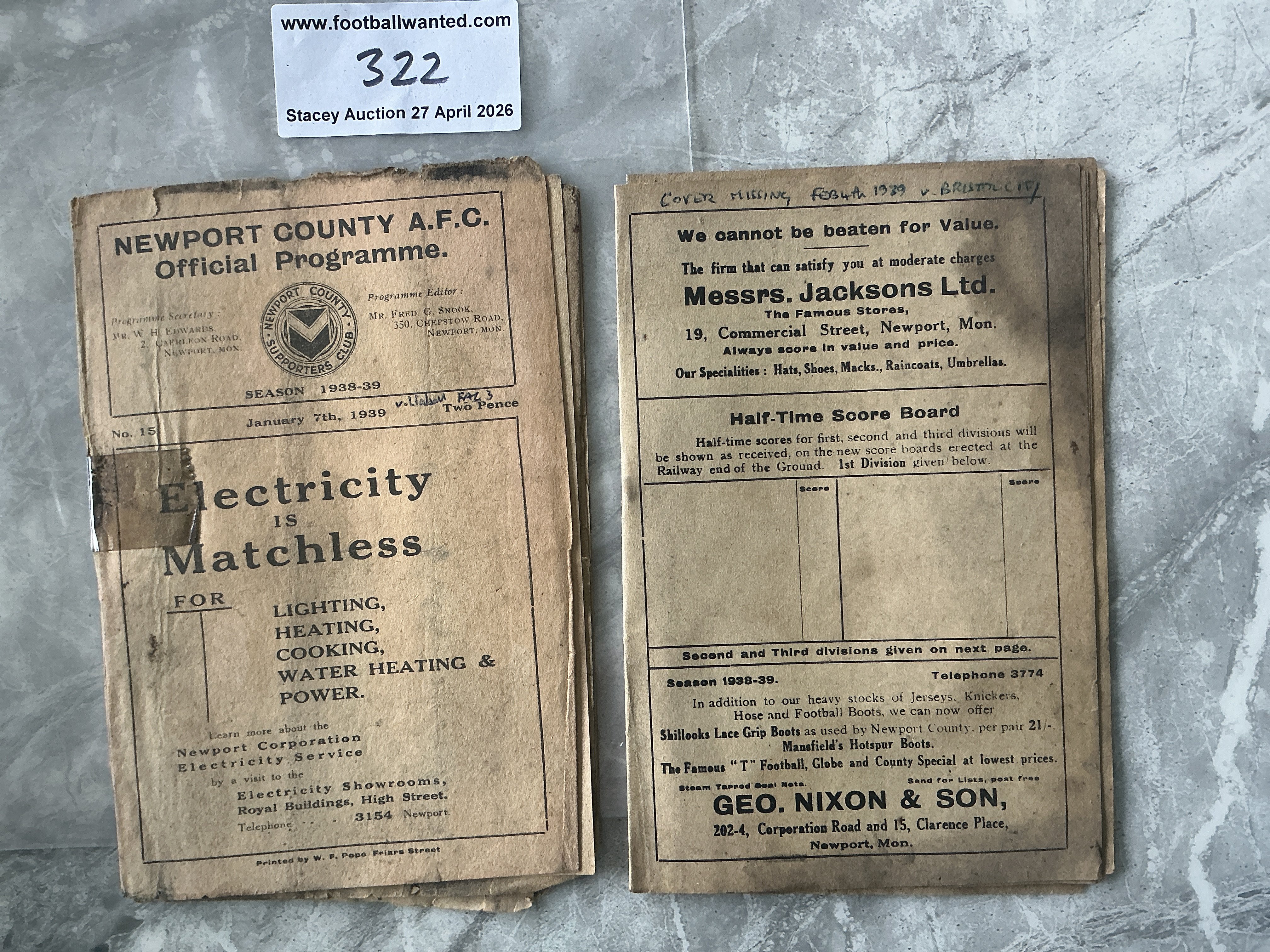 38/39 Newport County Home Football Programmes: Very poor condition programmes with heavy staining throughout. Walsall FA Cup has no centre pages and Bristol City has no covers. Instructions to sell. (2)