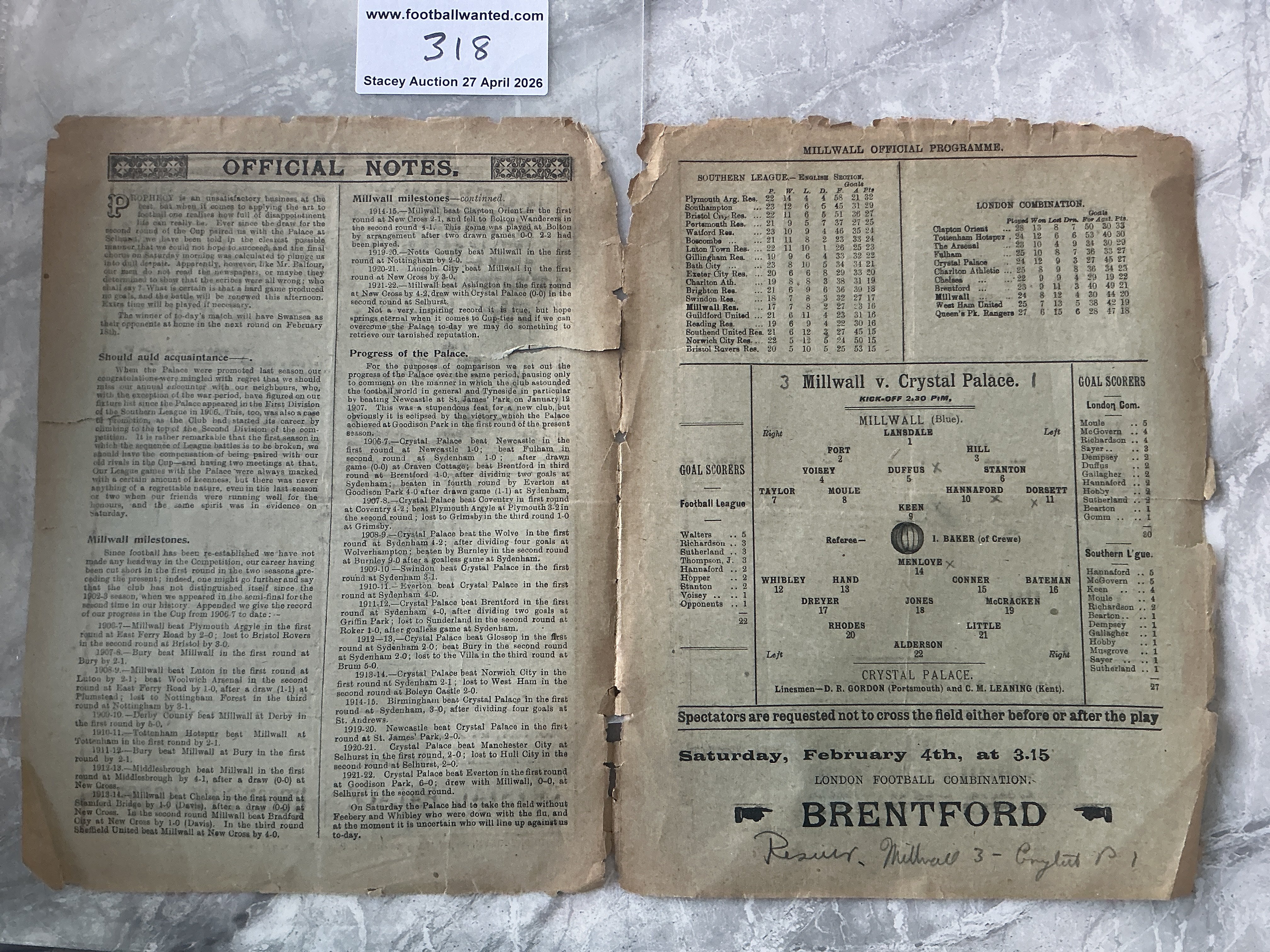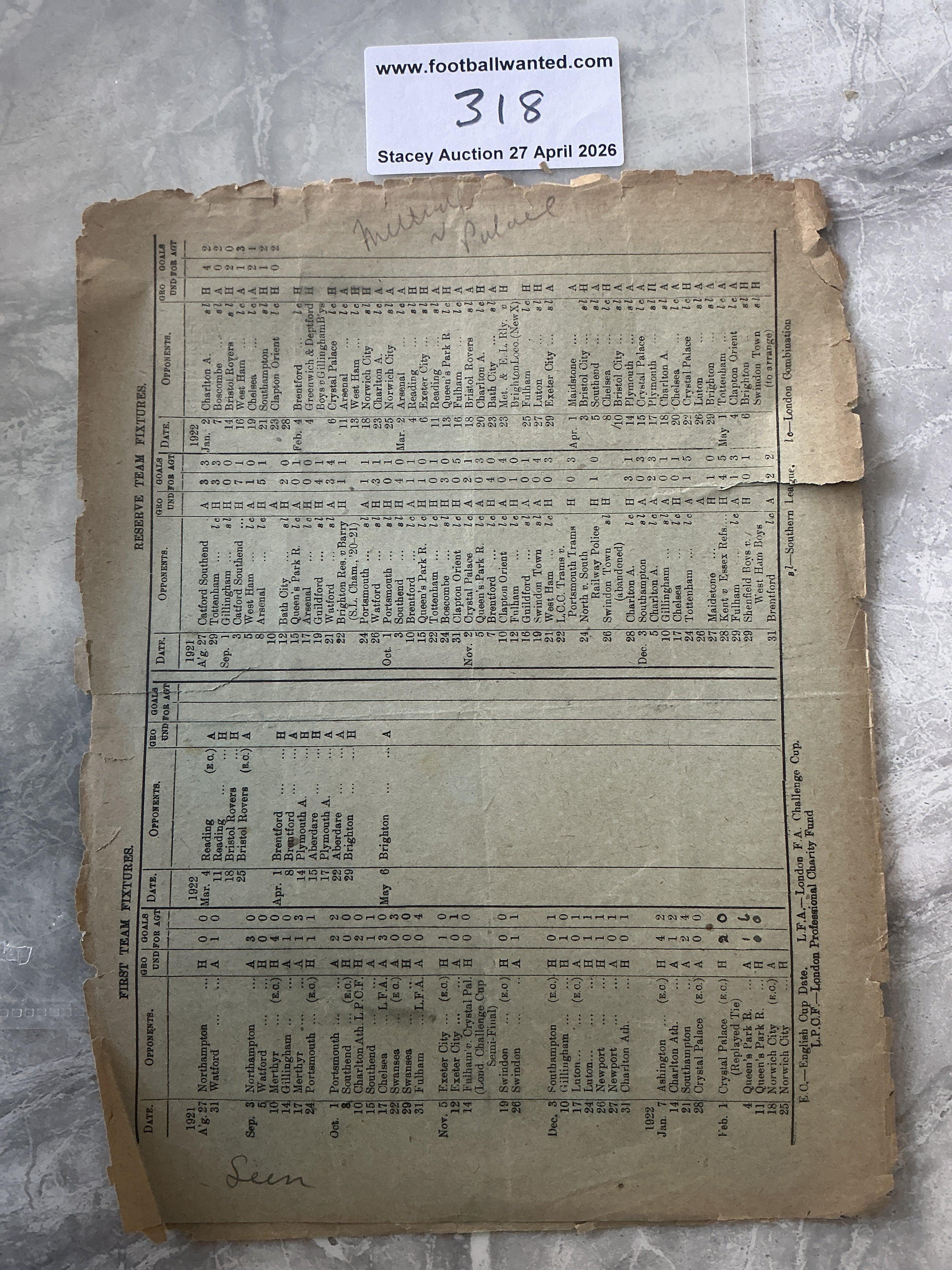 1921 - 1922 Millwall v Crystal Palace Football Programme: Poor condition 4 page FA Cup replay programme with score and scorers noted inside. Tatty edges with tears and a worn spine.