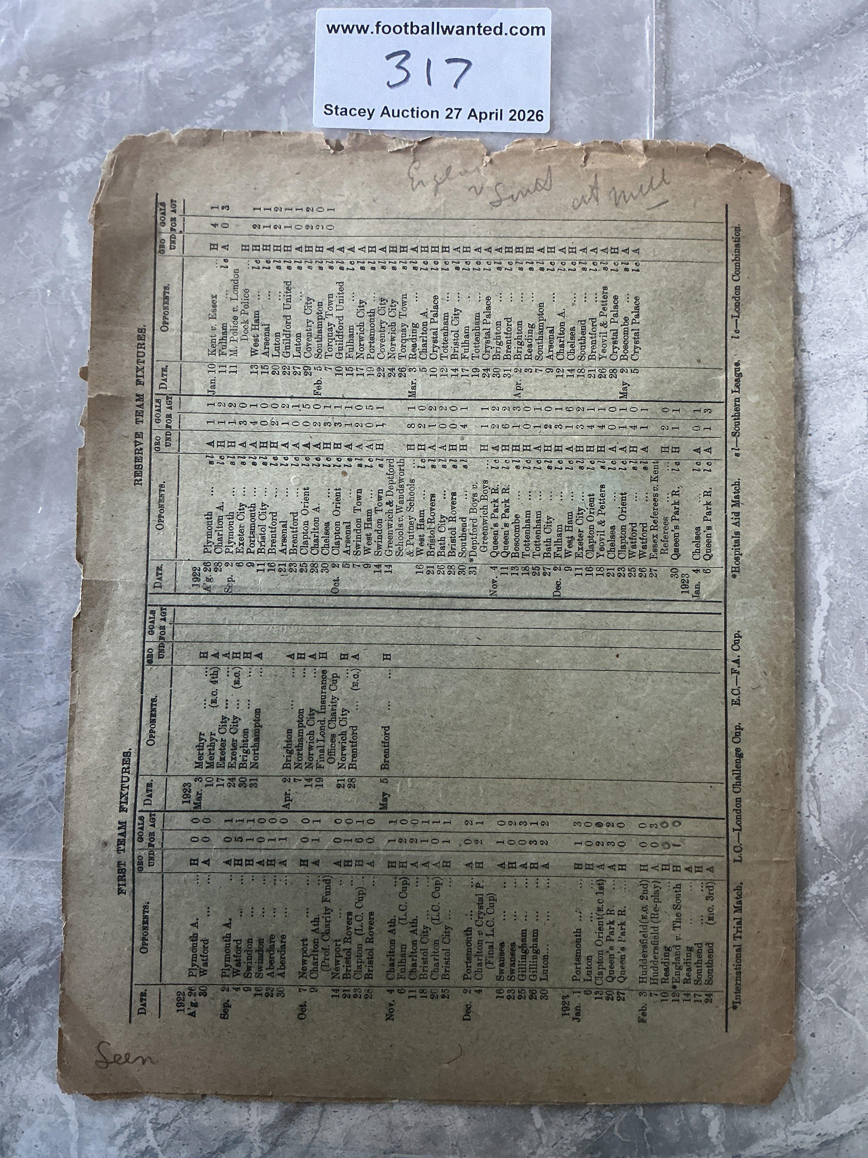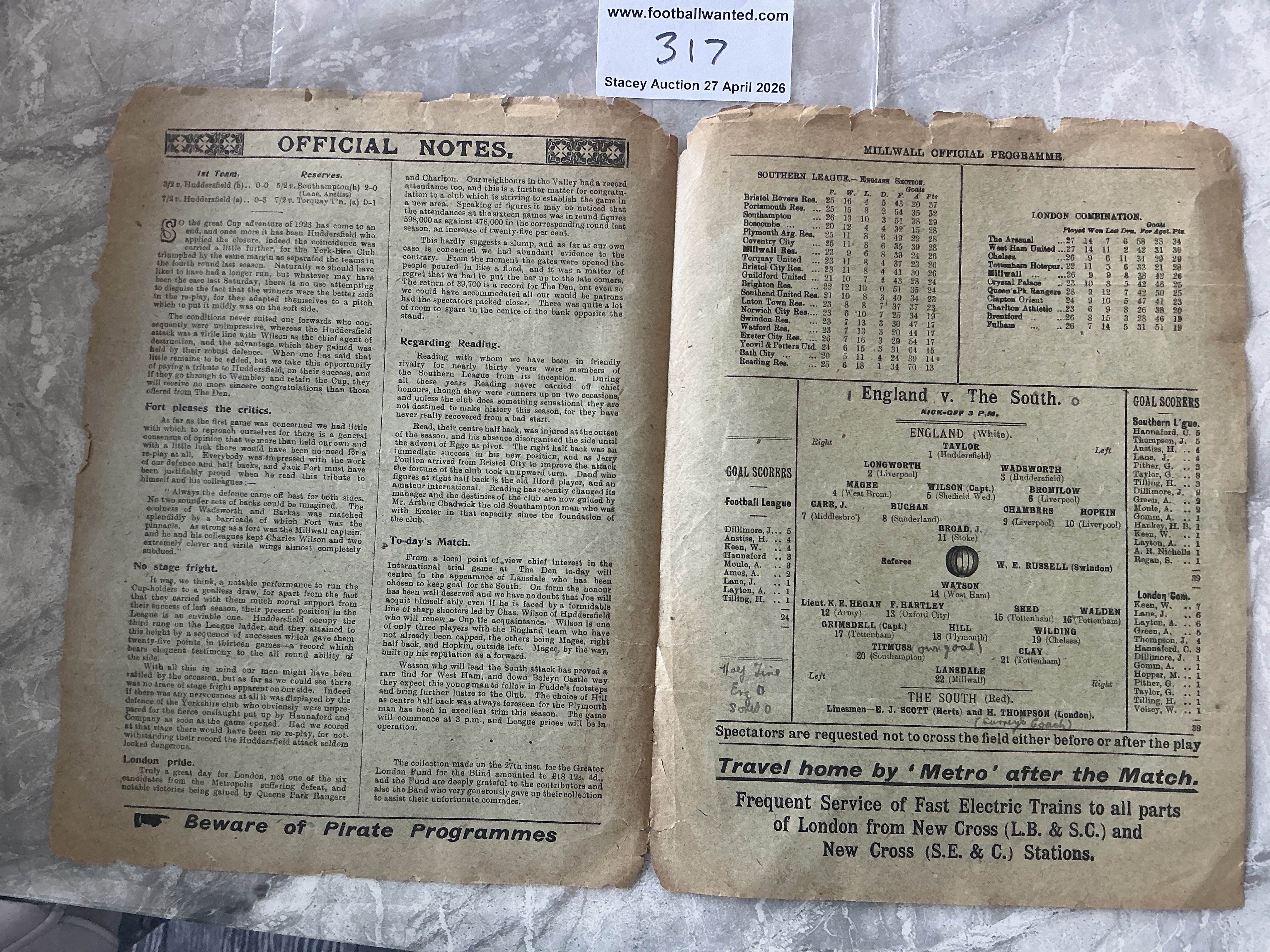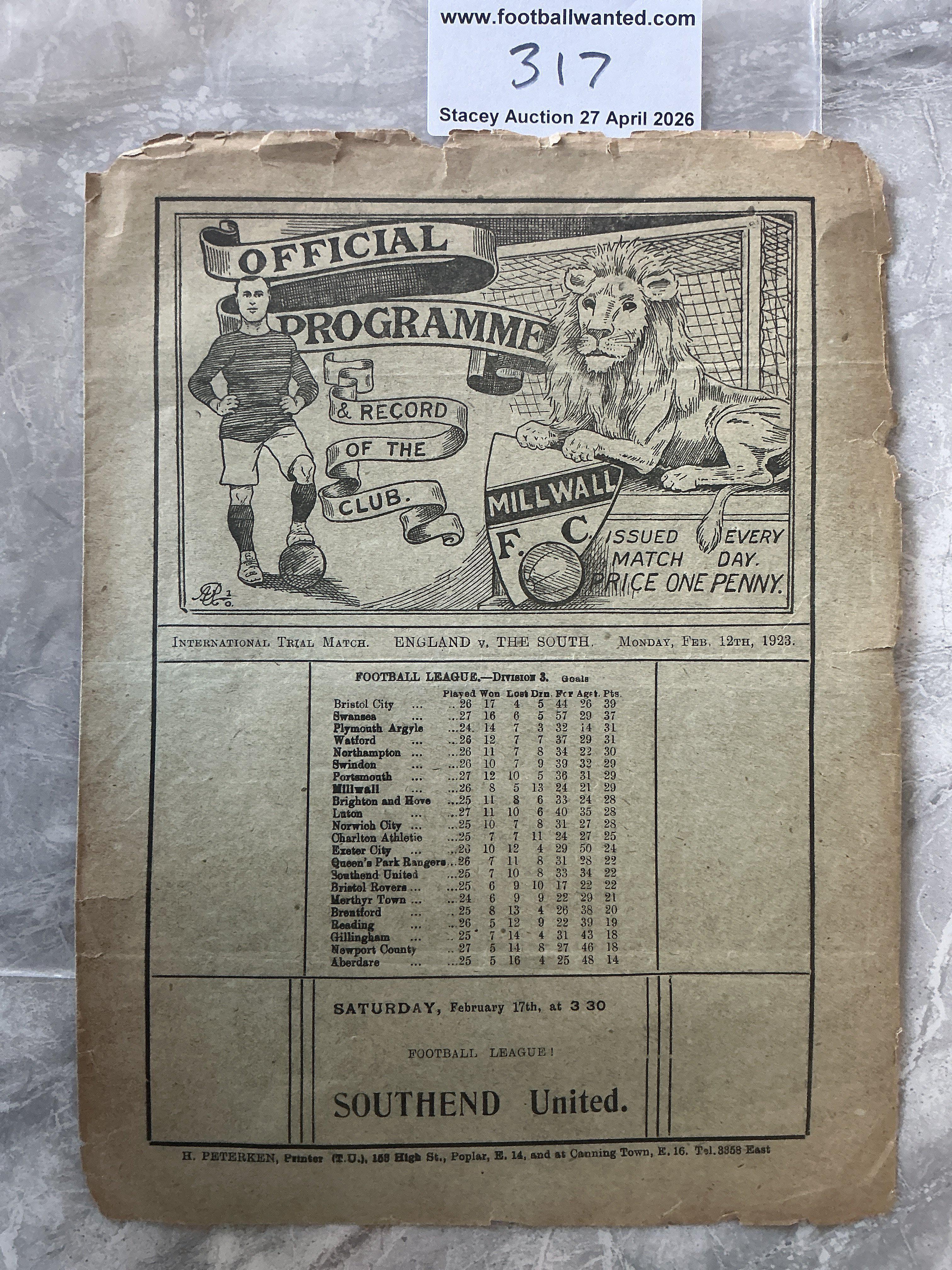 1922 - 1923 England v The South Football Programme: Played at Millwall on 12 2 1923. Fair condition 4 page trial match programme with score and scorers noted inside. Tatty edges.
