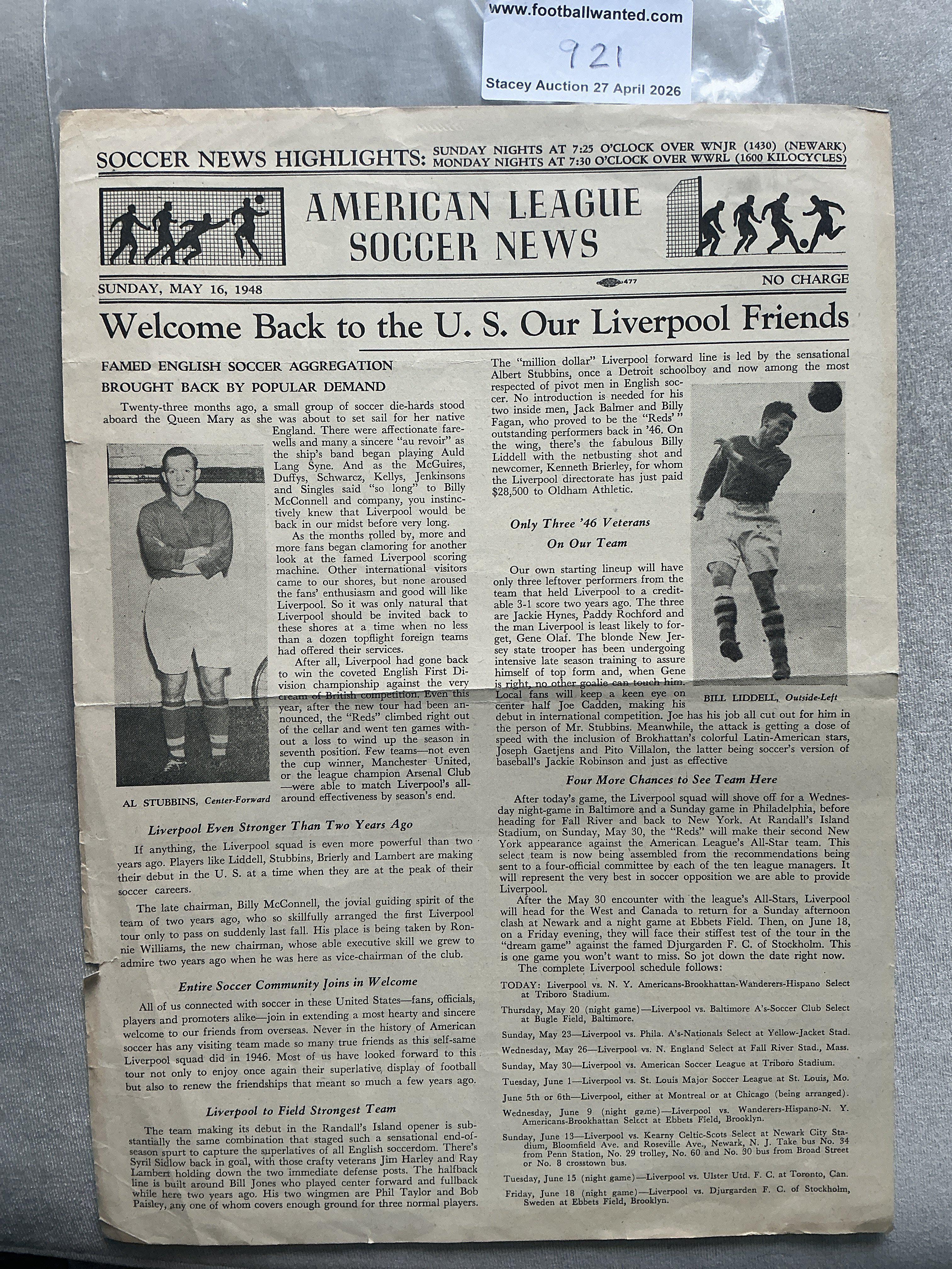 1948 New York Americans v Liverpool Football Programme: Large double sided page with fold headed American League Soccer News dated May 16 1948. Believed to be given free on entry to match. Good with tiny tear to edge.