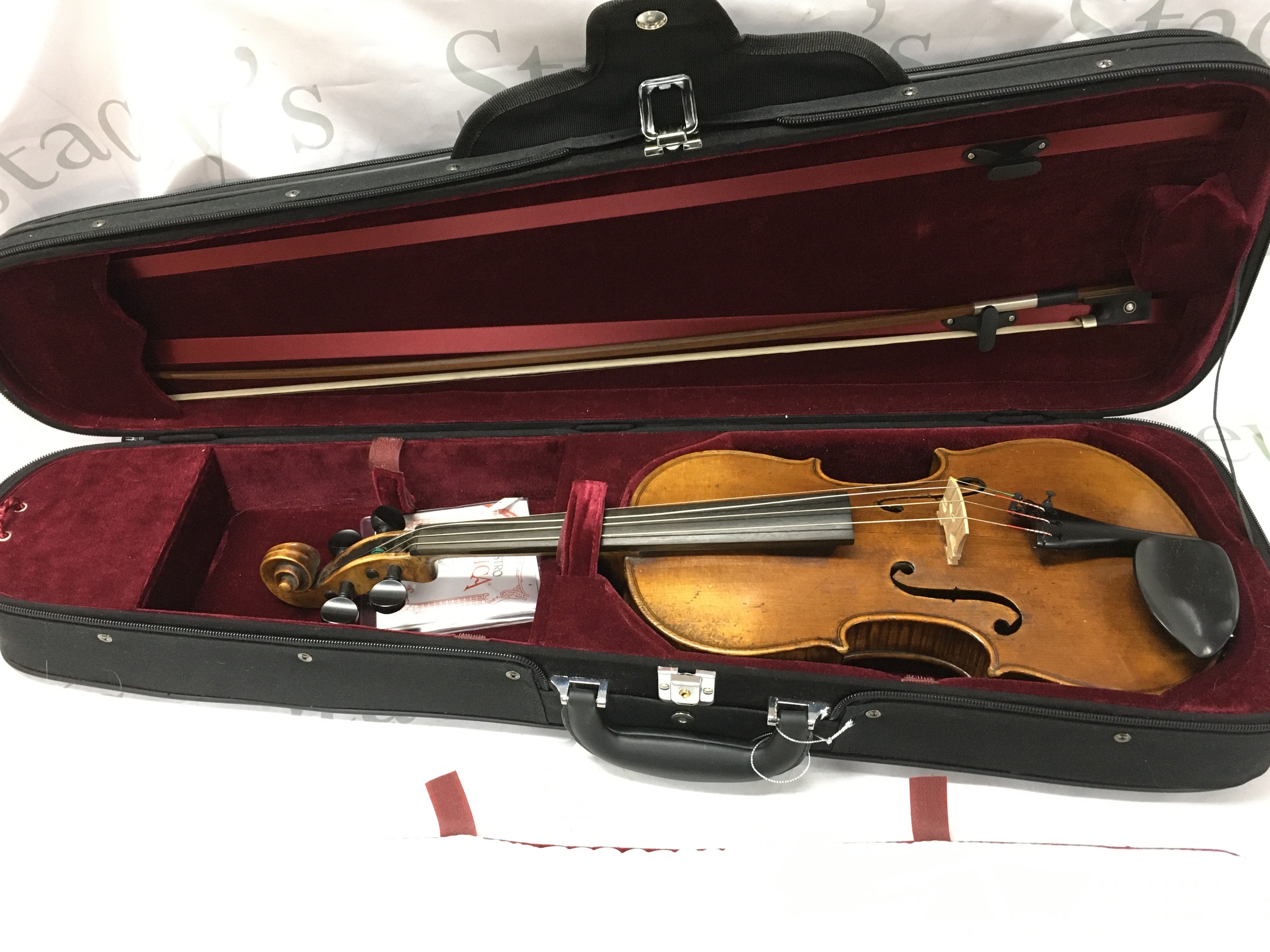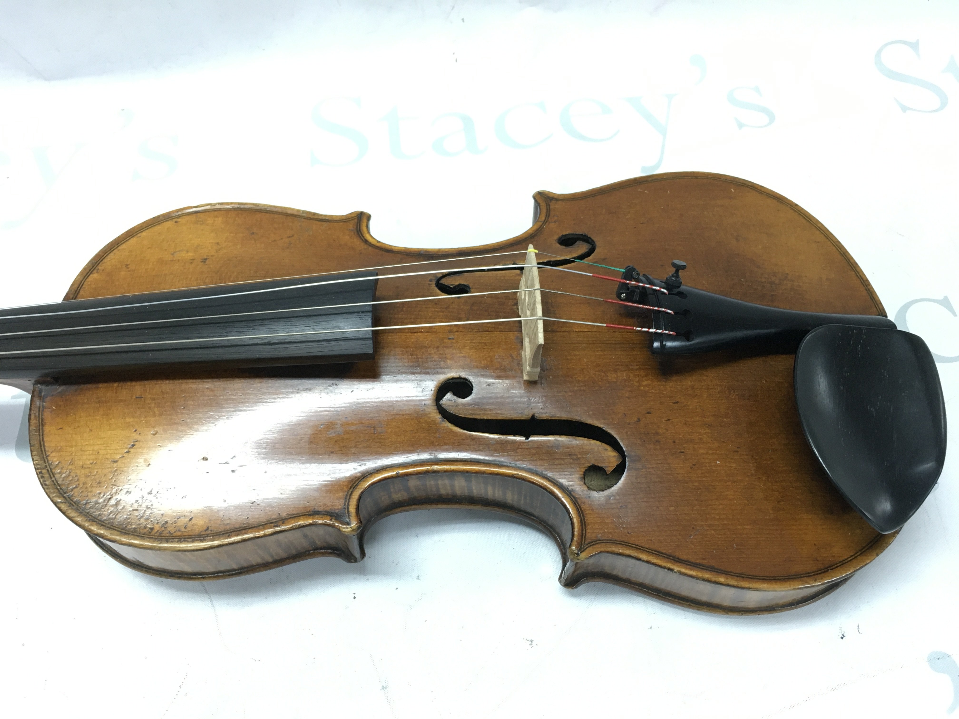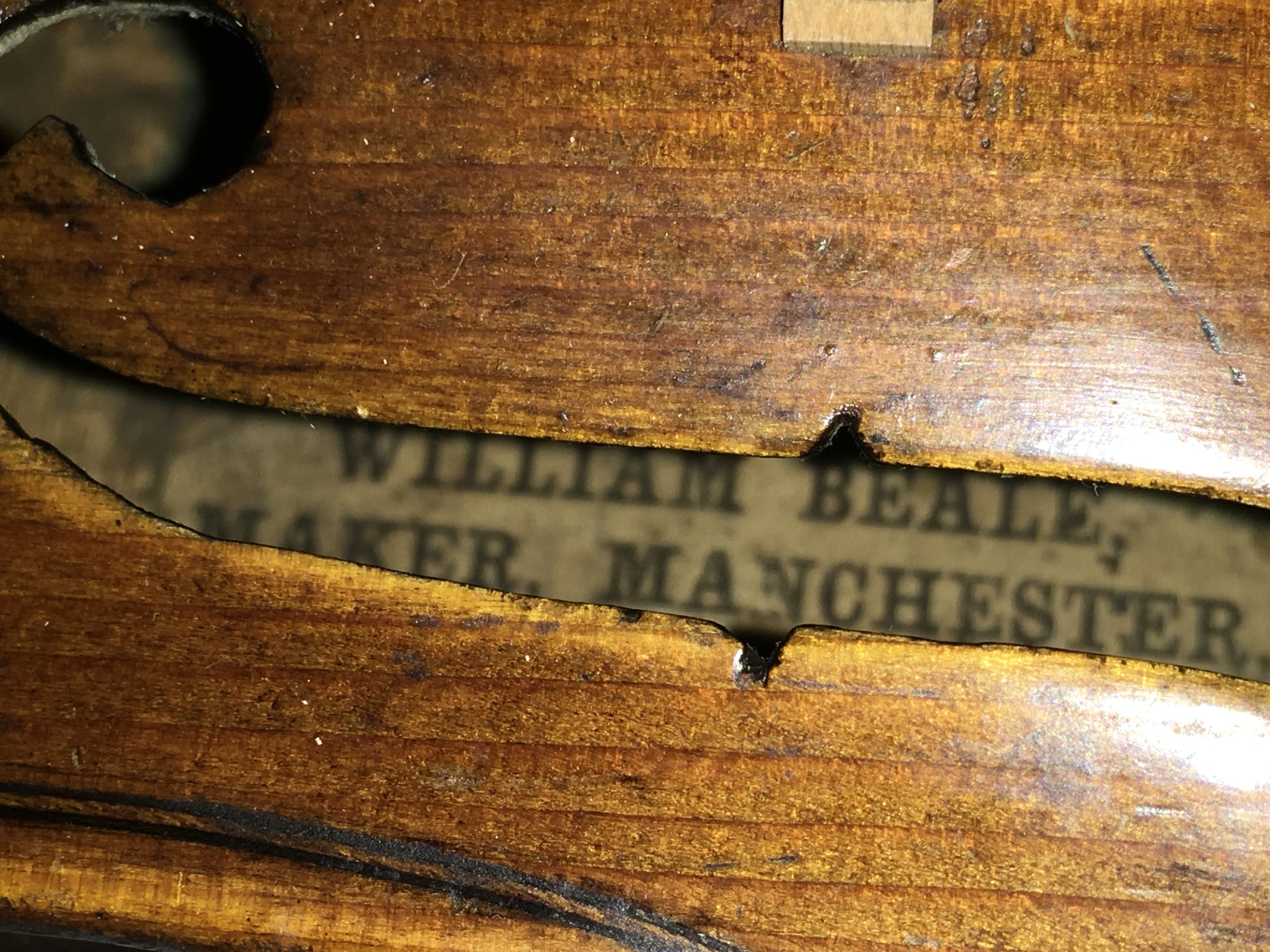 A William Beale 1840 Violin and bow in a fitted case . An interesting antique violin possibly 19th century by William Beale Manchester dated 1840 but may well be a German factory instrument , as a copy of the English, labelled inside the body. This lot cannot be posted