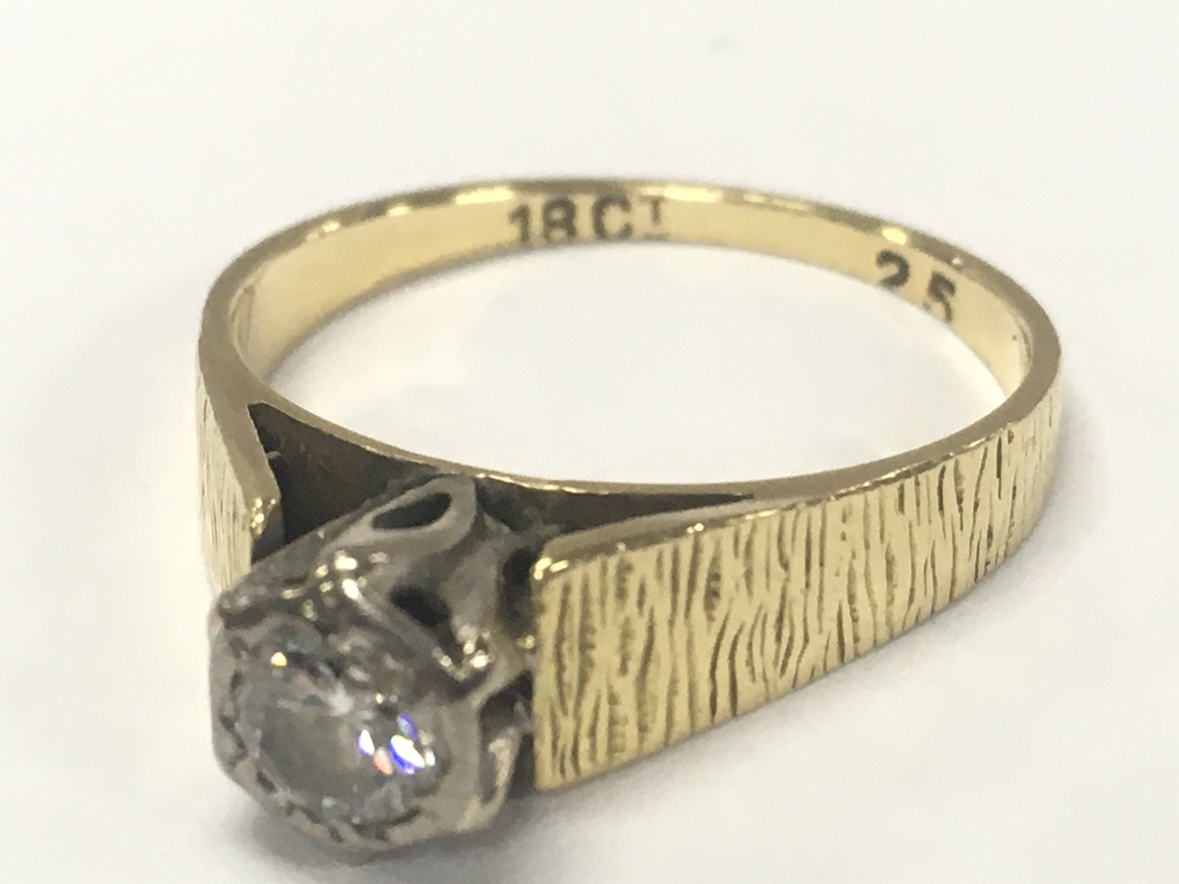 An 18ct gold ring set with a diamond stone , Approx 0.25ct. 3.5g total weight. Size M/N. Postage category A