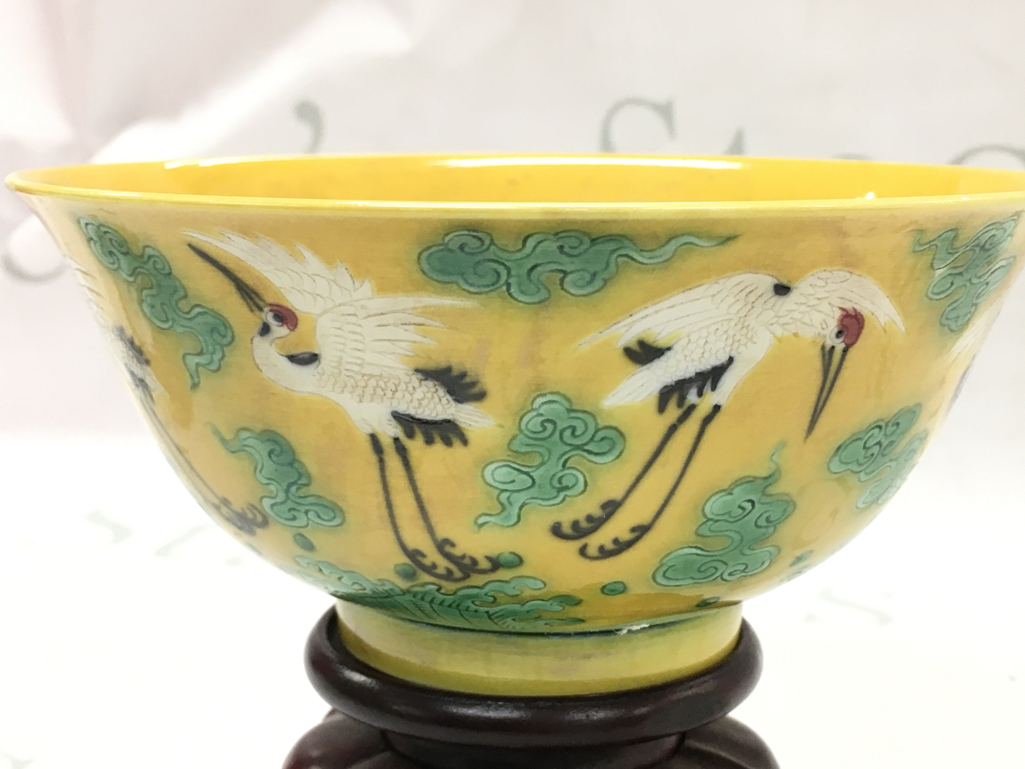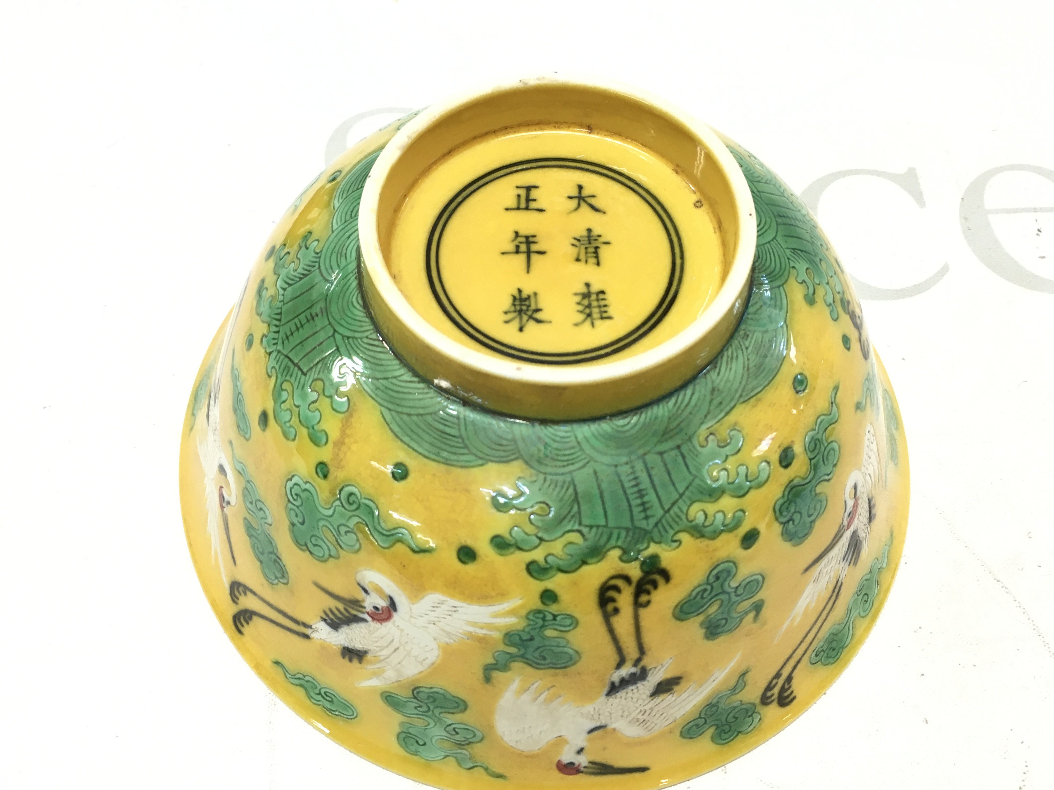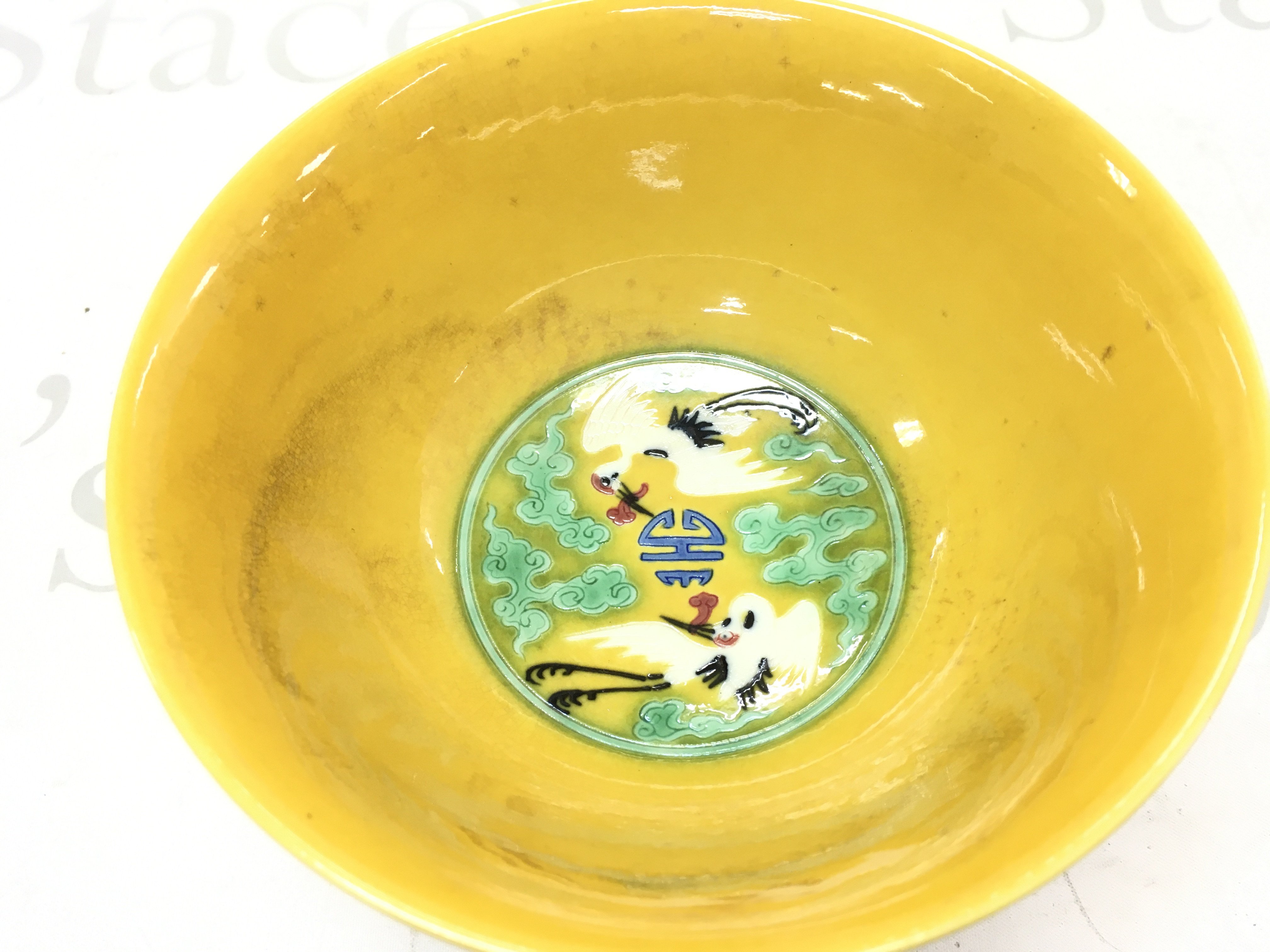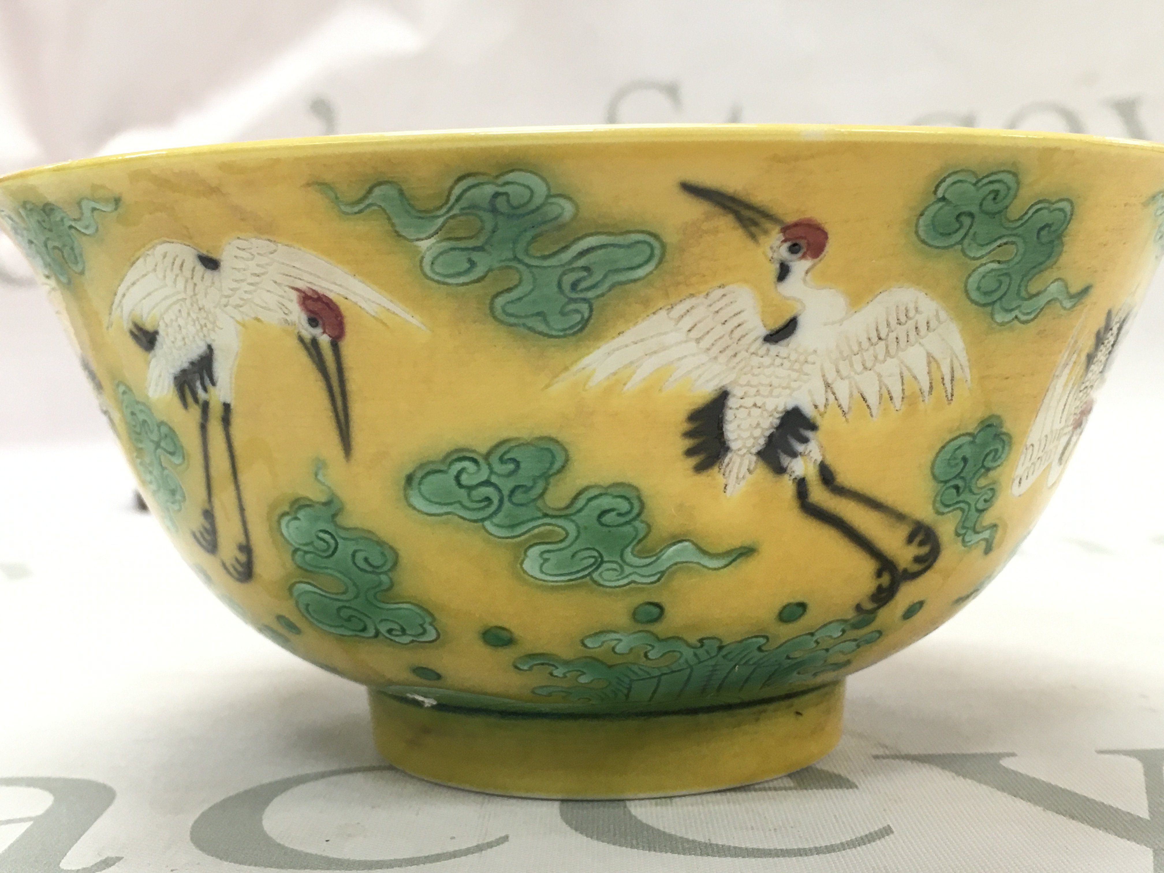 A Chinese yellow glaze dish with crane design, six character to base. 15cm wide ,7cm tall. This lot cannot be posted