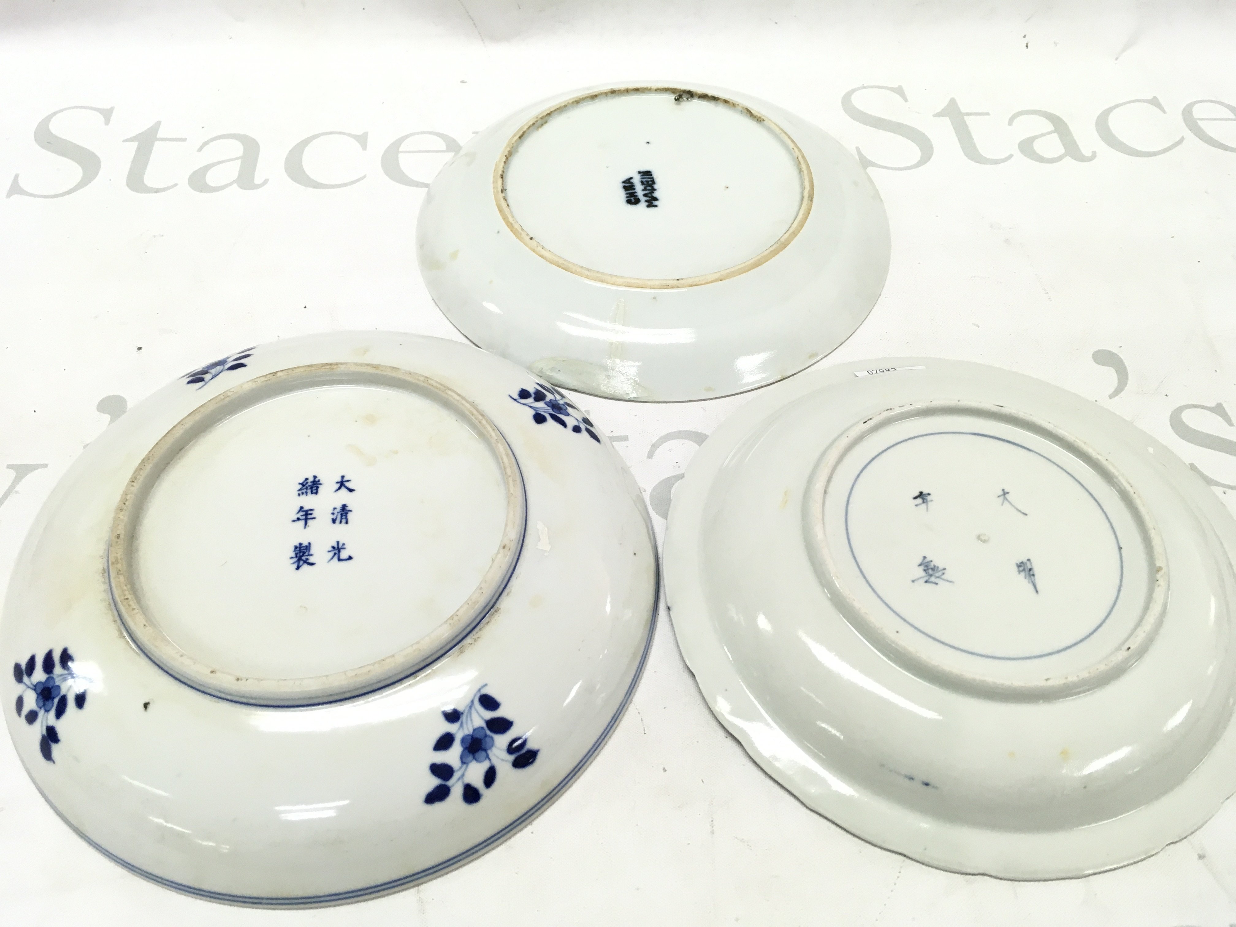 A Collection of Chinese blue and white dishes with floral and temple designs. Approximately 20cm wide. This lot cannot be posted