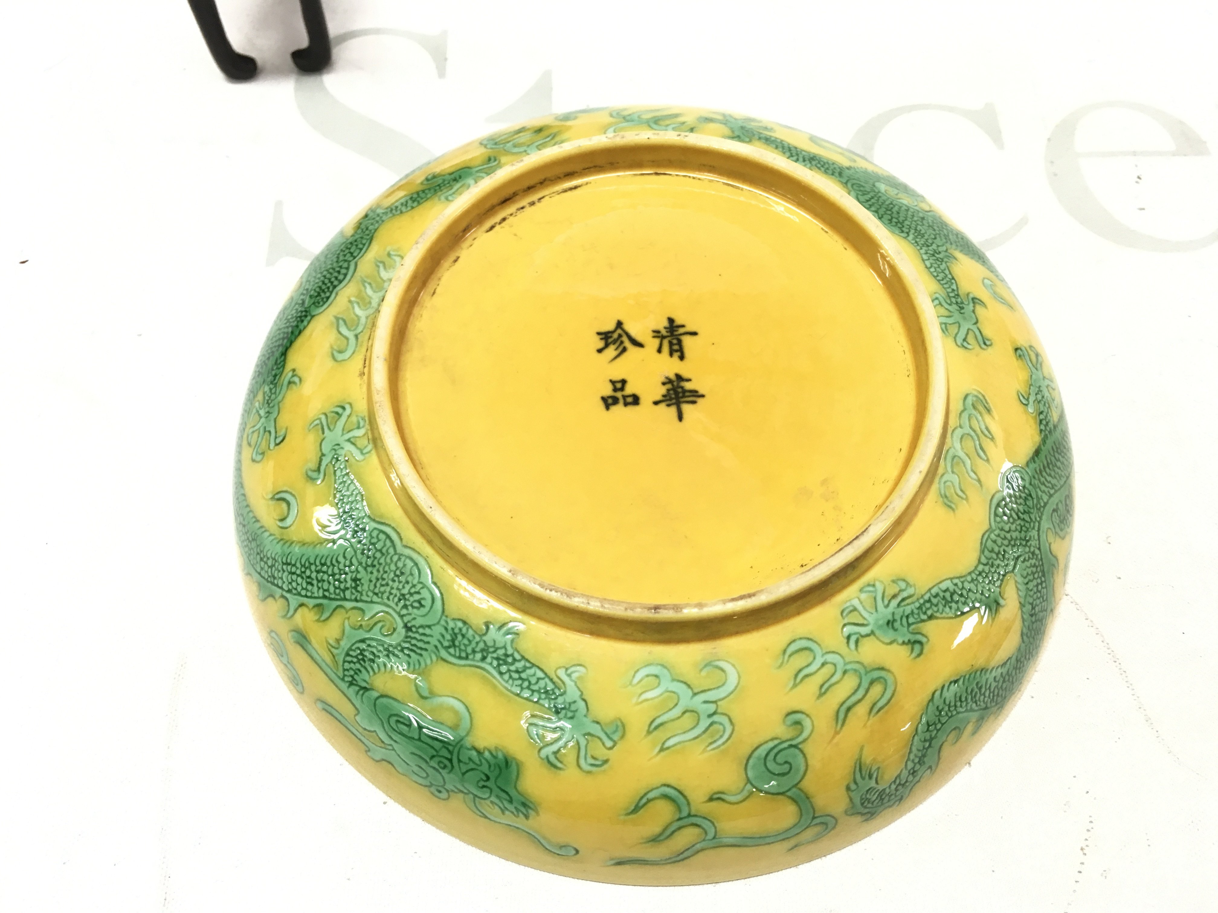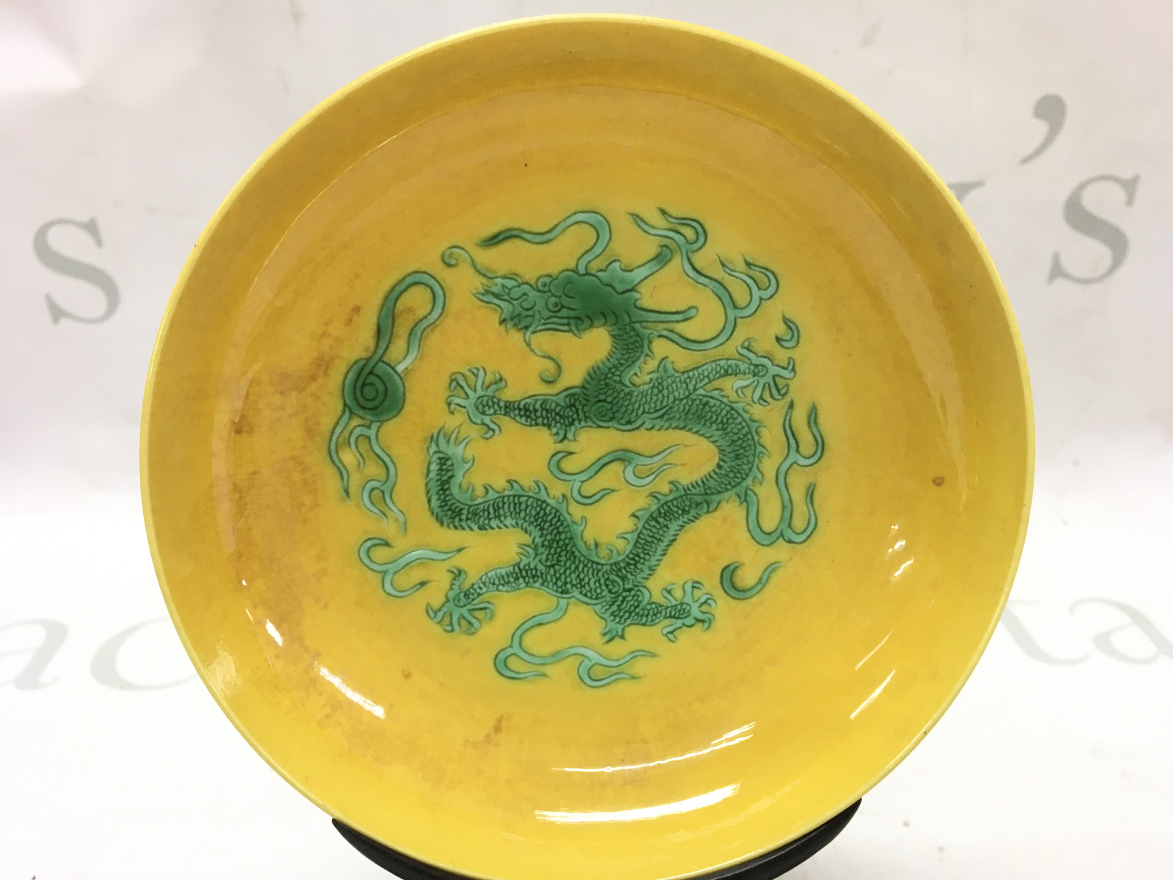 A yellow glaze dragon dish with a four character mark at the base. 14cm wide. This lot cannot be posted