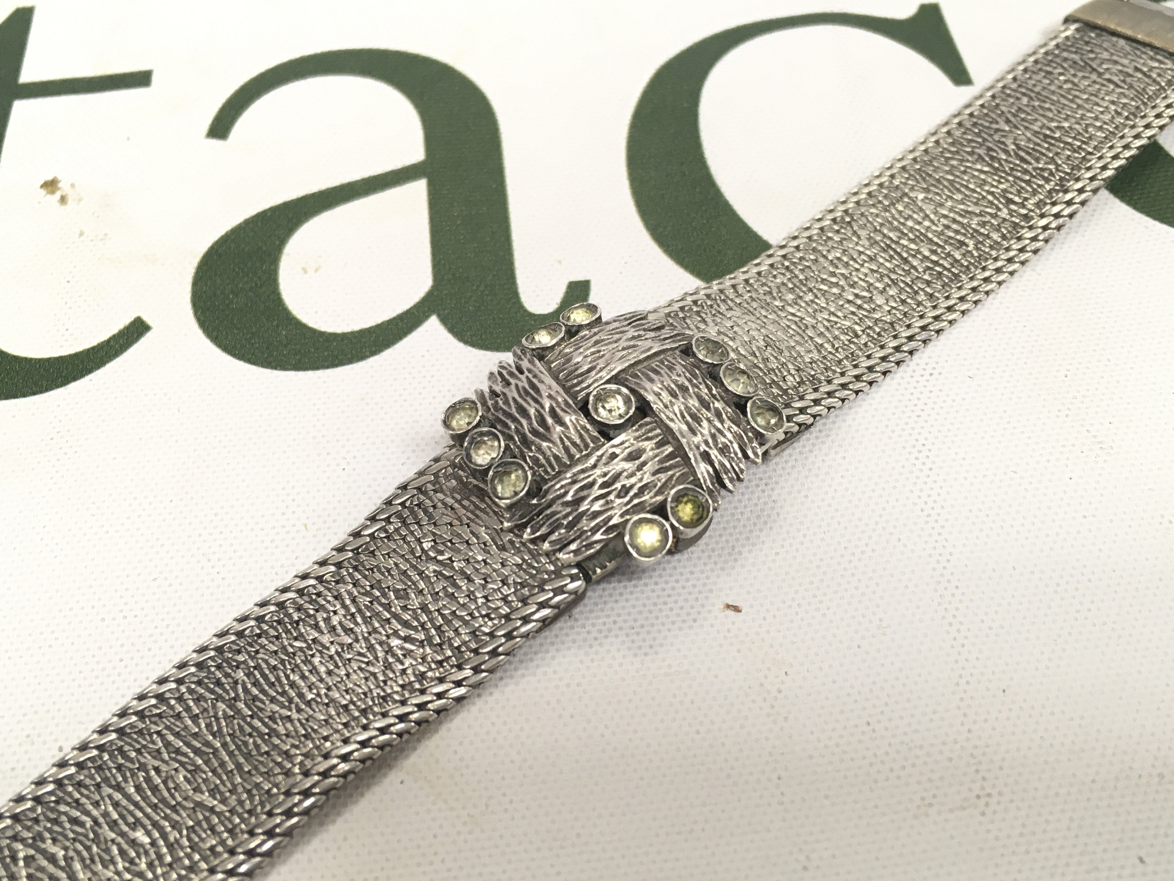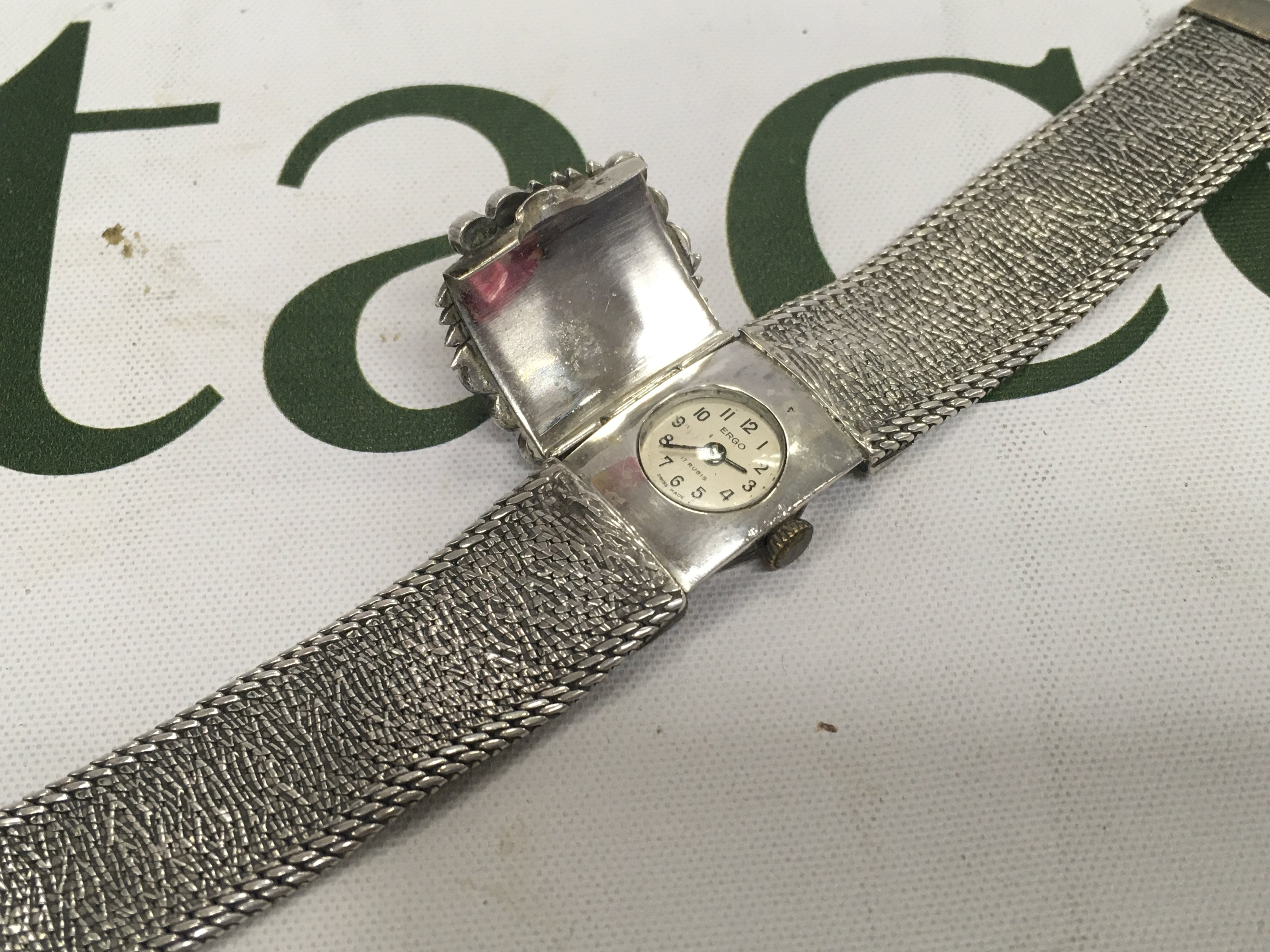 A silver cased designer ergo watch with a flip patterned cover.