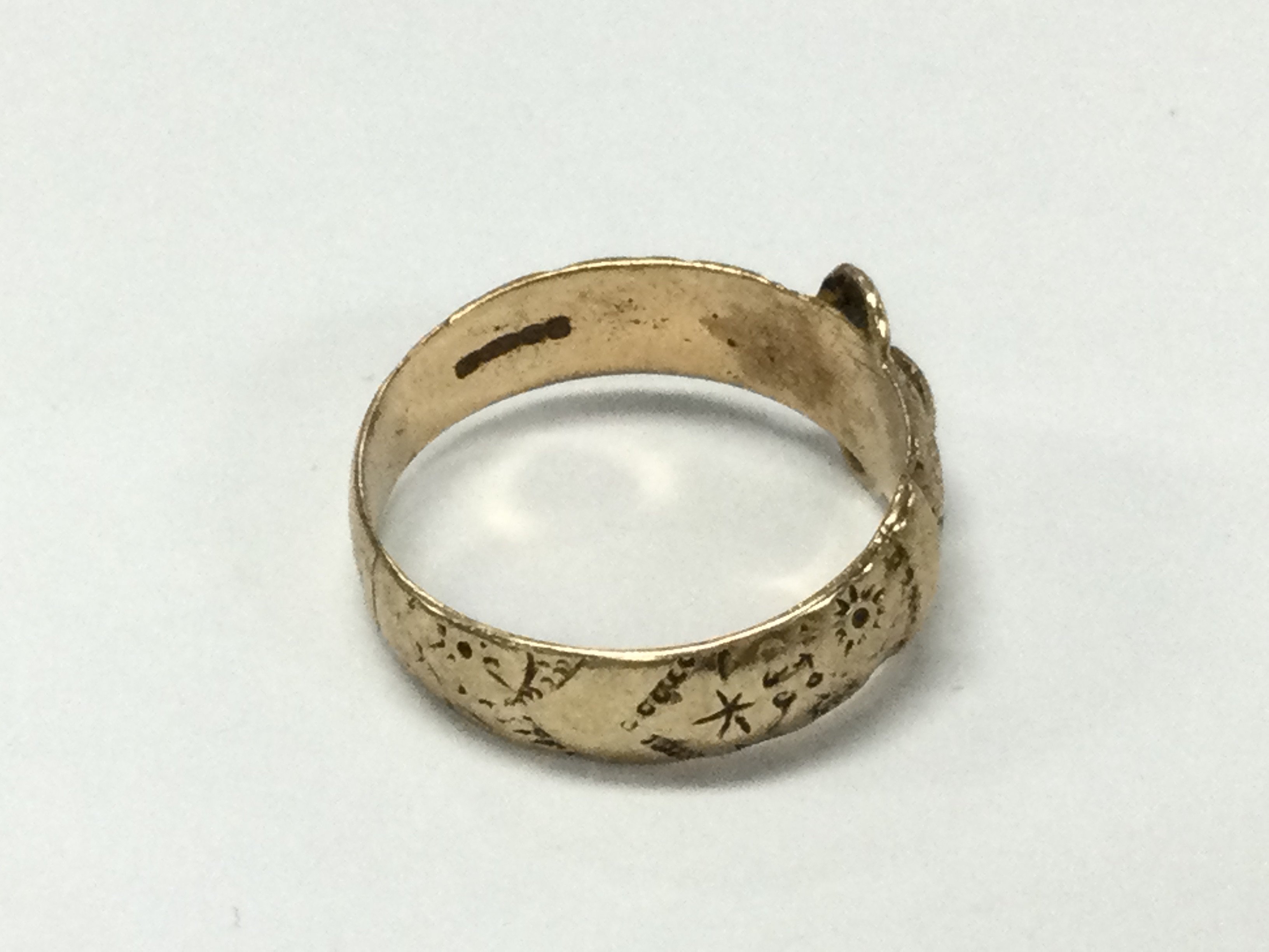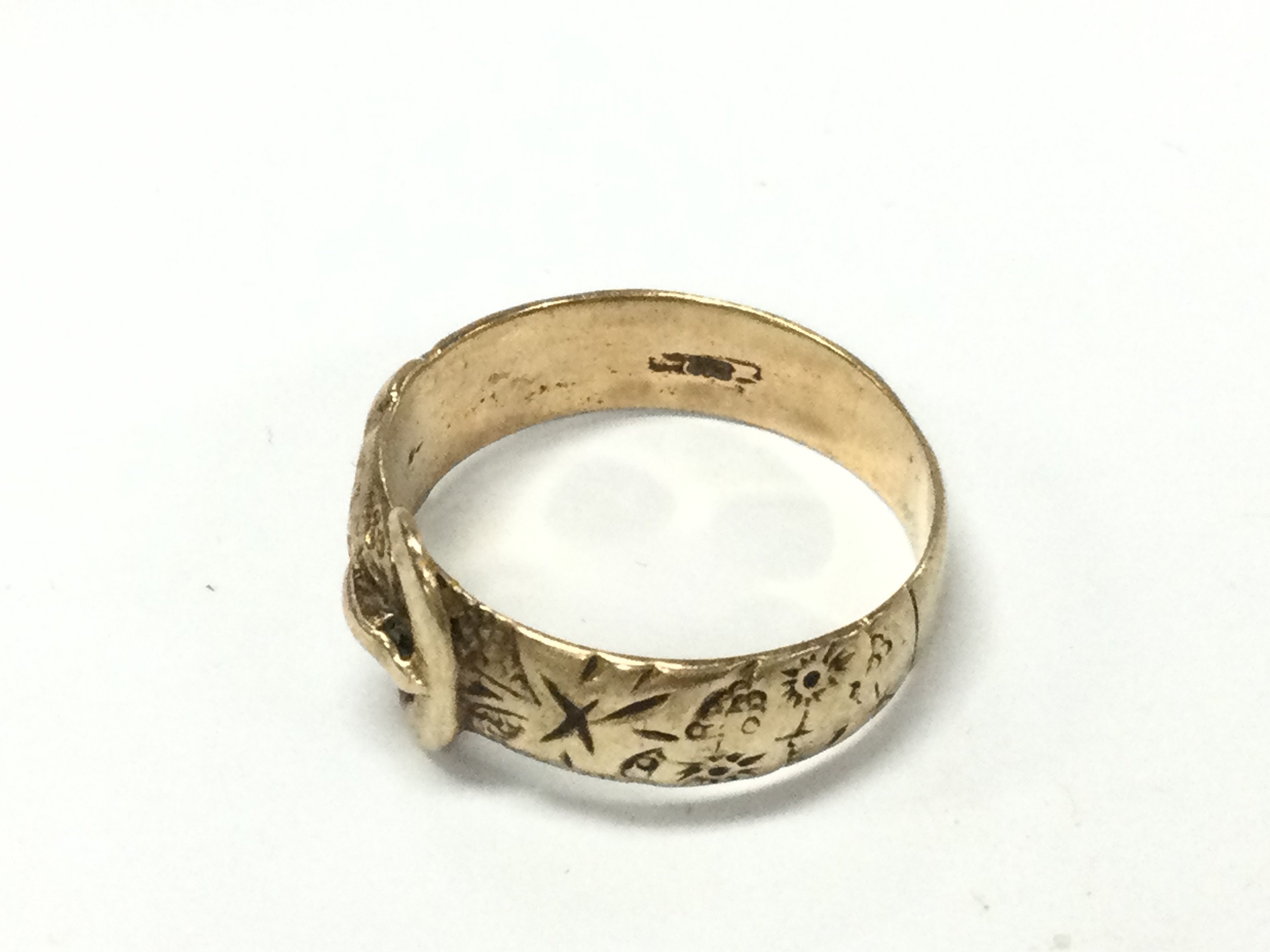 A 9ct gold buckle ring with floral engraving. 5.43g and size W