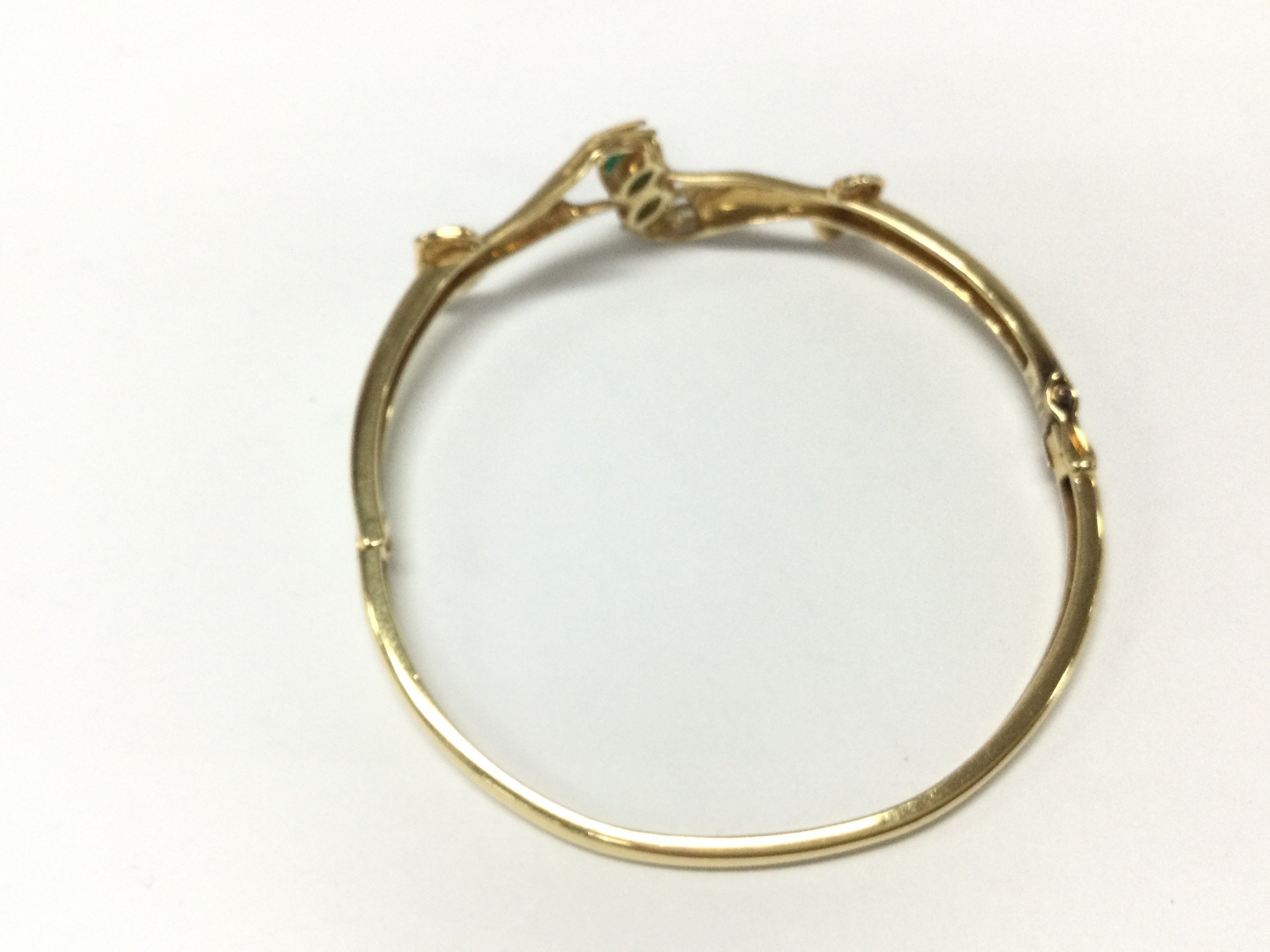 A 14ct gold crossed hands bangle inset with two Colombian green emeralds and pave set diamonds. 9.80g