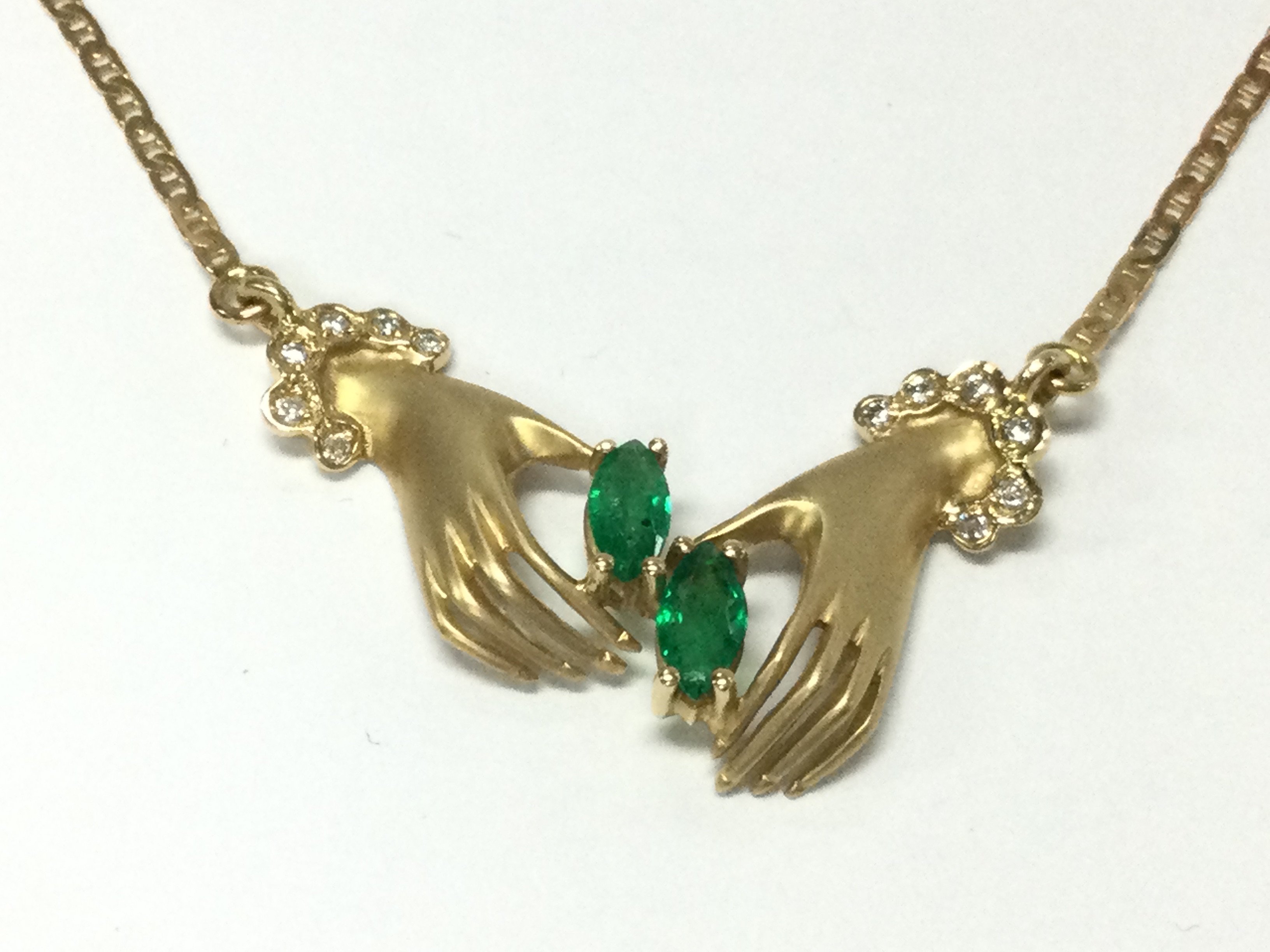 14ct gold necklace with 2 Colombian green emeralds and pave set diamonds. 4.23g