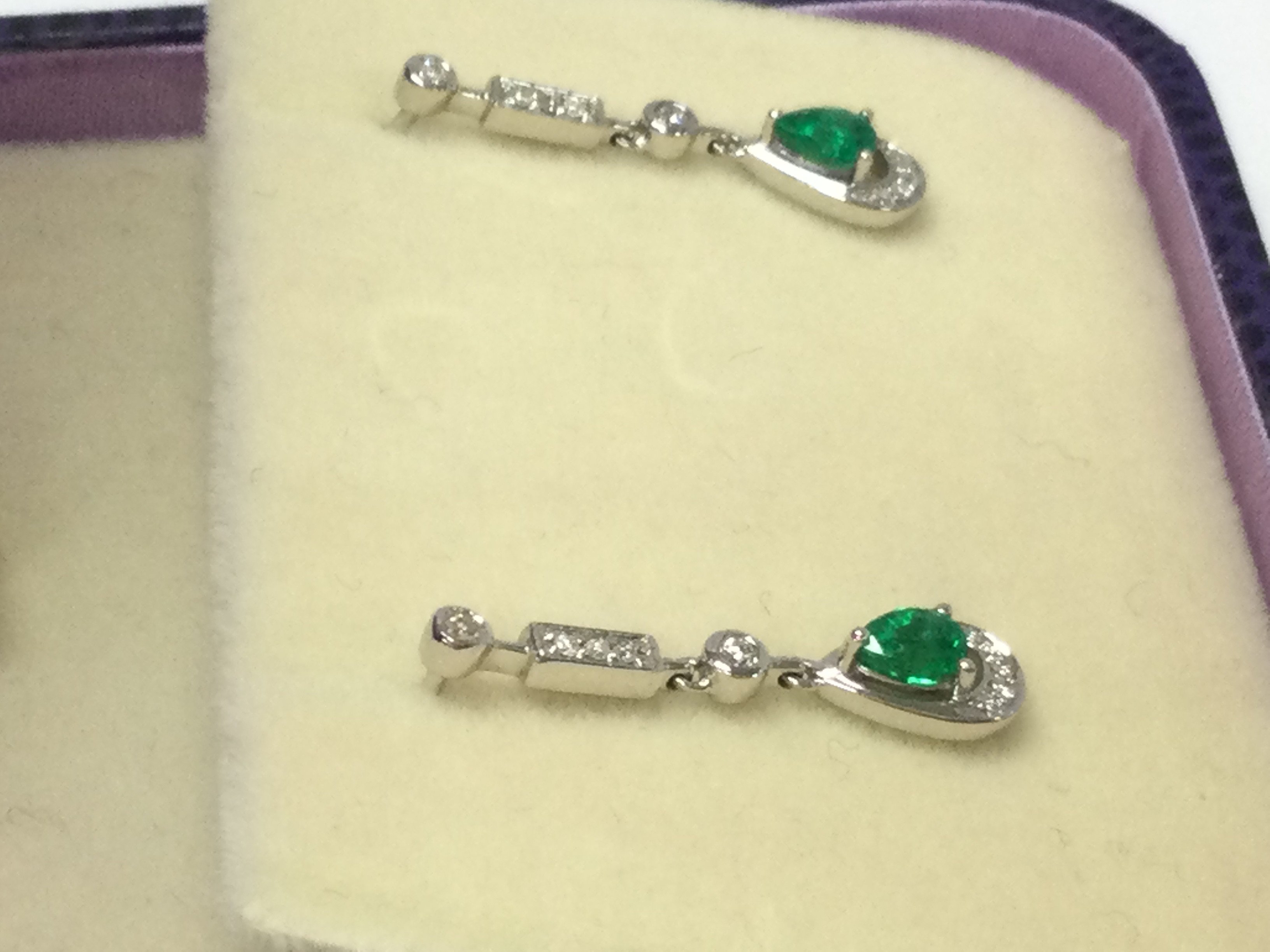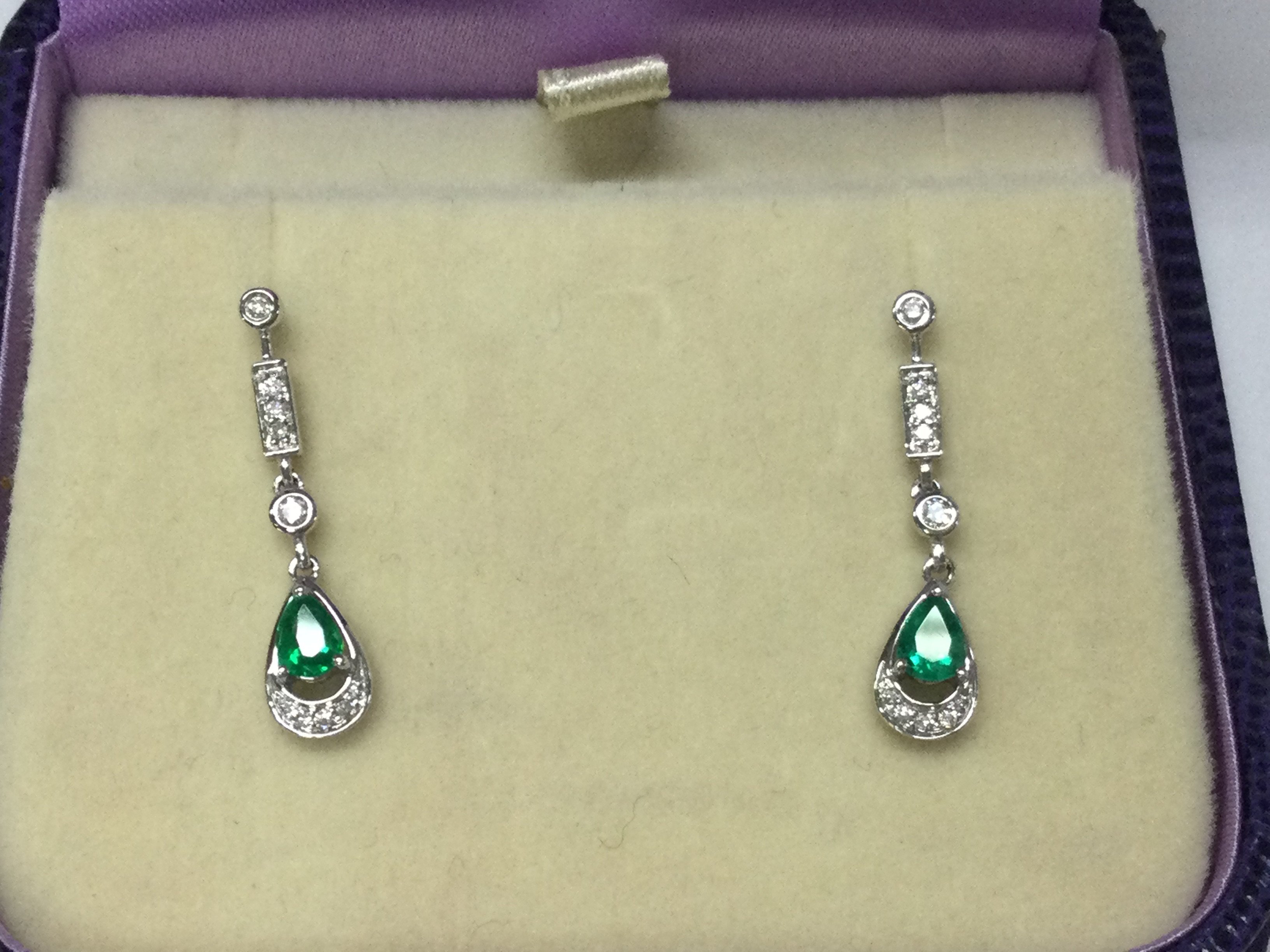 A pair of 18ct white gold emerald set drop earrings in a 1930s style. Postage B
