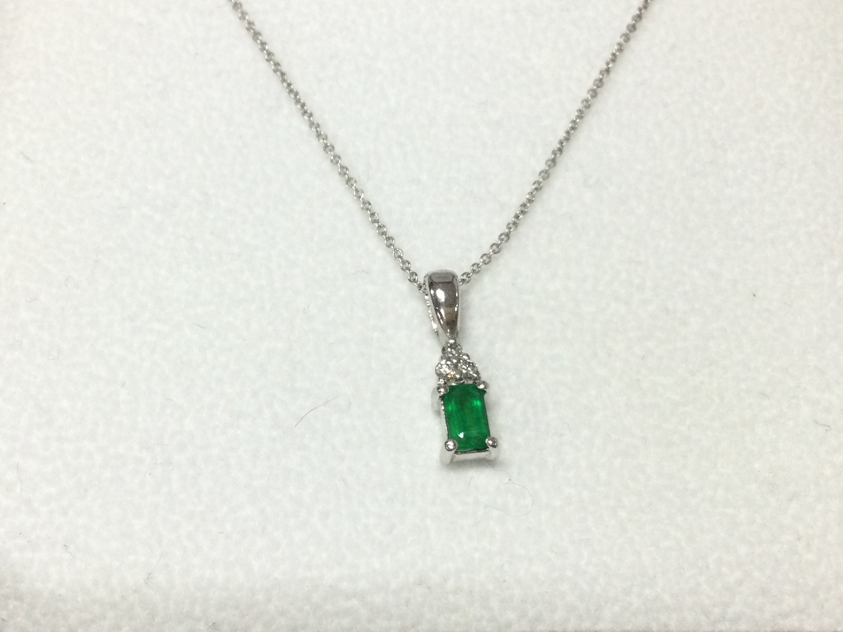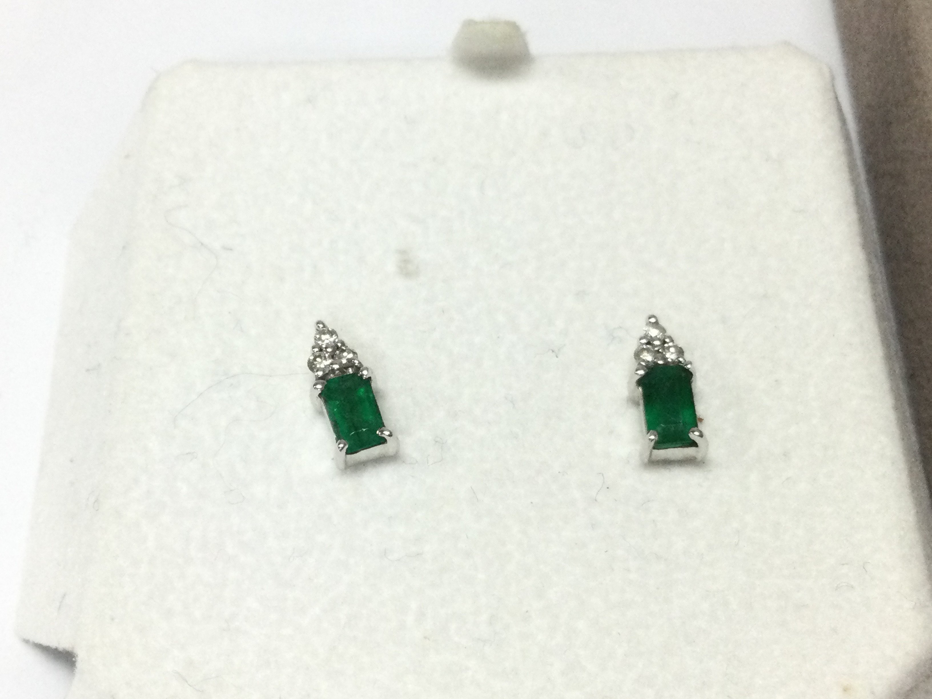 An 14ct white gold emerald and diamond pendant and chain with a matching pair of stud earrings. Postage B