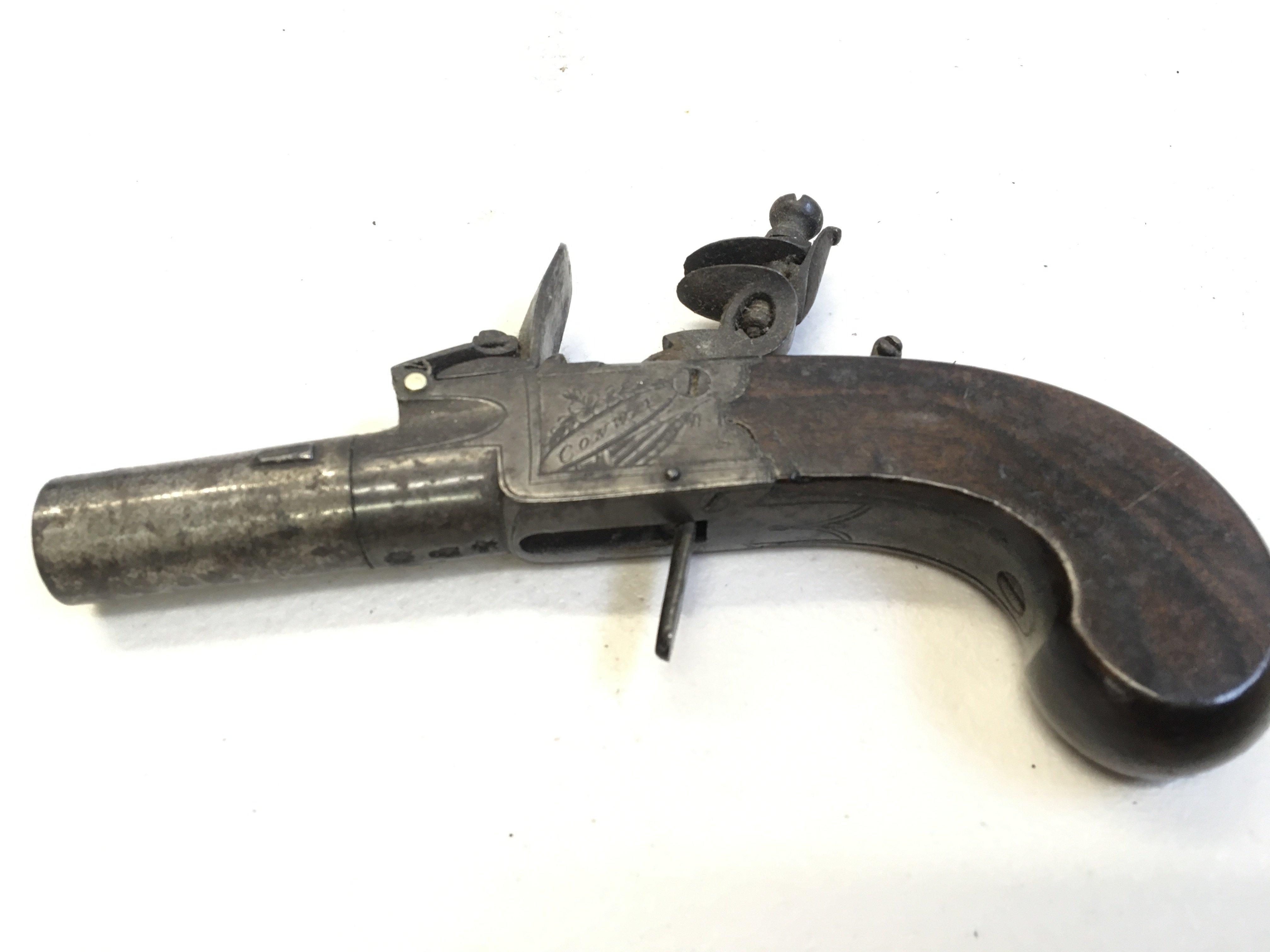 An early 19th century flintlock pocket pistol with retractable trigger screw barrel the action stamped Conway Newcastle action functional proof marks to the underside of the barrel.
