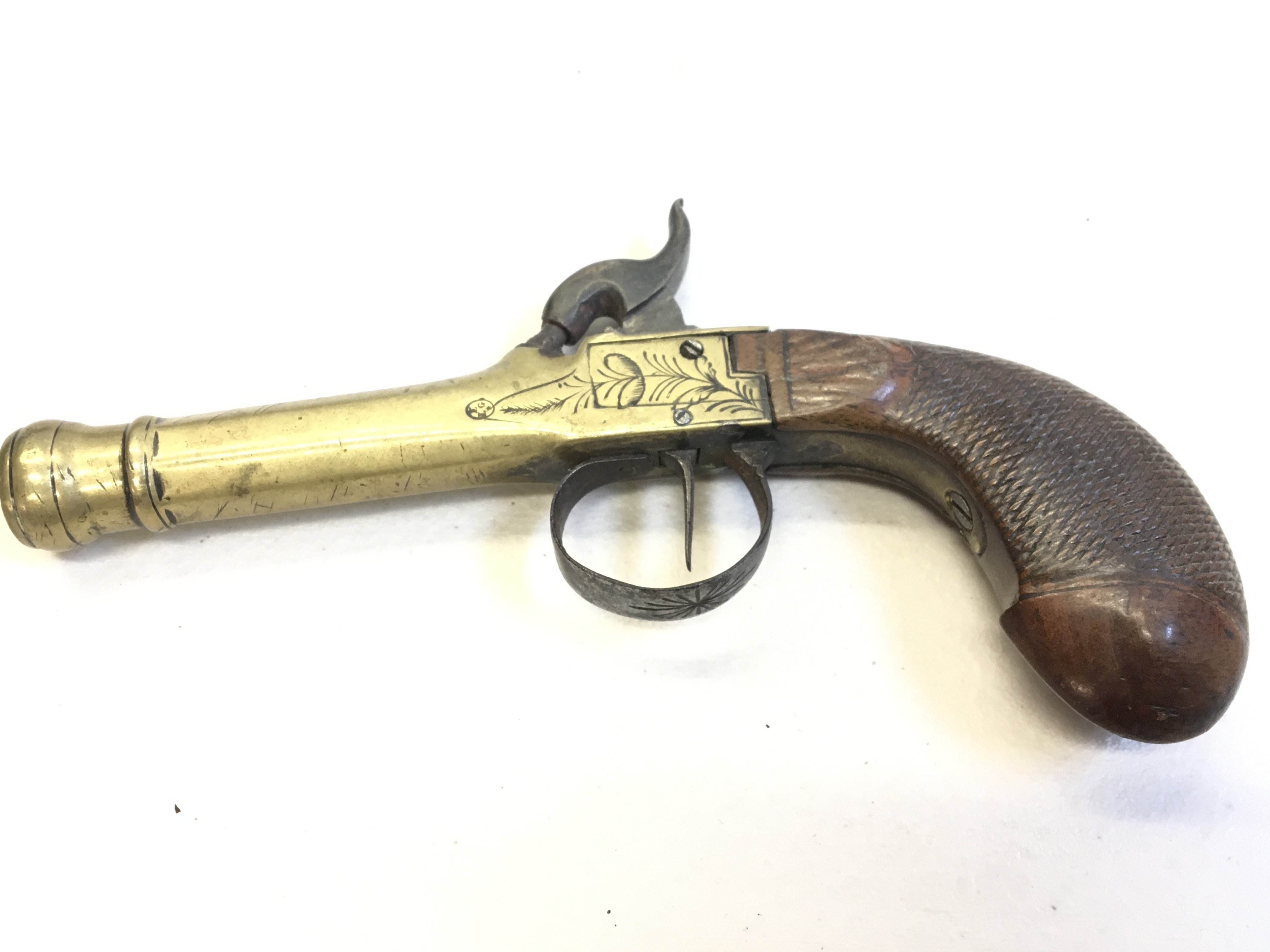 An Early 19th Century brass cannon barrel percussion pistol with a walnut grip steel trigger guard stamped LP to the barrel with light floral pattern engraving.