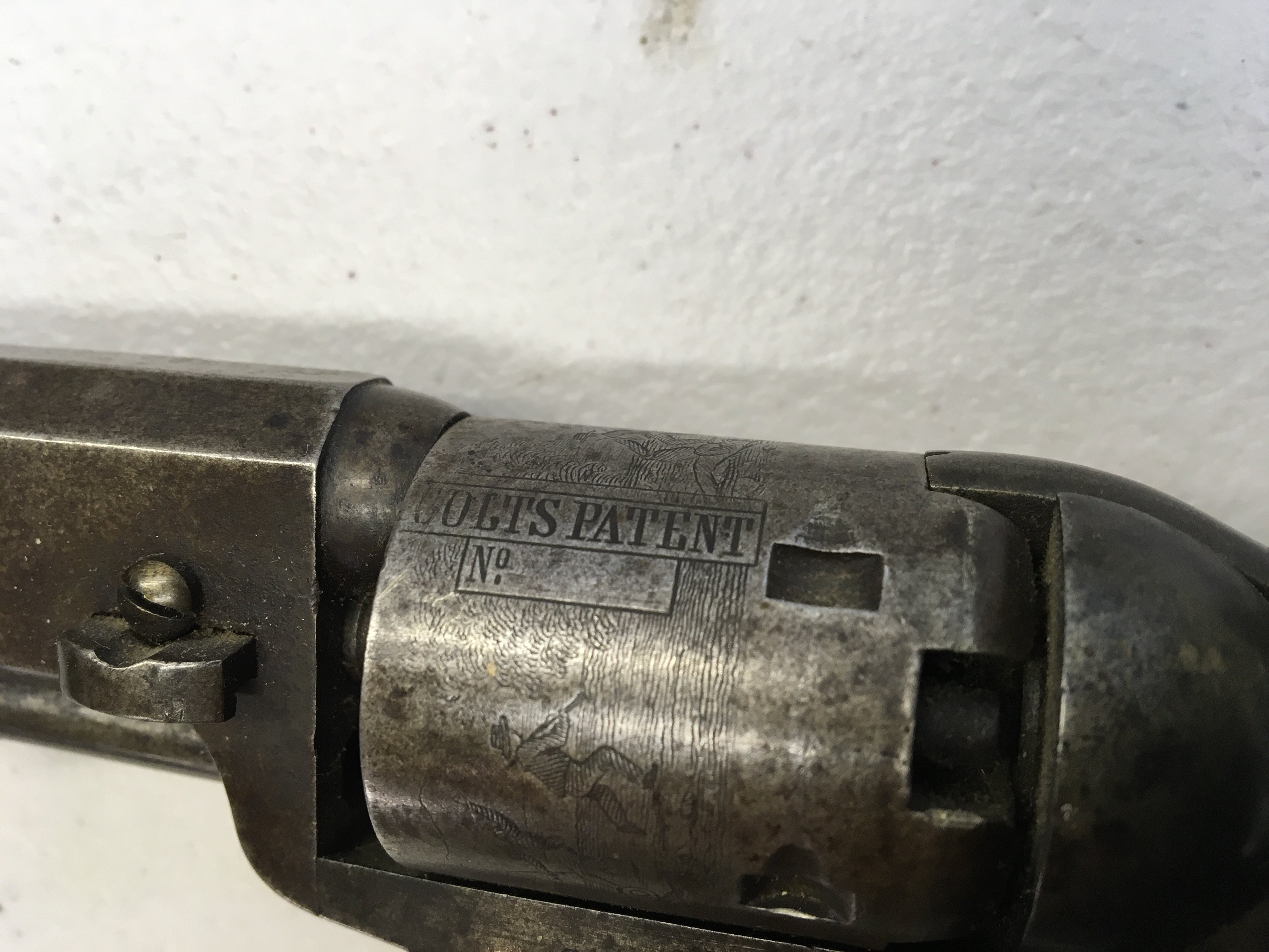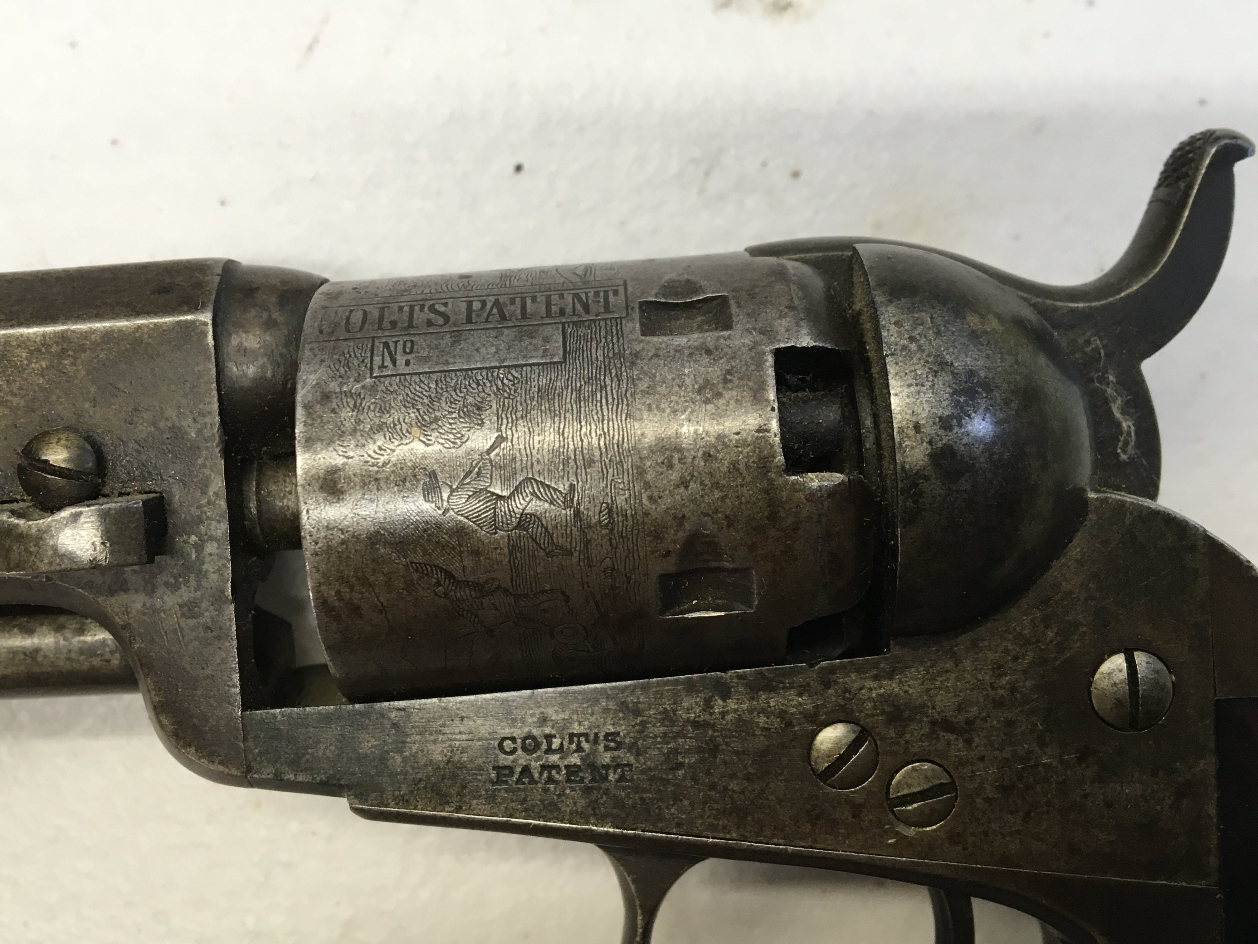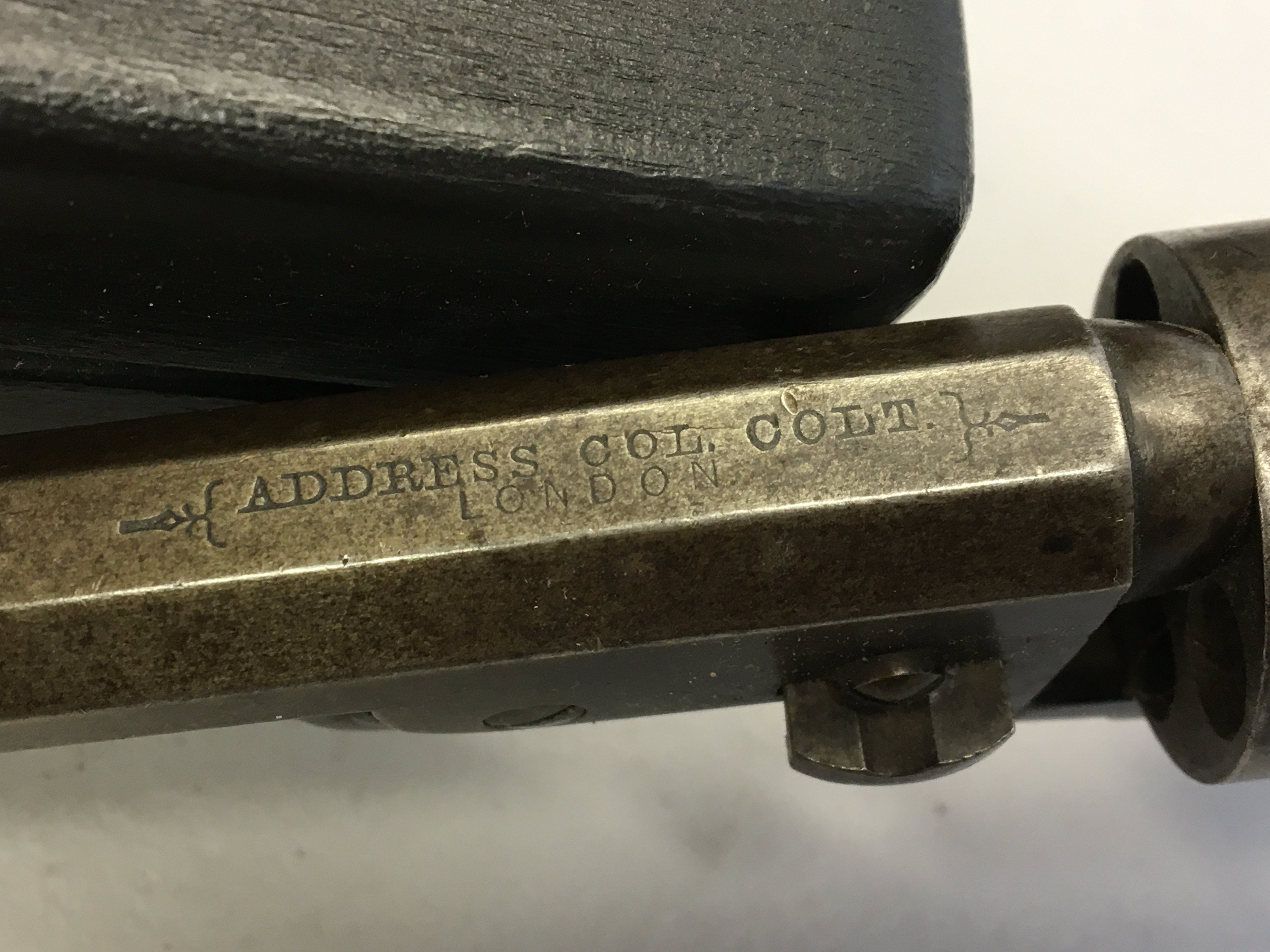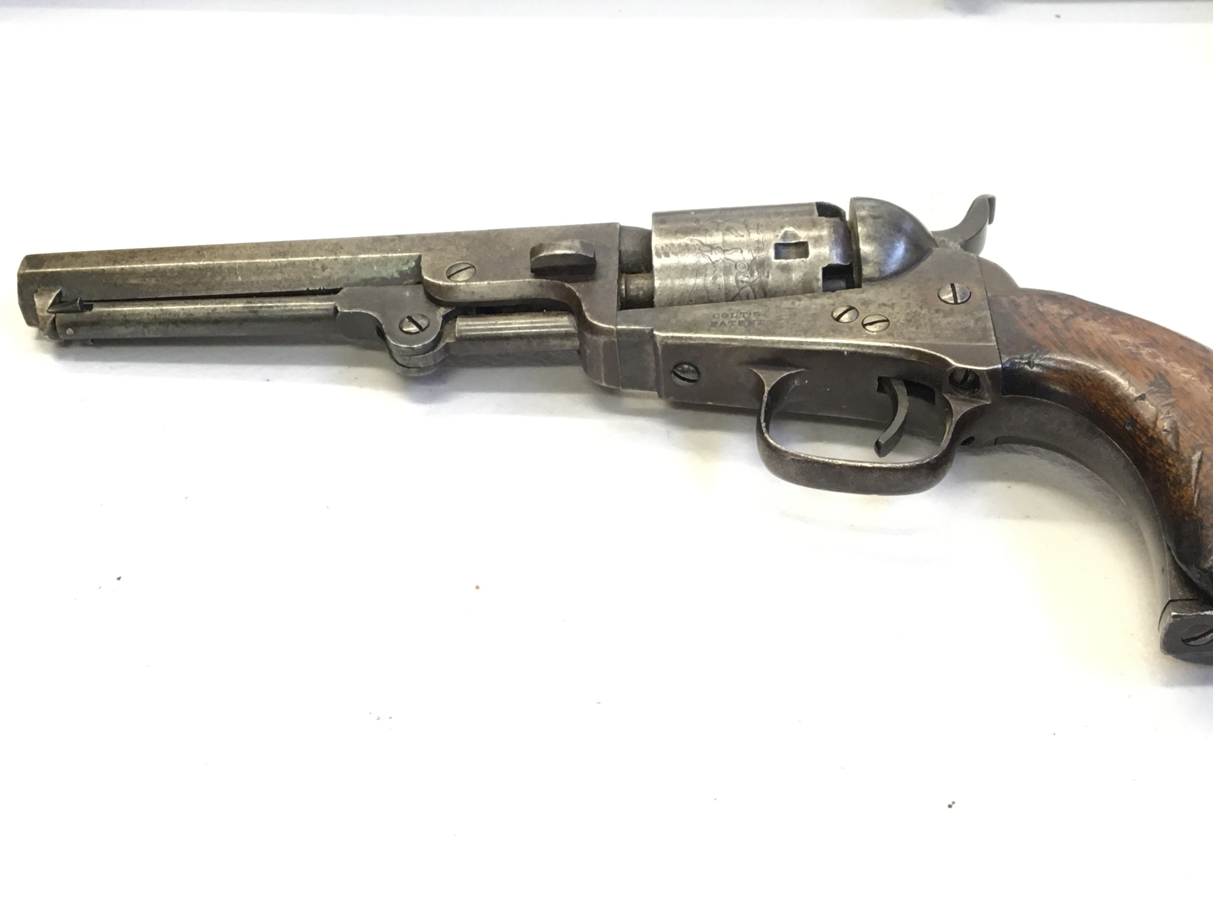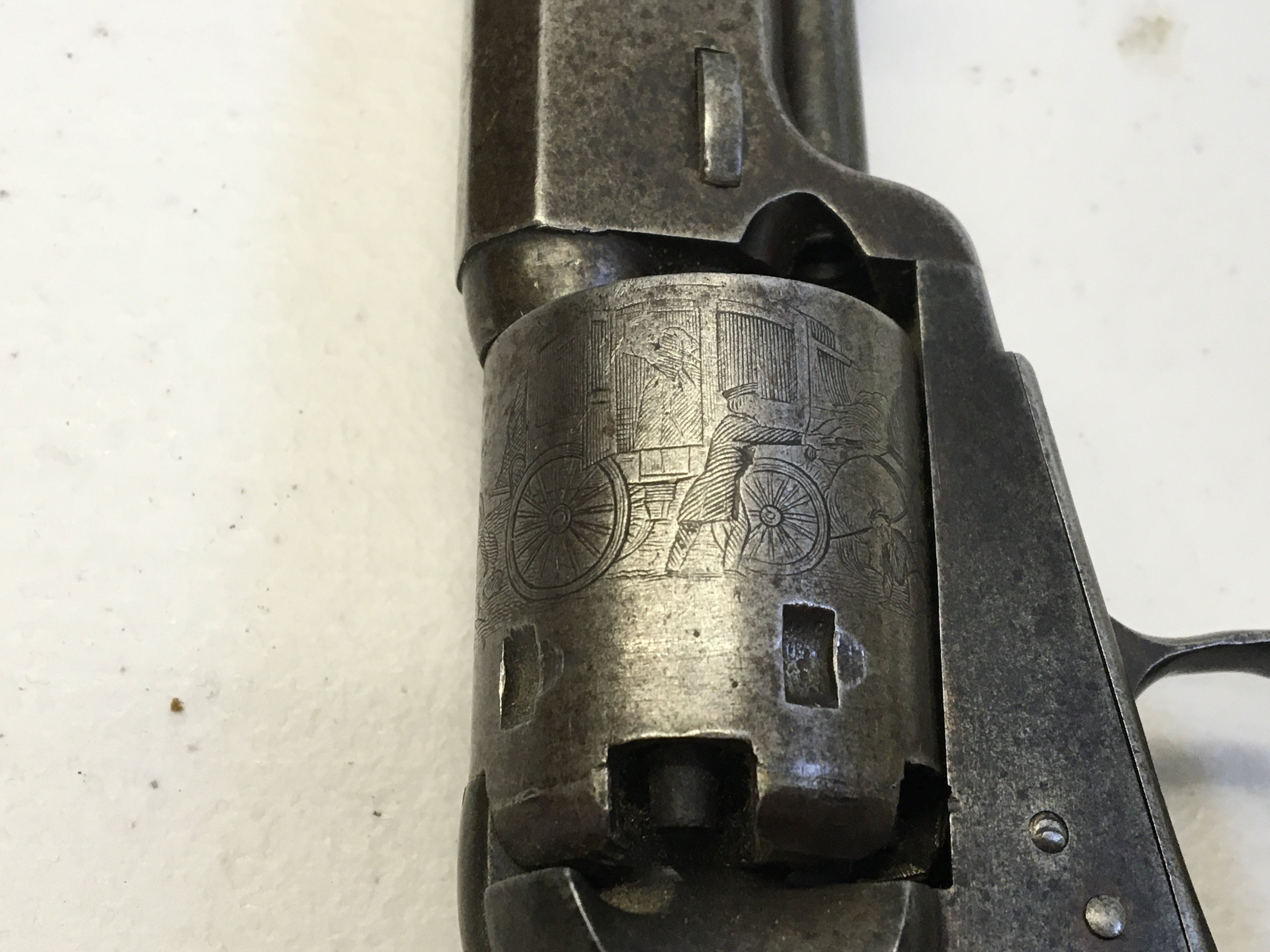 A rare 19th century Colt revolver the octagonal barrel stamped Address Col Colt London the barrel engraved with figures and horse drawn carriage stamped Colts Patent the side plate also stamped Colts Patent.