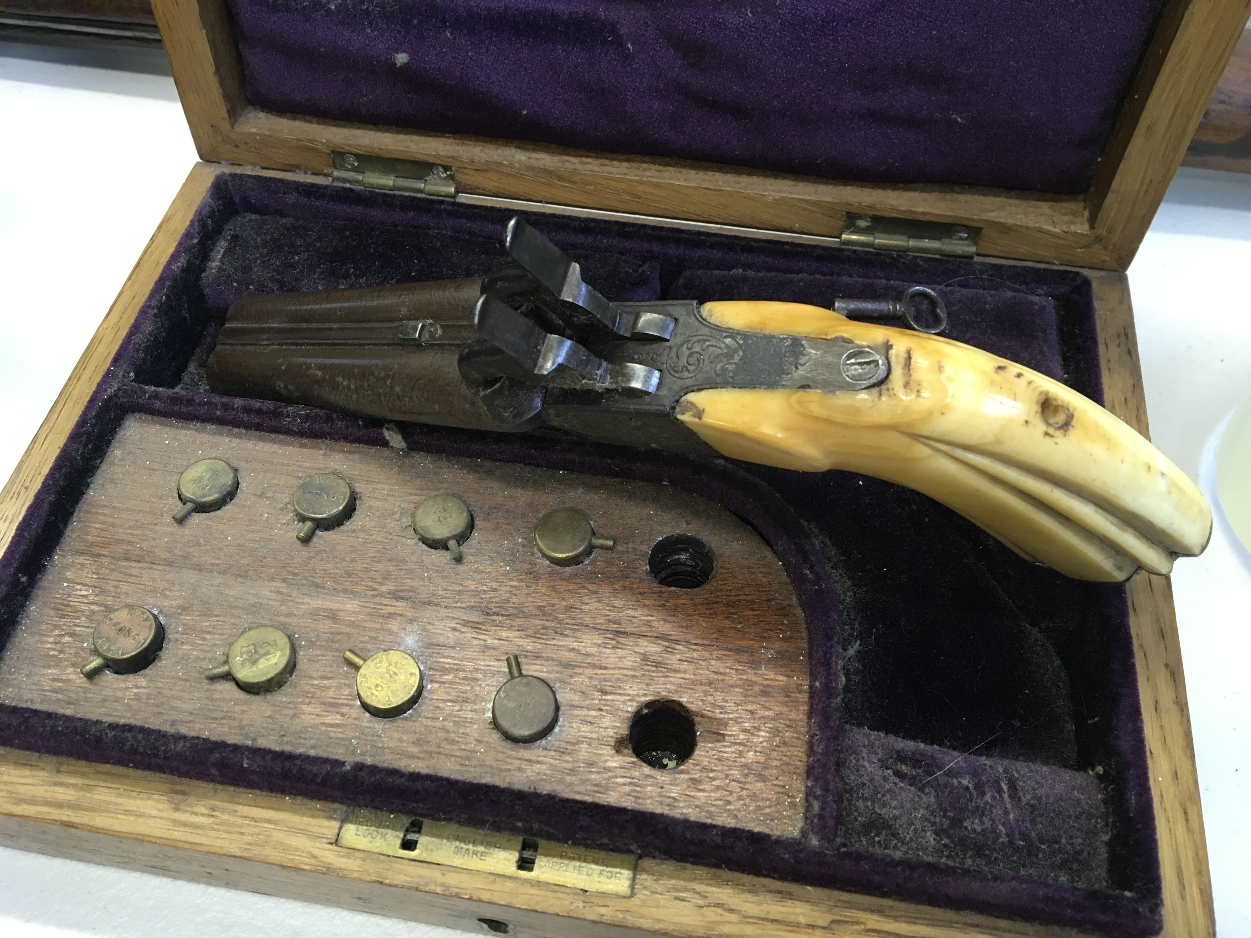 A Nice Example of a 19th Century Continental pin fire double barrel pistol with engraved action retractable triggers under leaver sliding opener for loading barrels in a fitted case with pin fire cartridges action working.