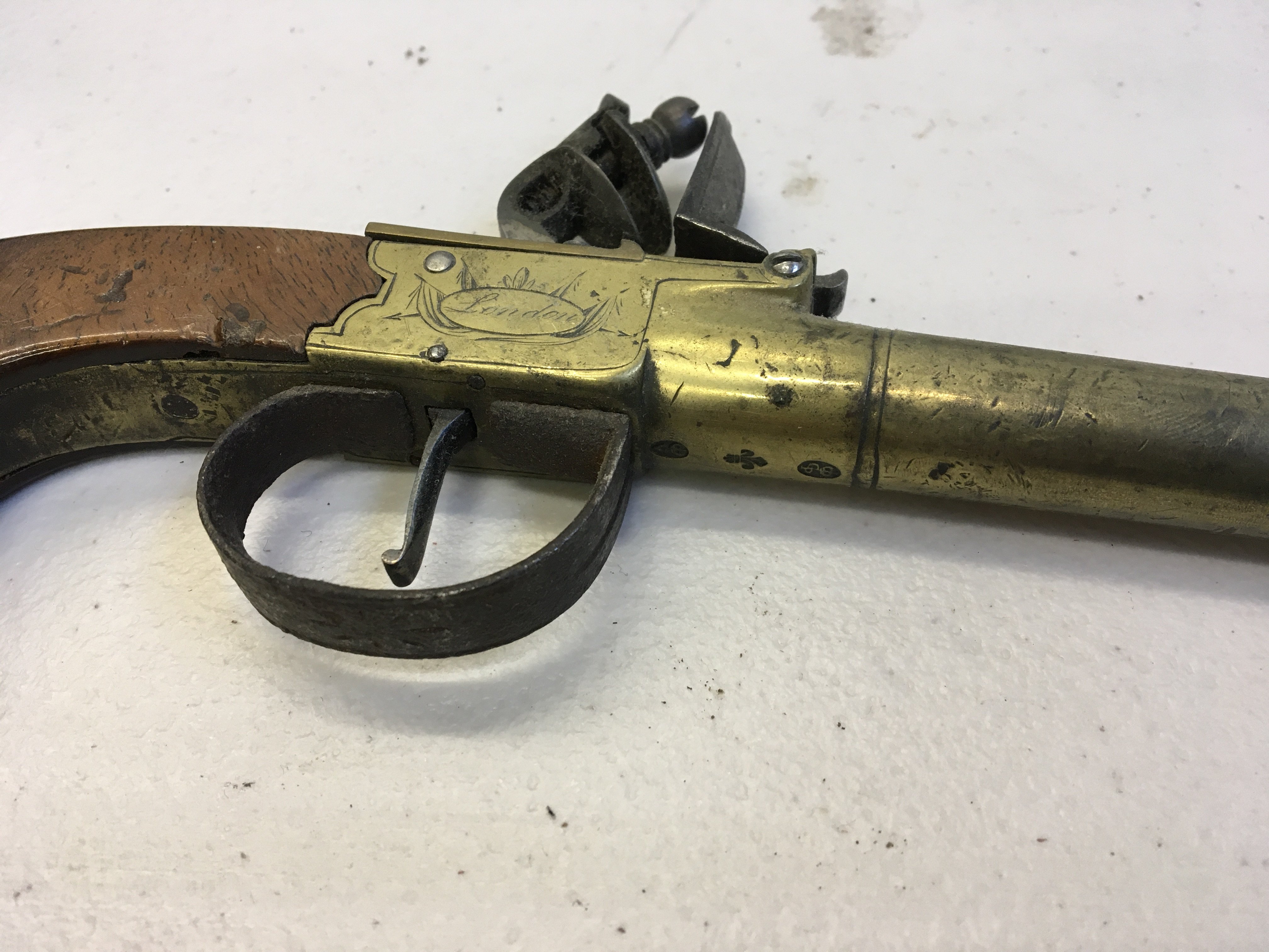 An Antique flint lock pistol with brass barrel and action walnut grip missing flick bayonet fitting. The action stamped Bafs London.