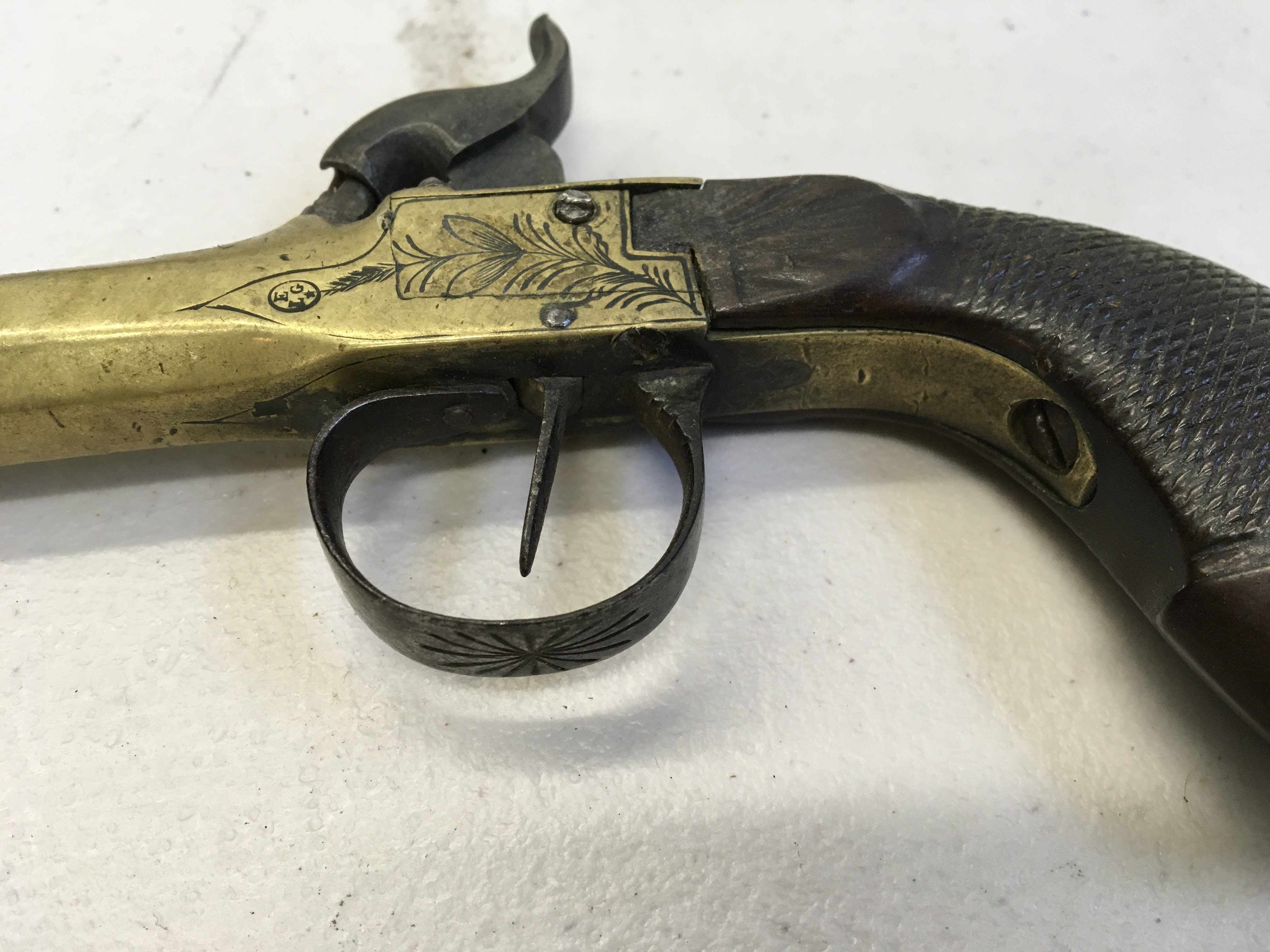 An Early 19th Century cannon barrel percussion with floral engraving and walnut grip. Makers stamp