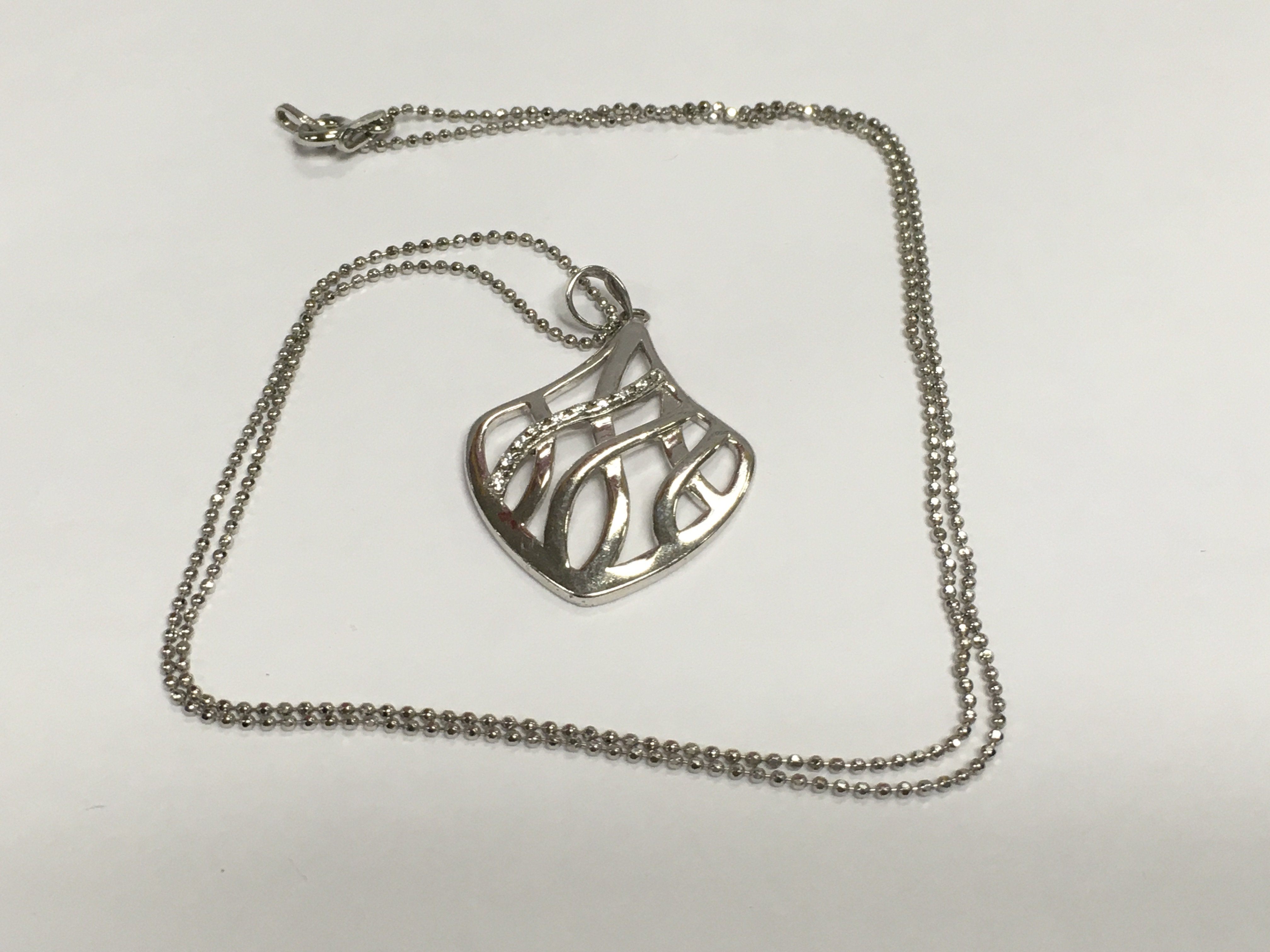 A silver openwork pendant set with cubic zirconia on a silver chain. Shipping category A.