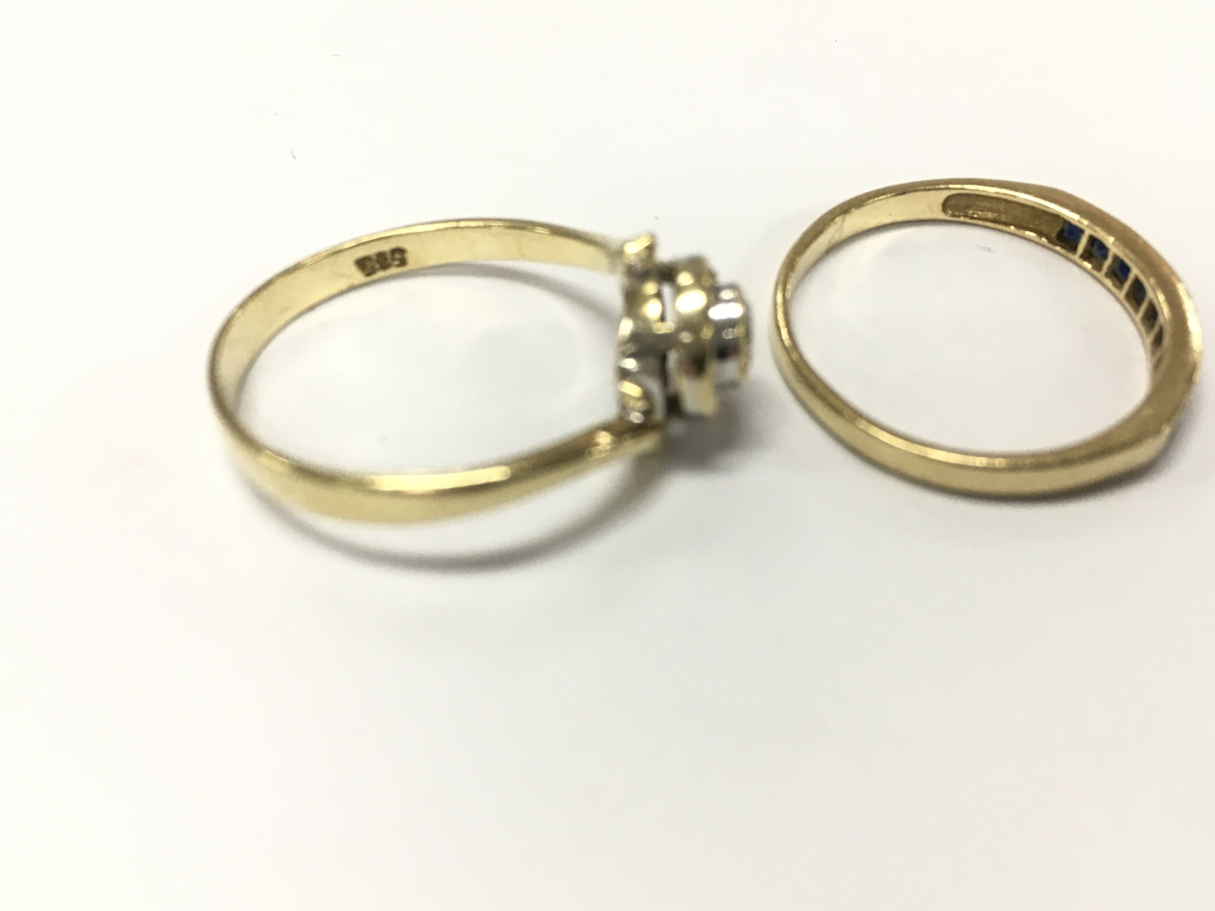 A 14ct gold diamond solitaire ring size O and a 14ct sapphire 1/2 hoop ring size N 3.86g total.