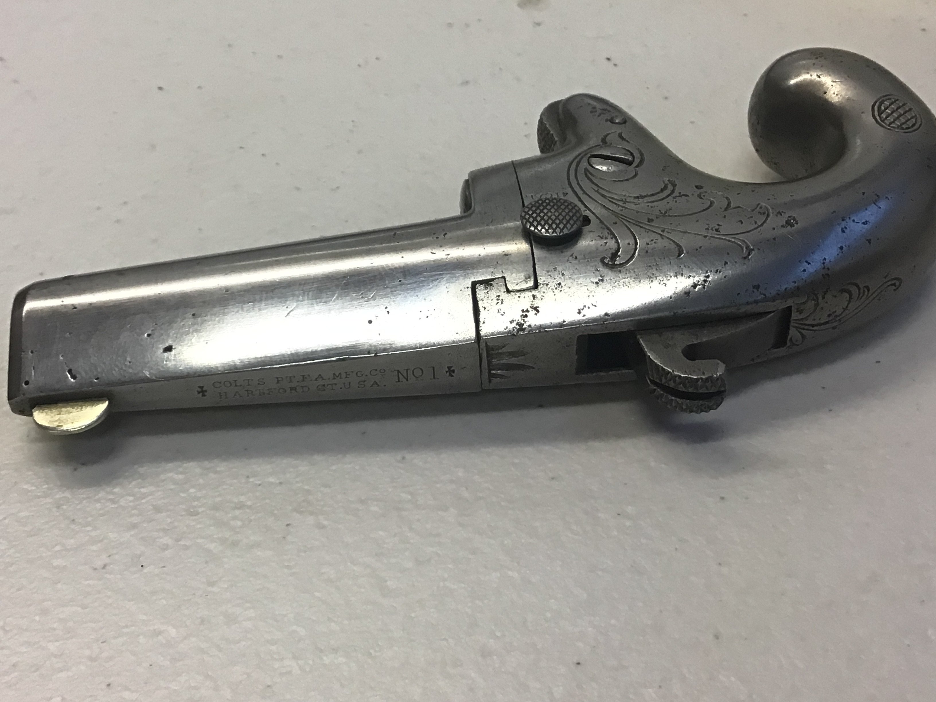 An Antique 19th century Colt No 1 Deringer rimfire pistol circa 1875 produced in relatively low numbers approximately 6500 the pistol with makers marks Colts Hartford CT USA serial number 4436.