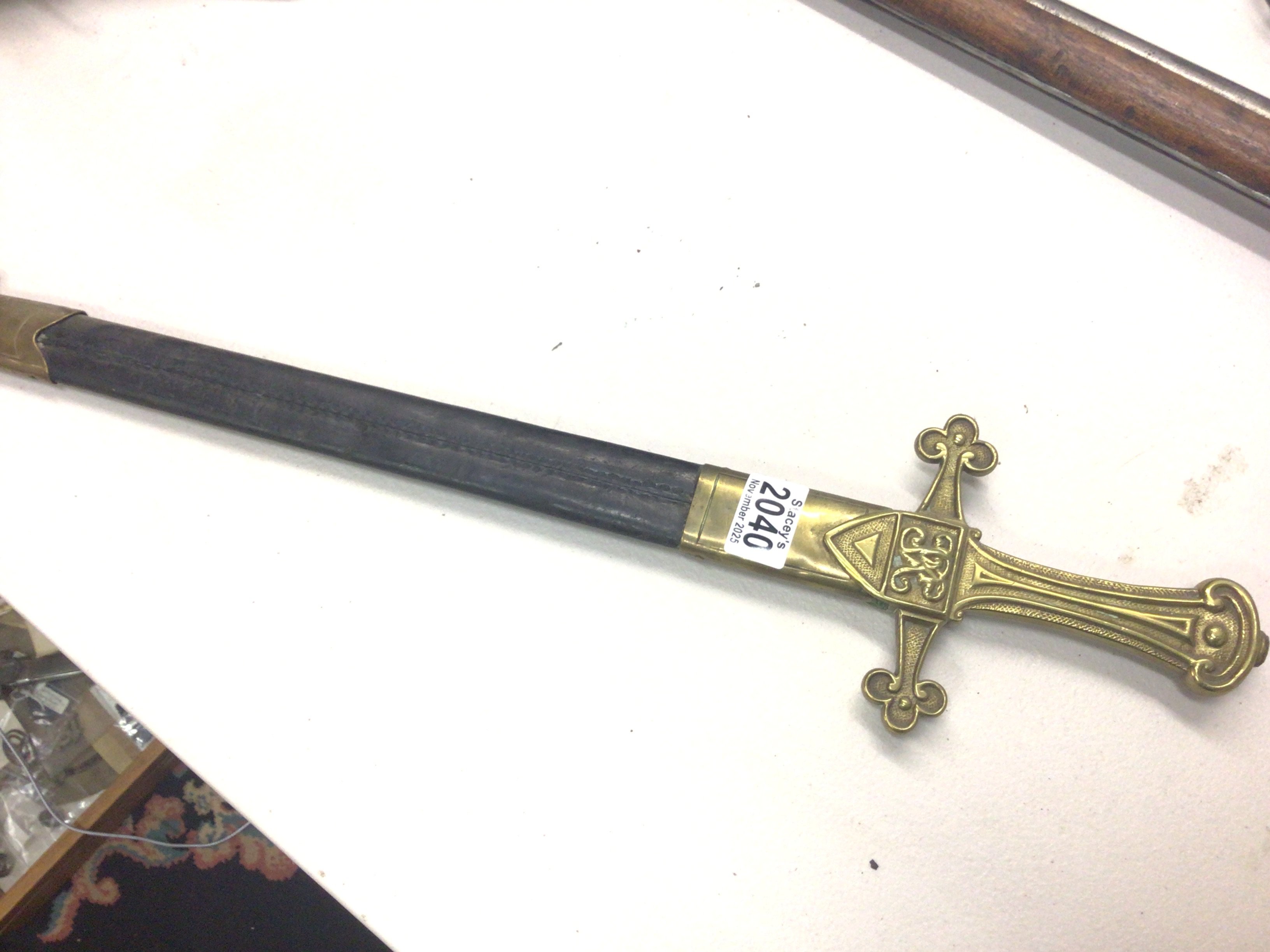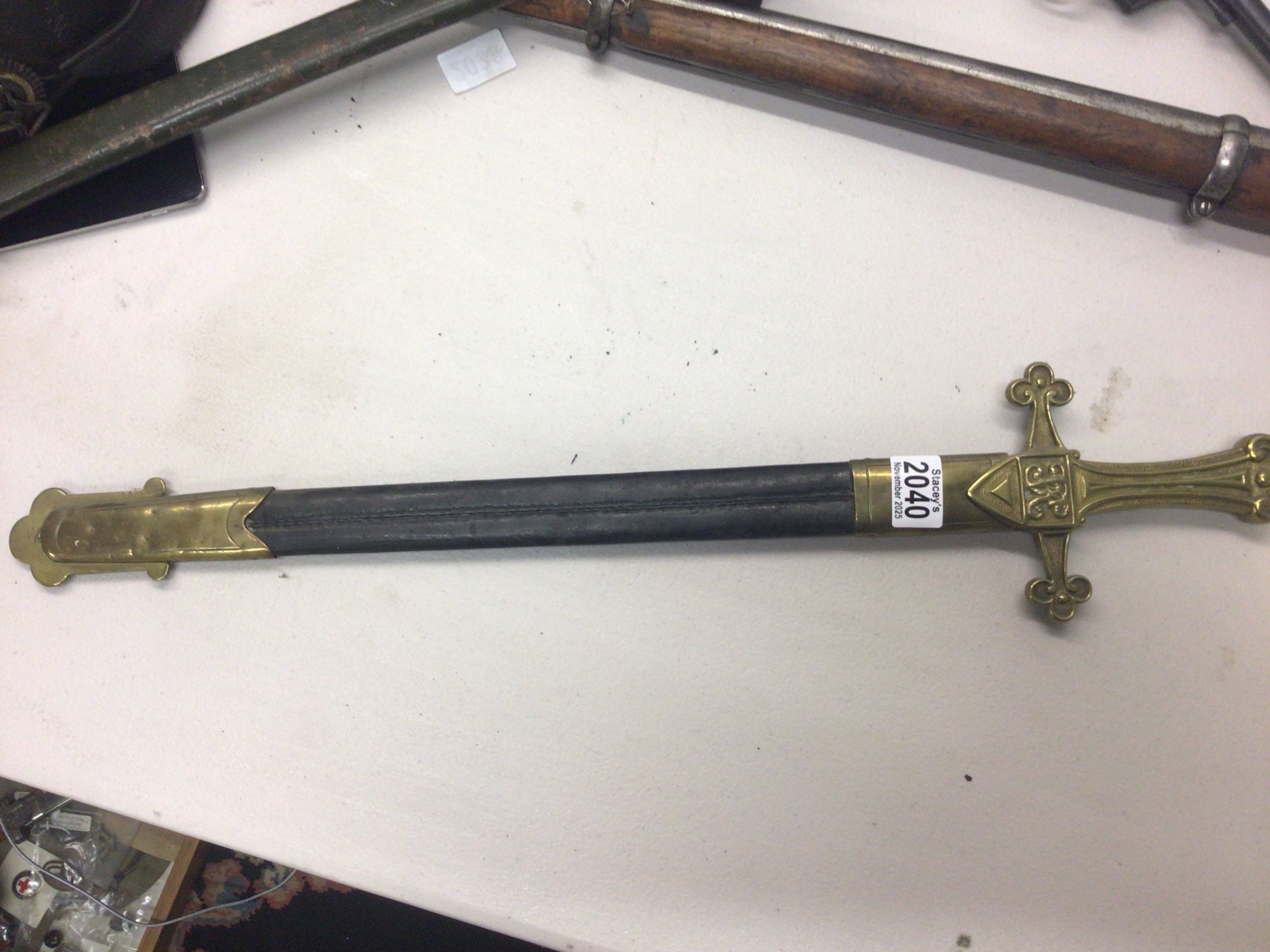 A British Military short sword 1856 pattern Mk 1 with Victorian Royal cypher. On the solid brass handle the steel blade with marks with a leather scabbard.