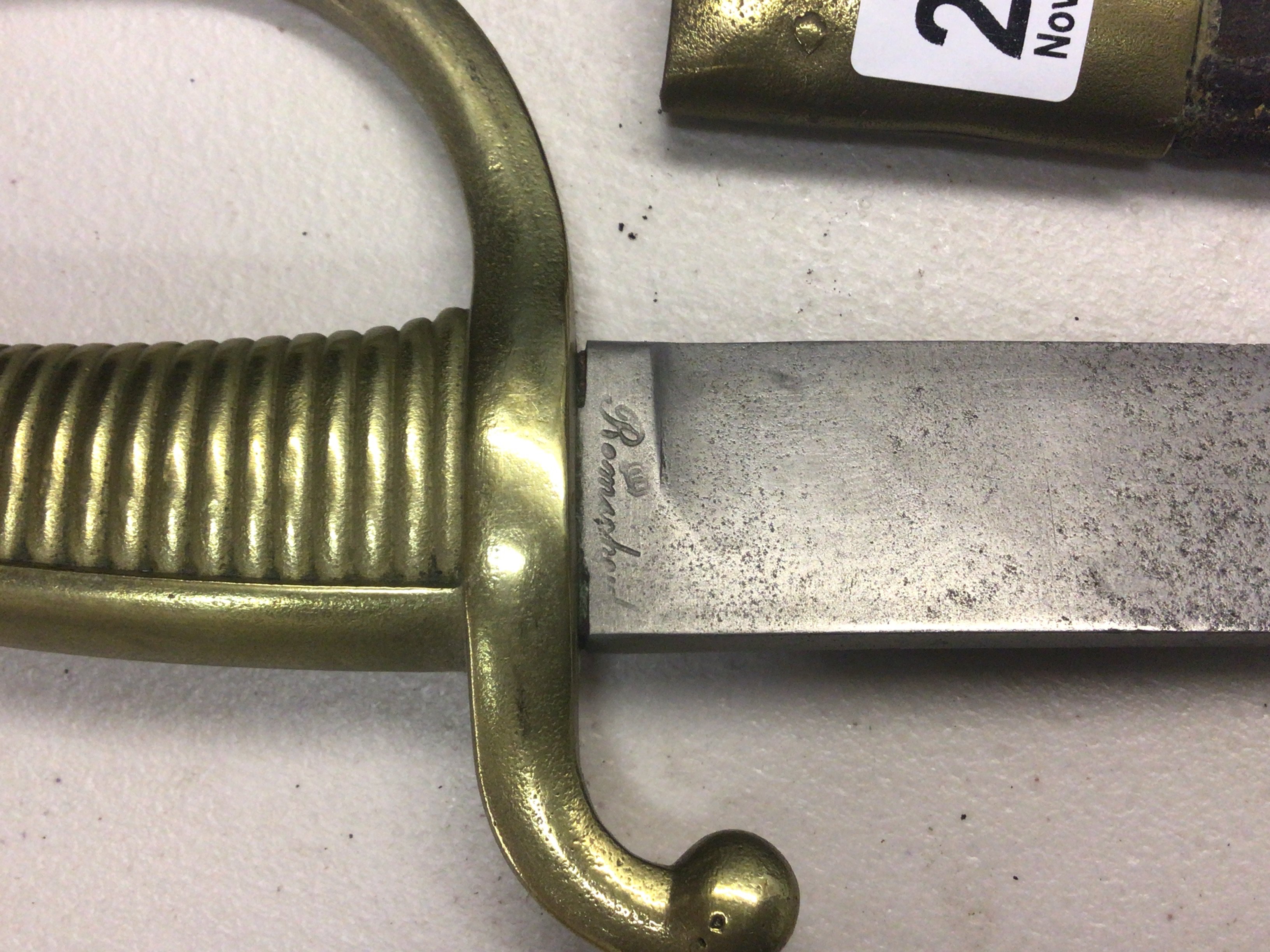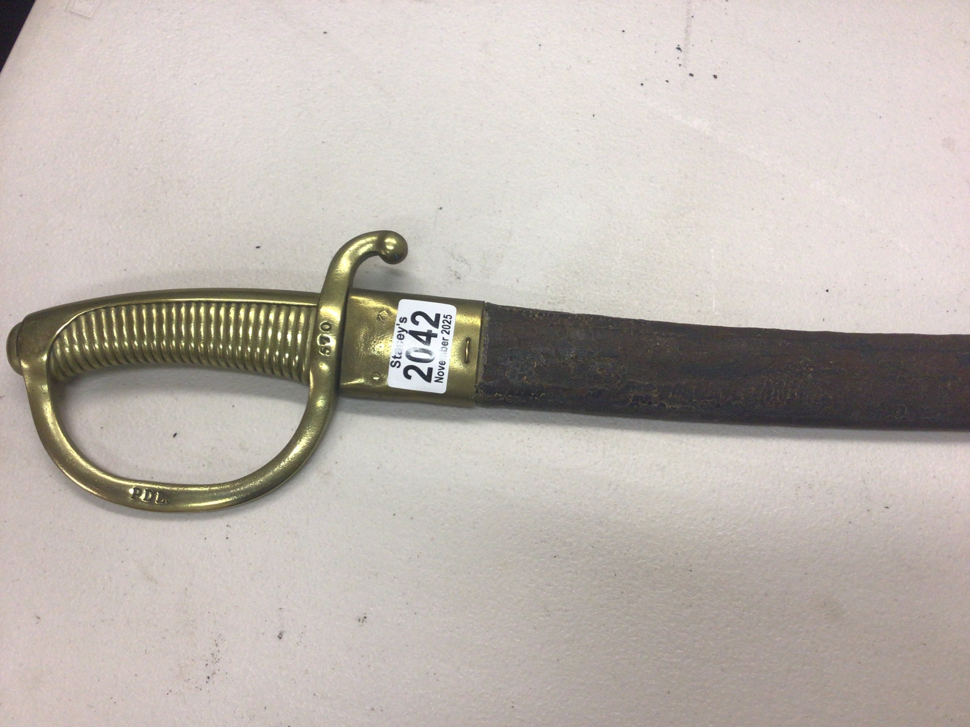 An Antique 19th Century Napoleonic Era Grenadier Briquet short sabre sword the brass guard stamped PDL 570 the steel blade with further marks with a leather scabbard.