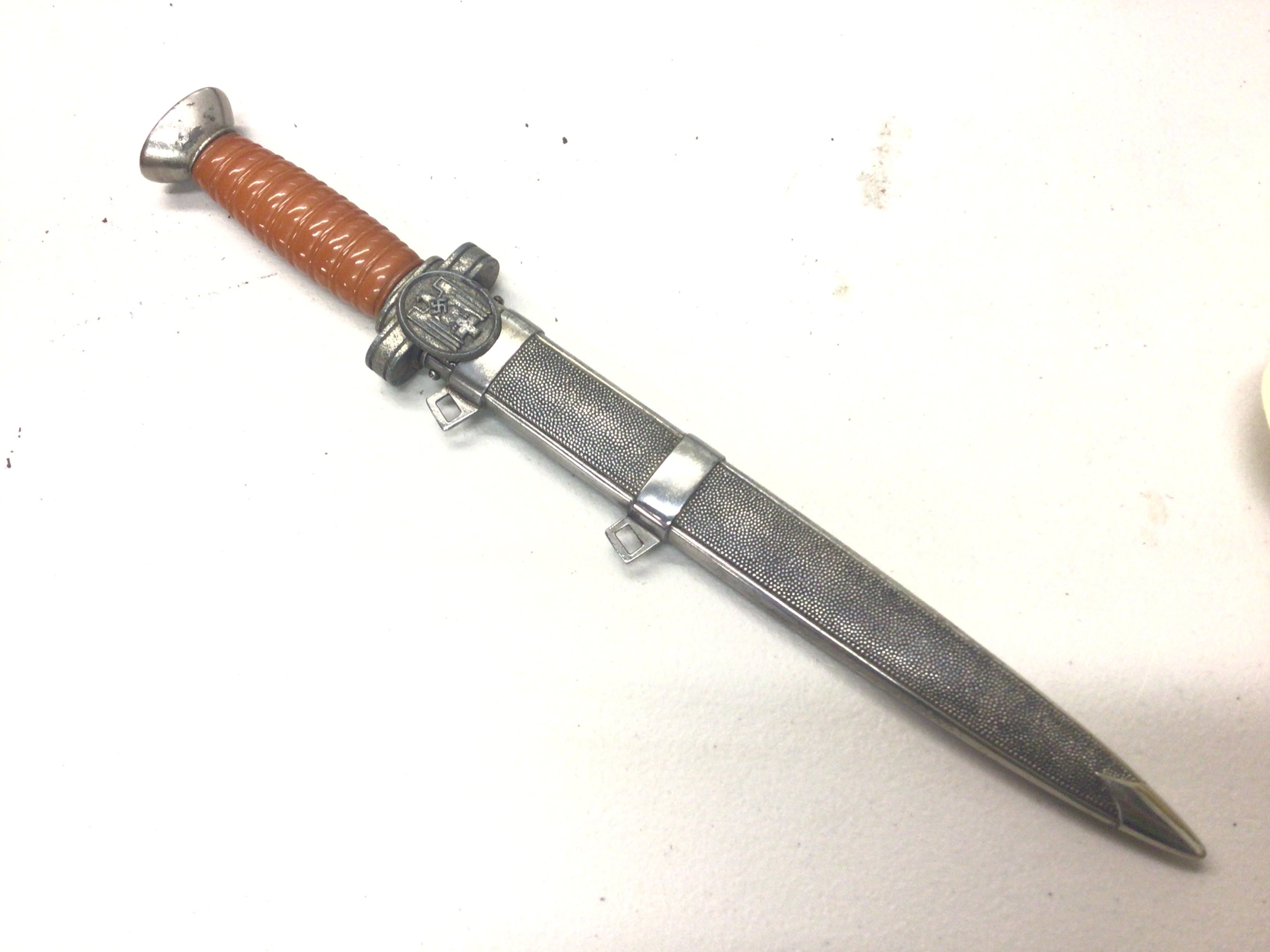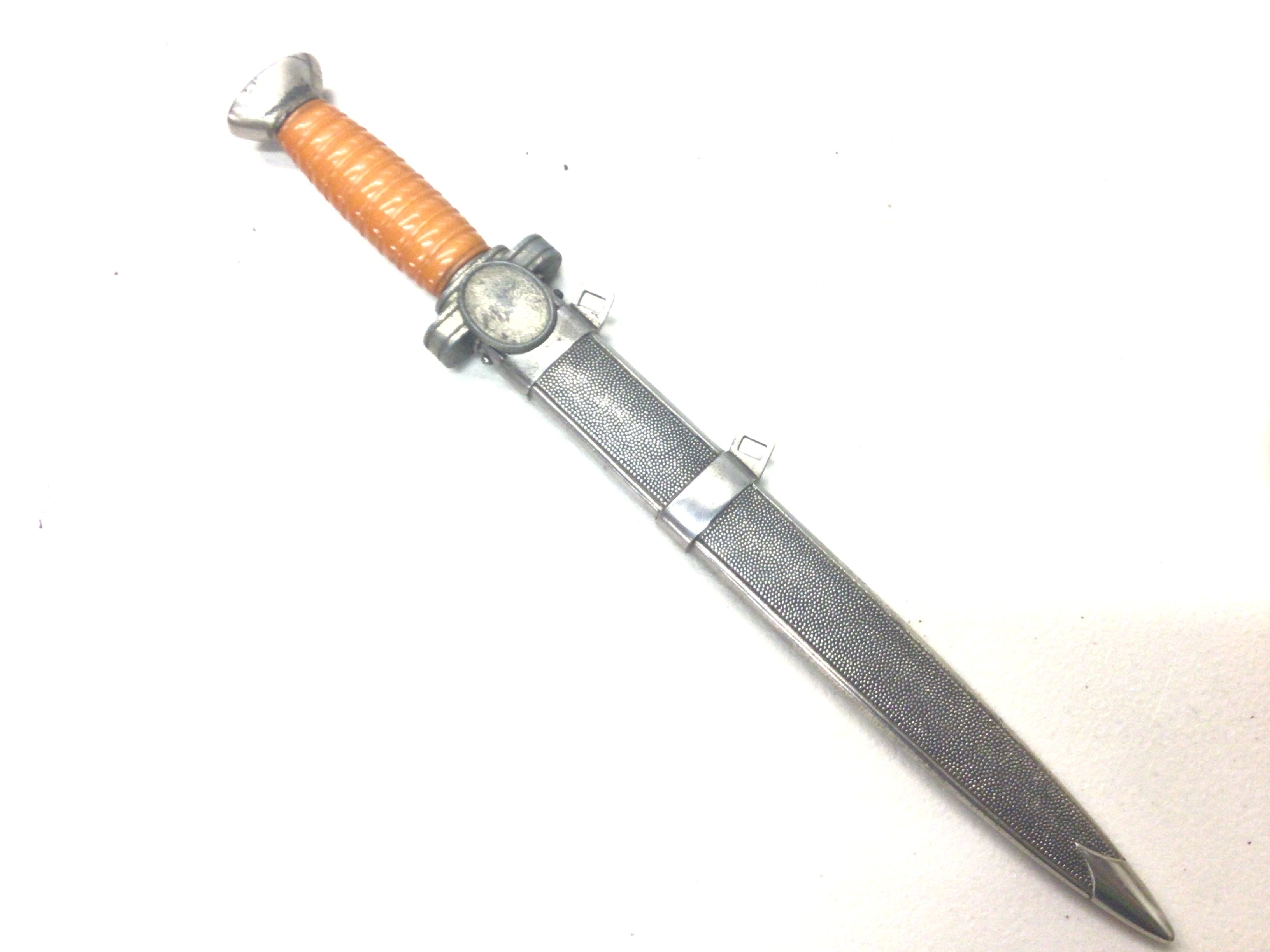 A rare German Third Reich Red Cross Leader dagger (DRK), double-edged dagger blade Oval guard with DRK eagle on one side, other side blank.