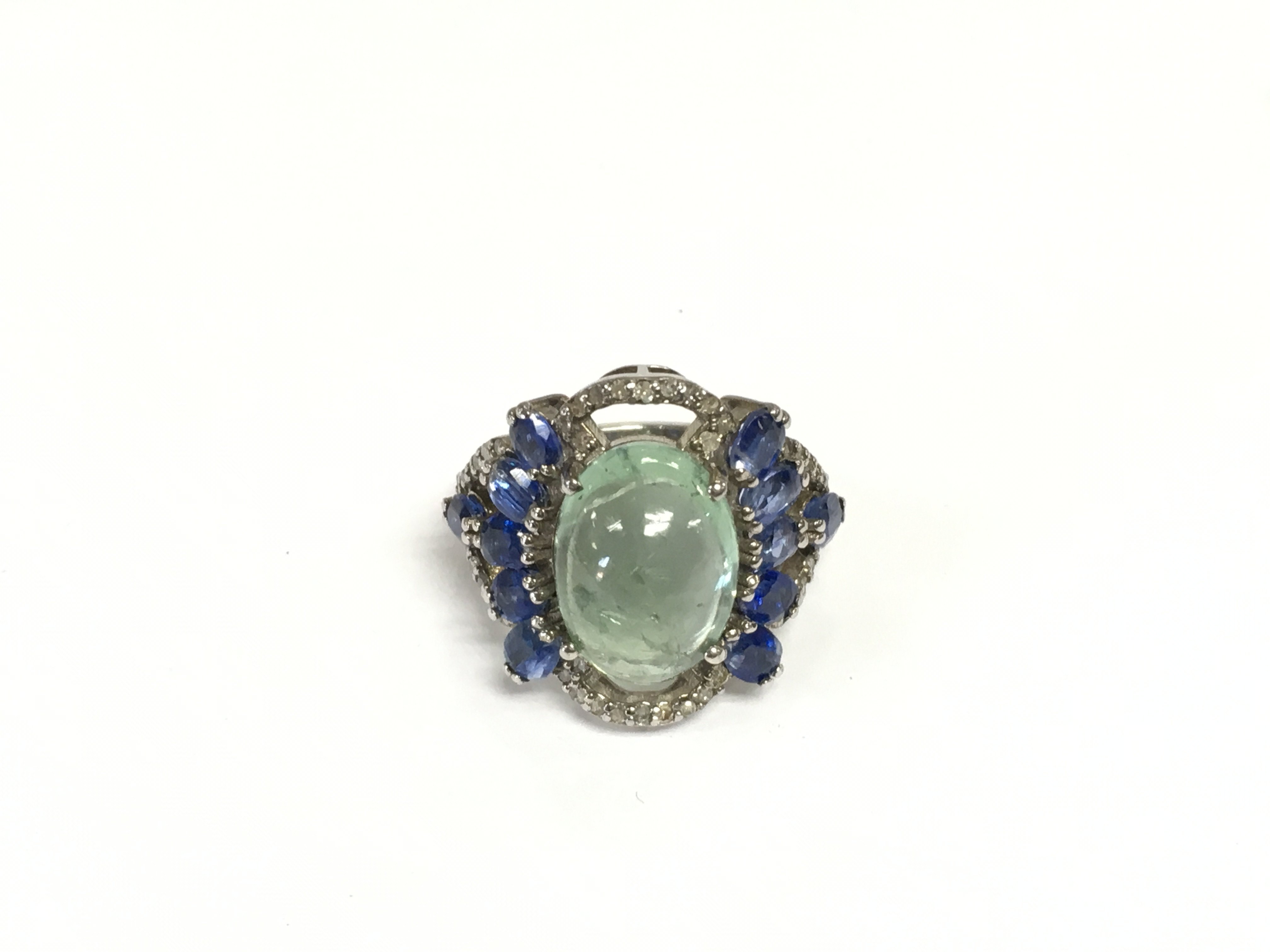 A large and unusual black rhodium coated silver dress ring set with an oval cabochon blue/green tourmaline, oval tanzanites and diamonds. Tourmaline approx 5.00ct, tanzanites approx 5.00ct, diamonds approx 0.60ct. Approx size N. Shipping category A.