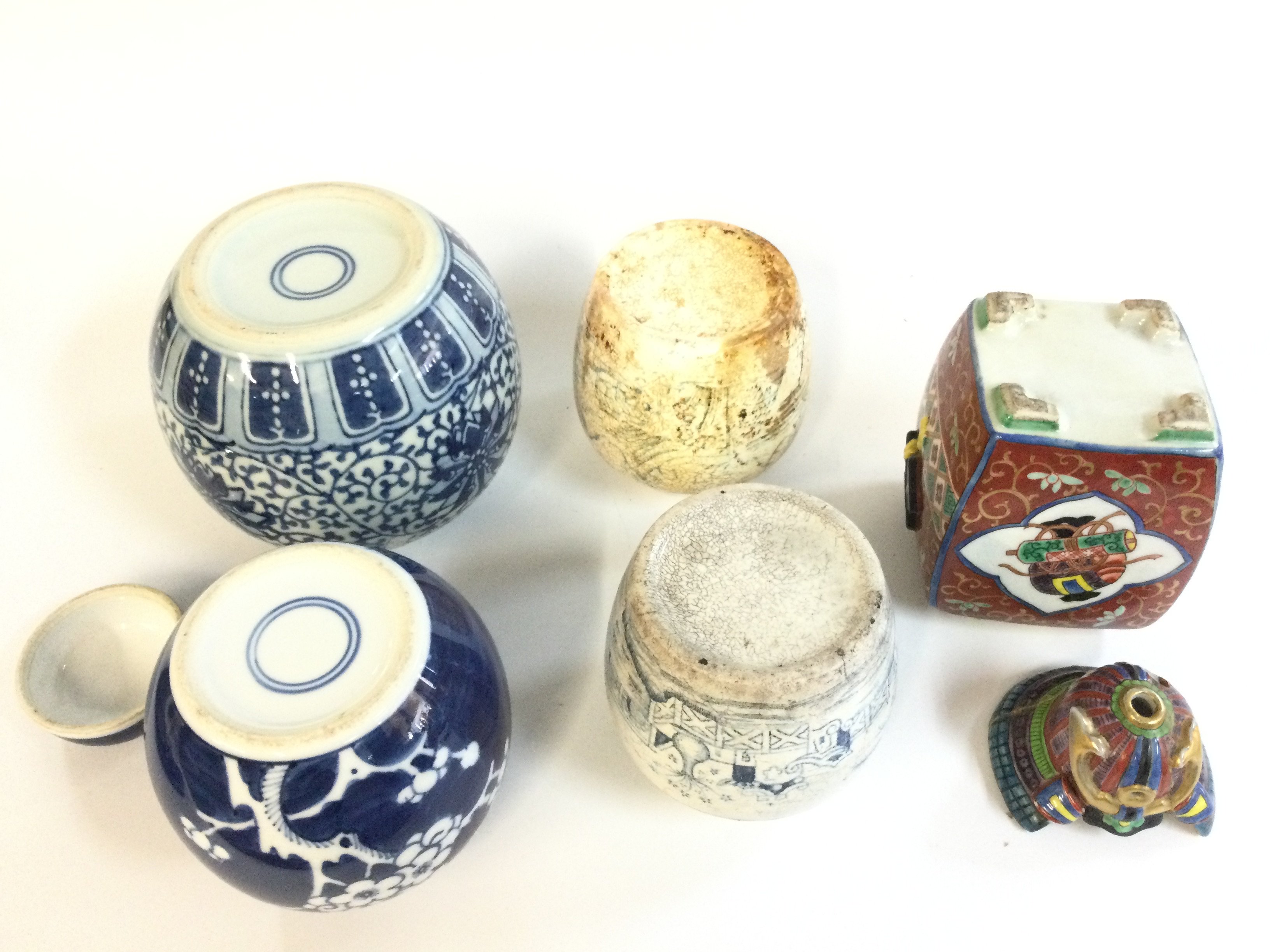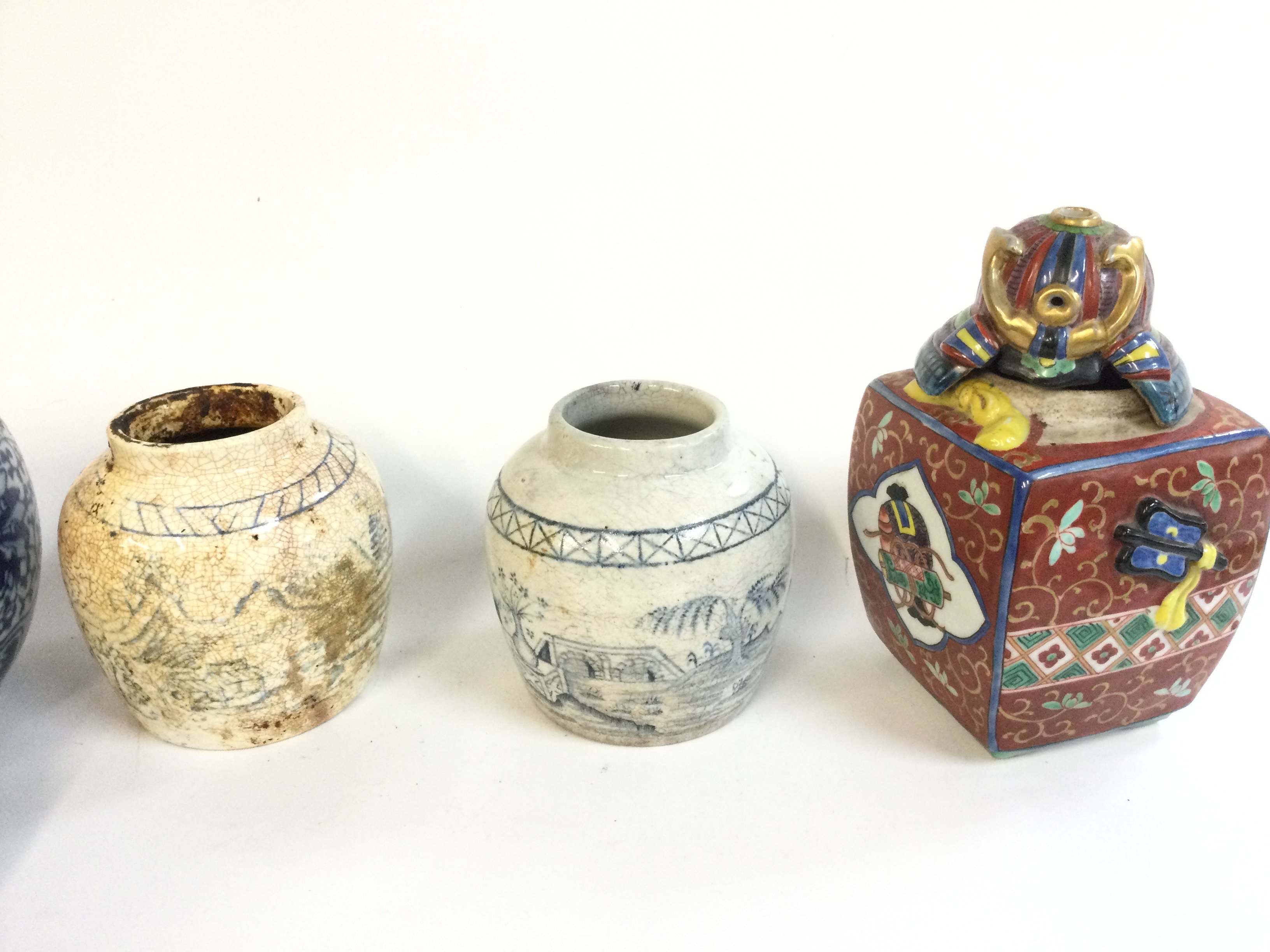 A collection of Chinese jars and a Japanese samurai jar. 9 to 16cm tall. This lot cannot be posted
