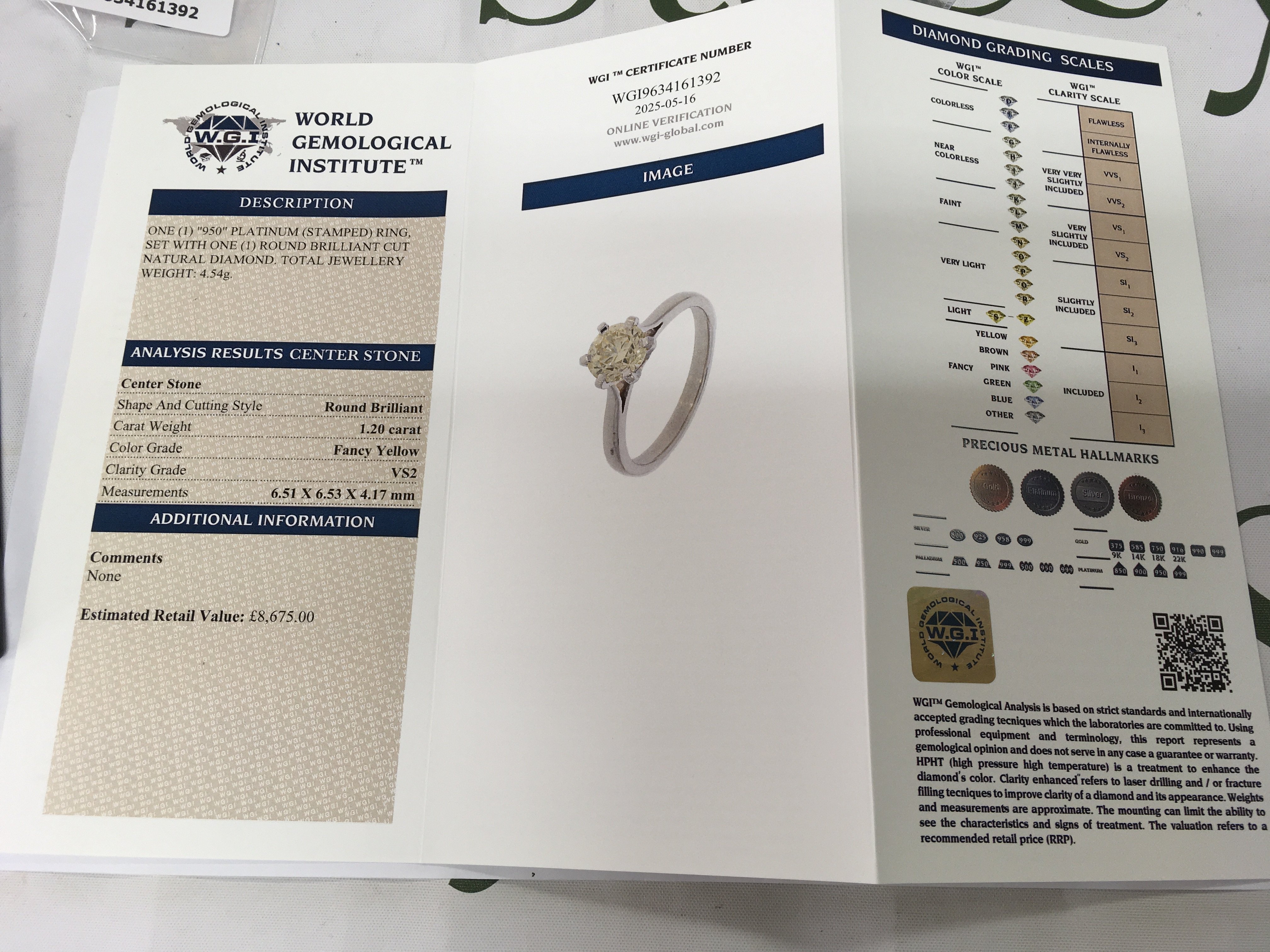 A certificated platinum RBC diamond solitaire ring. Diamond approx 1.20ct. Cert no WGI9634161392. Approx 4.6g and approx size N-O. Shipping category A.