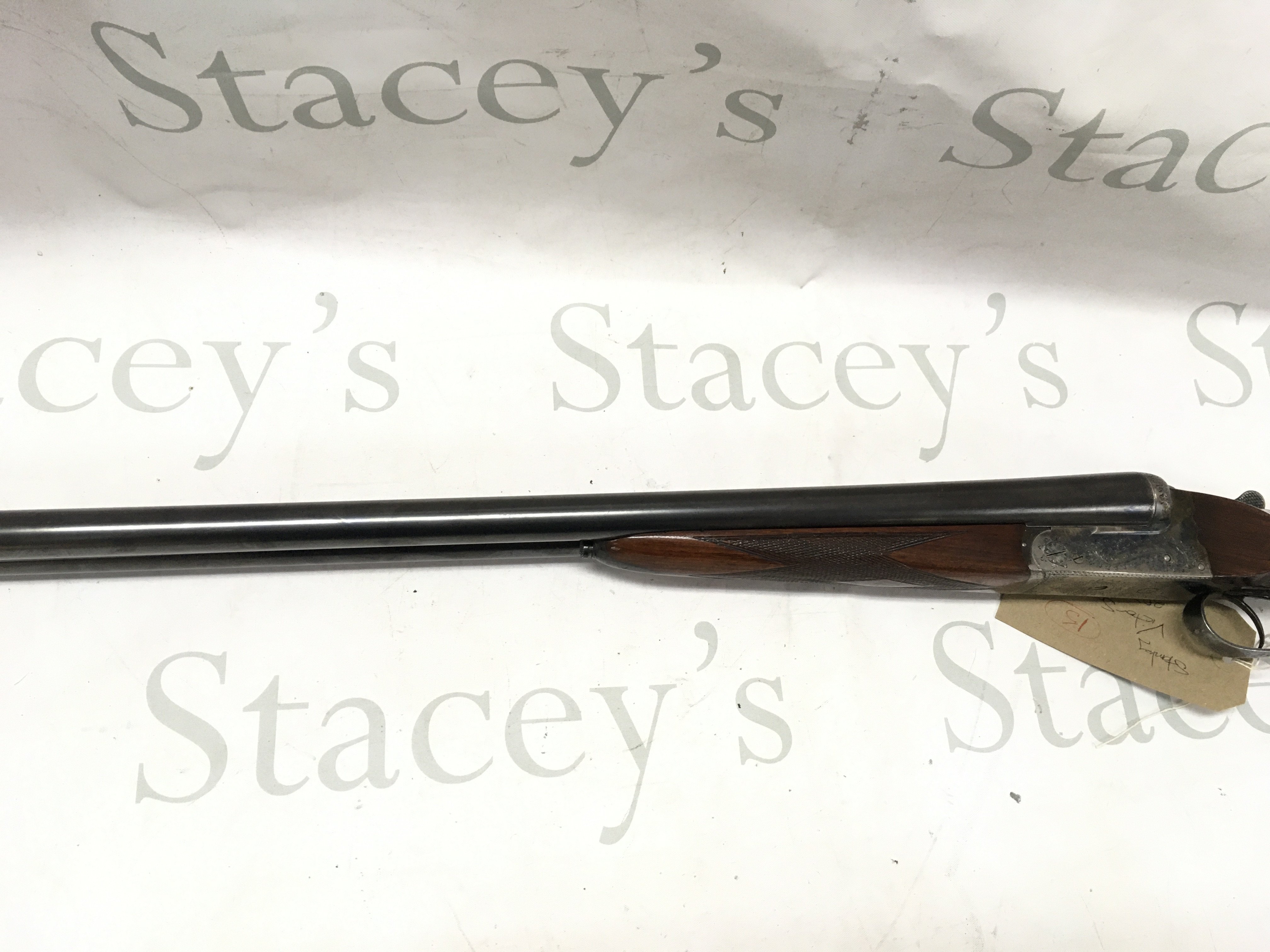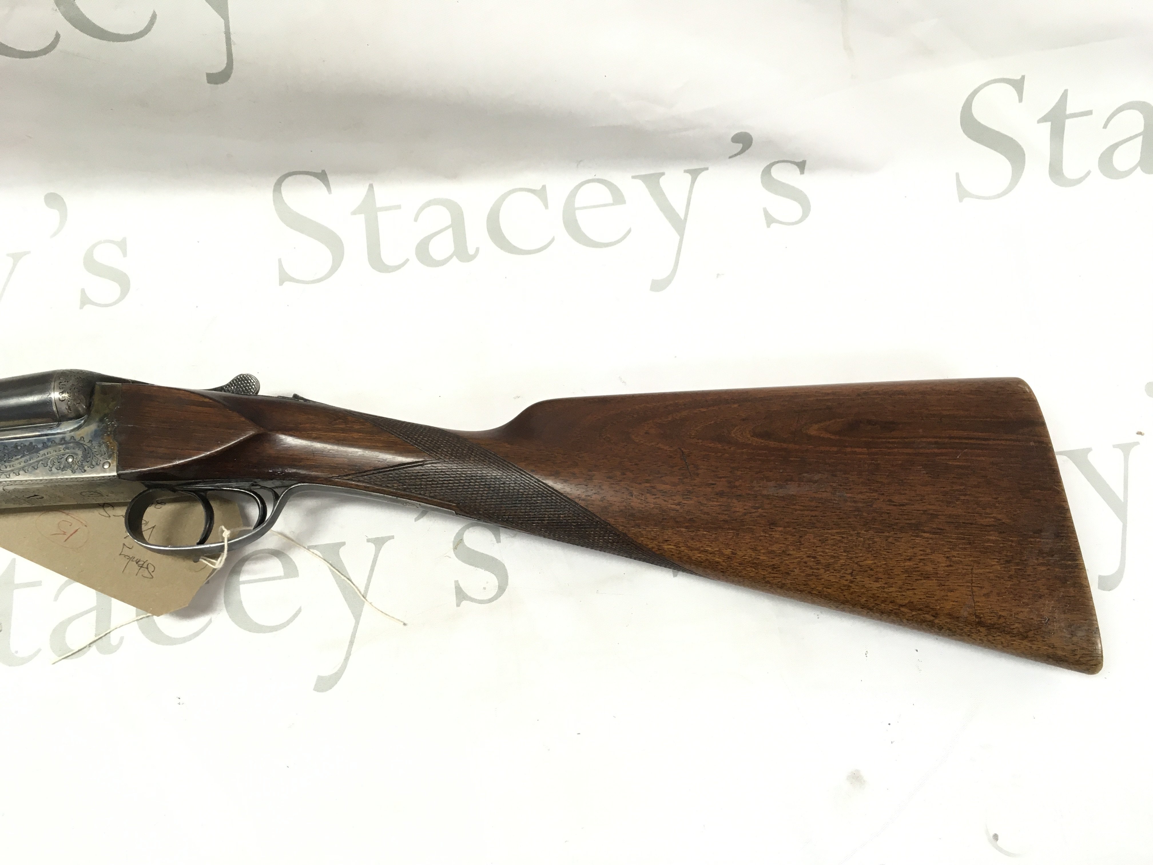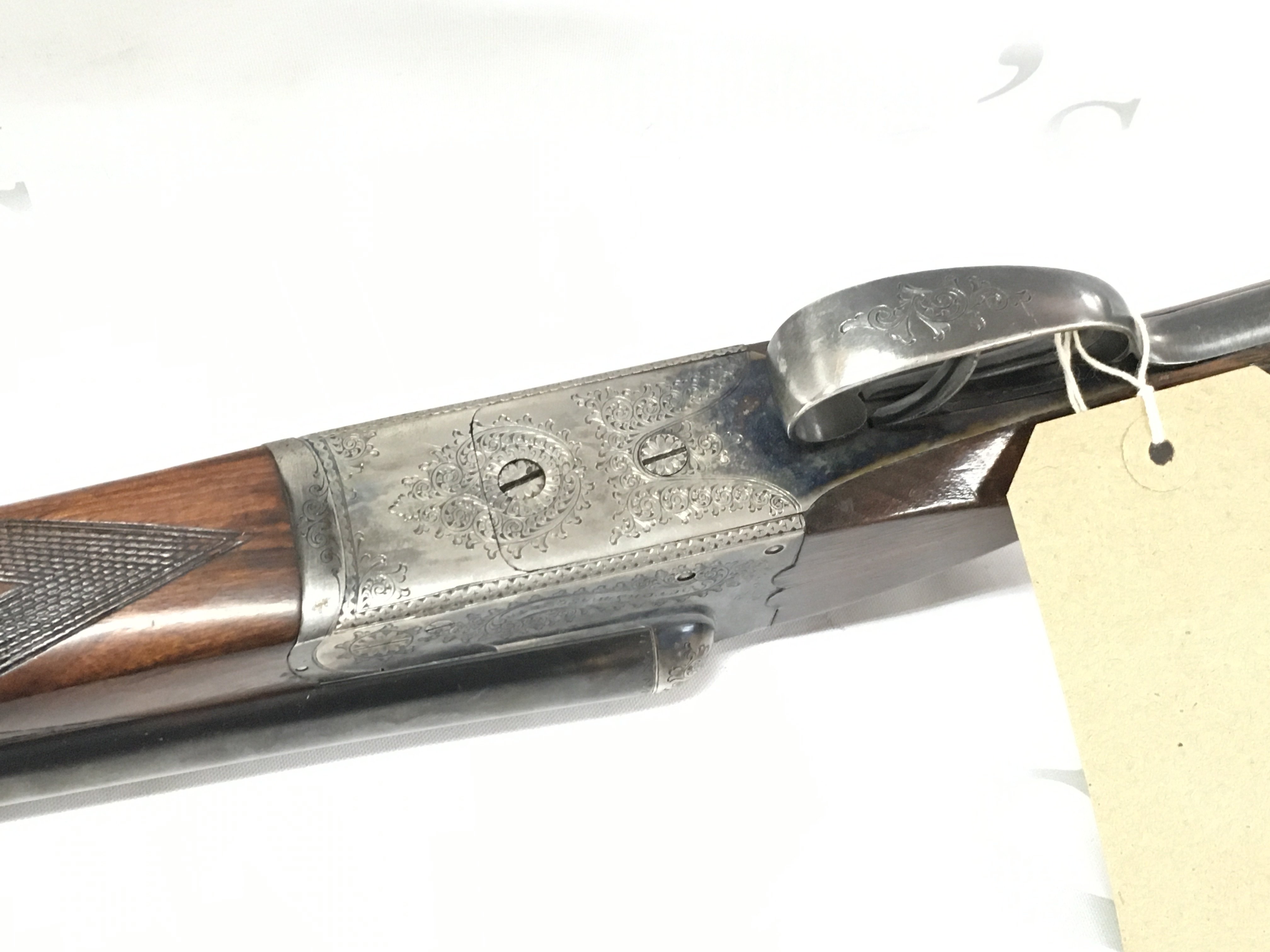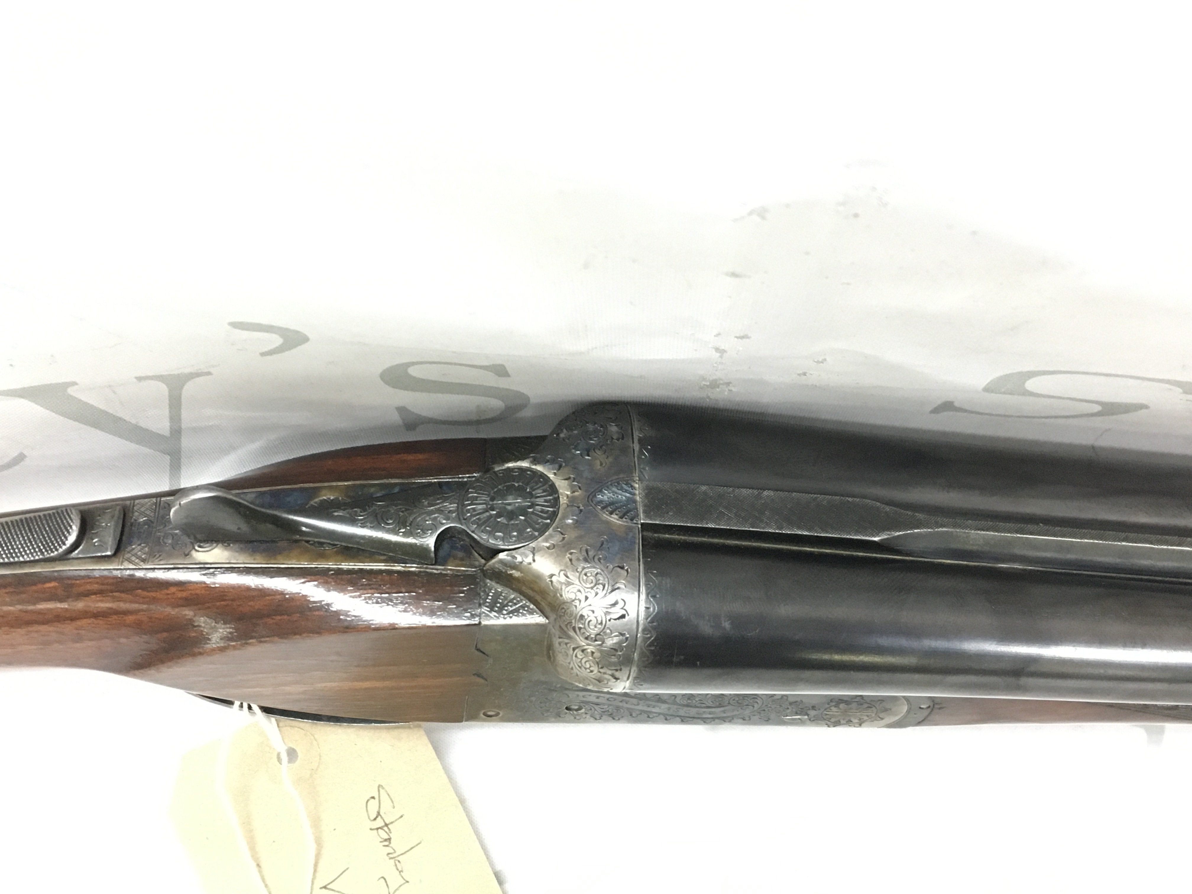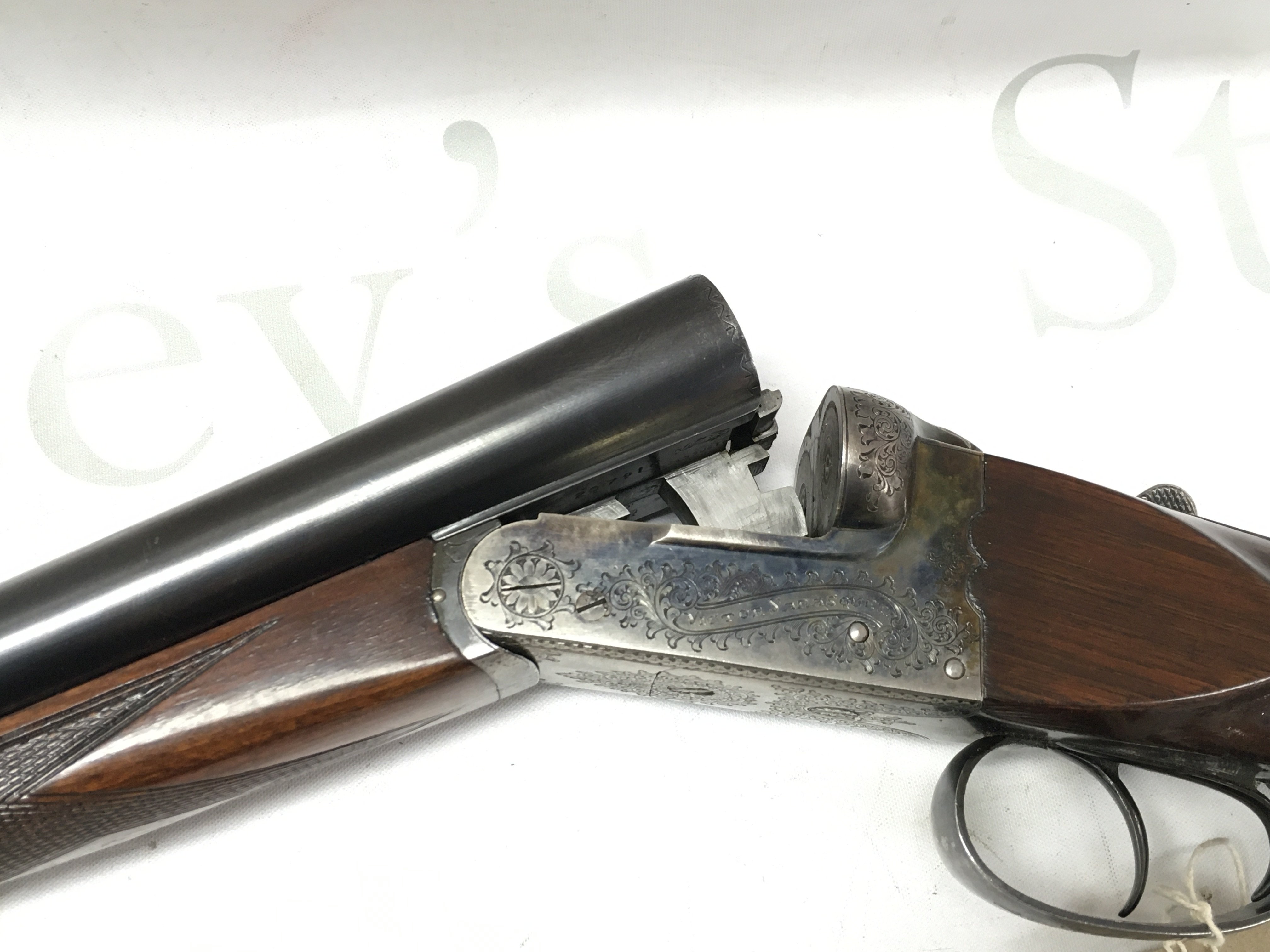 A 12 gauge side by side shotgun by Victor Sarasqueta. Double trigger. 25.75 barrel length and 42.5 inches overall. Serial number 207916 PLEASE NOTE THAT A SHOTGUN LICENSE IS REQUIRED TO PURCHASE THIS ITEM. COLLECTION AND VIEWING BY APPOINTMENT ONLY.