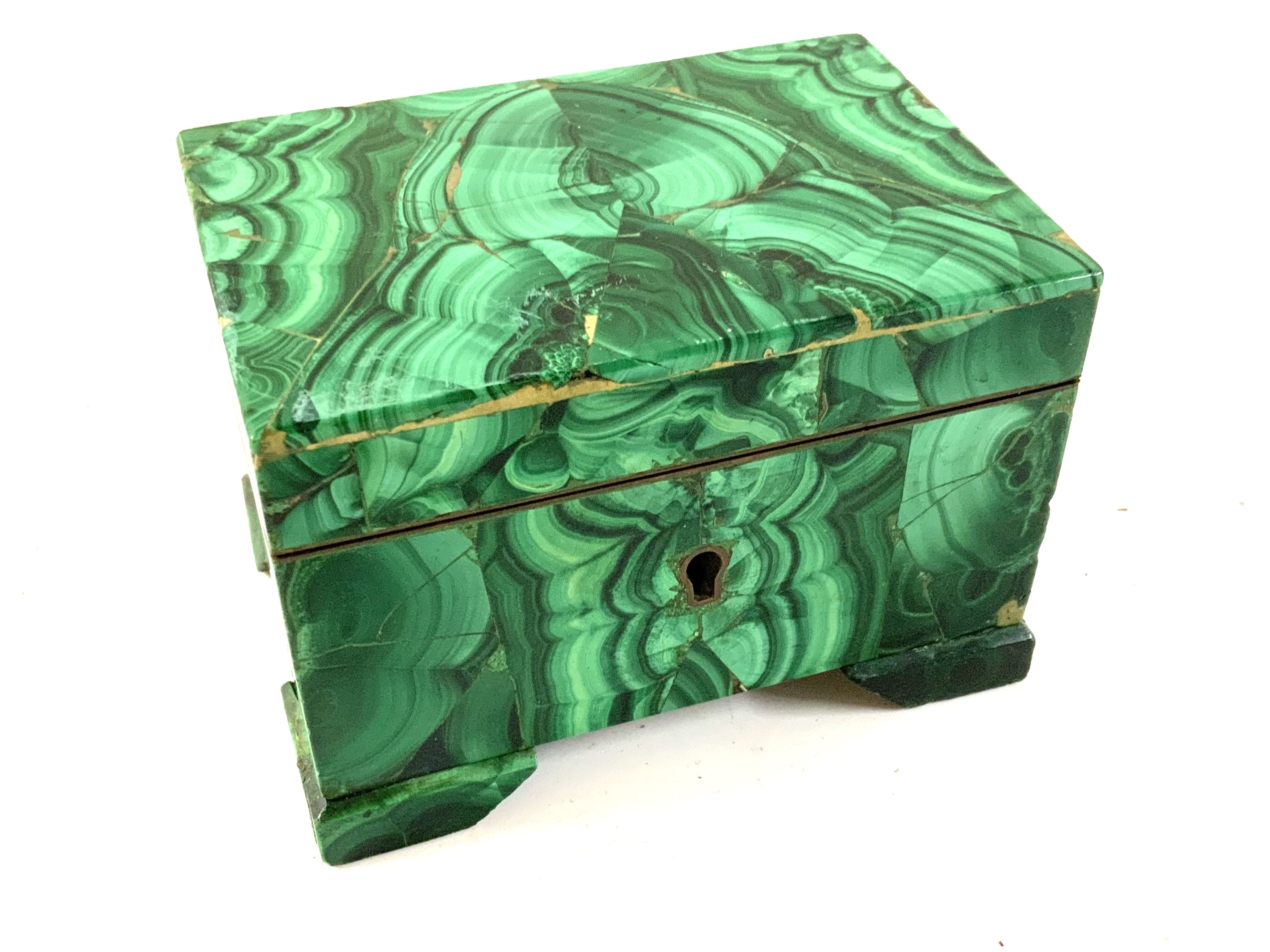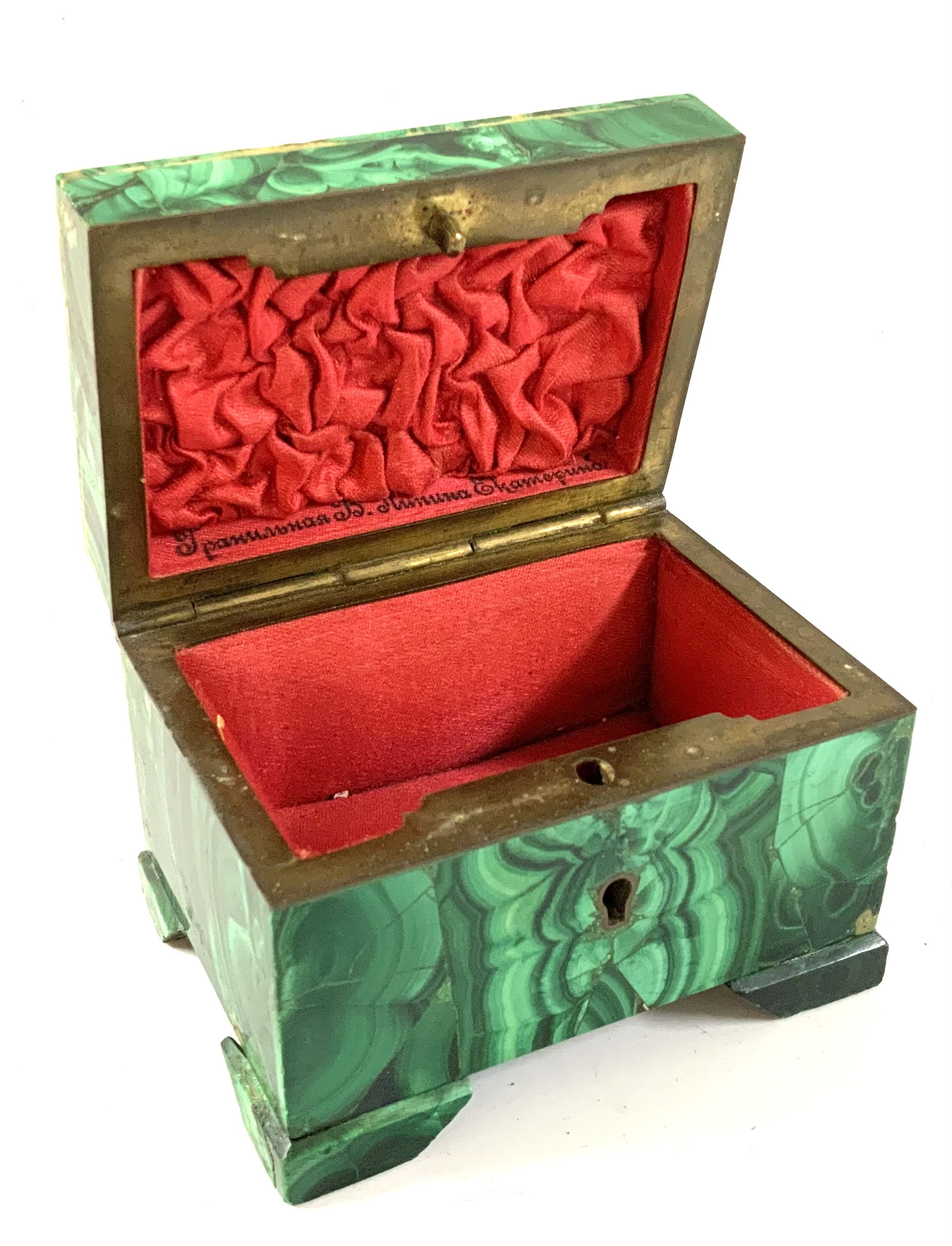 A small malachite trinket box, 9cm x 6cm x 6.5cm.