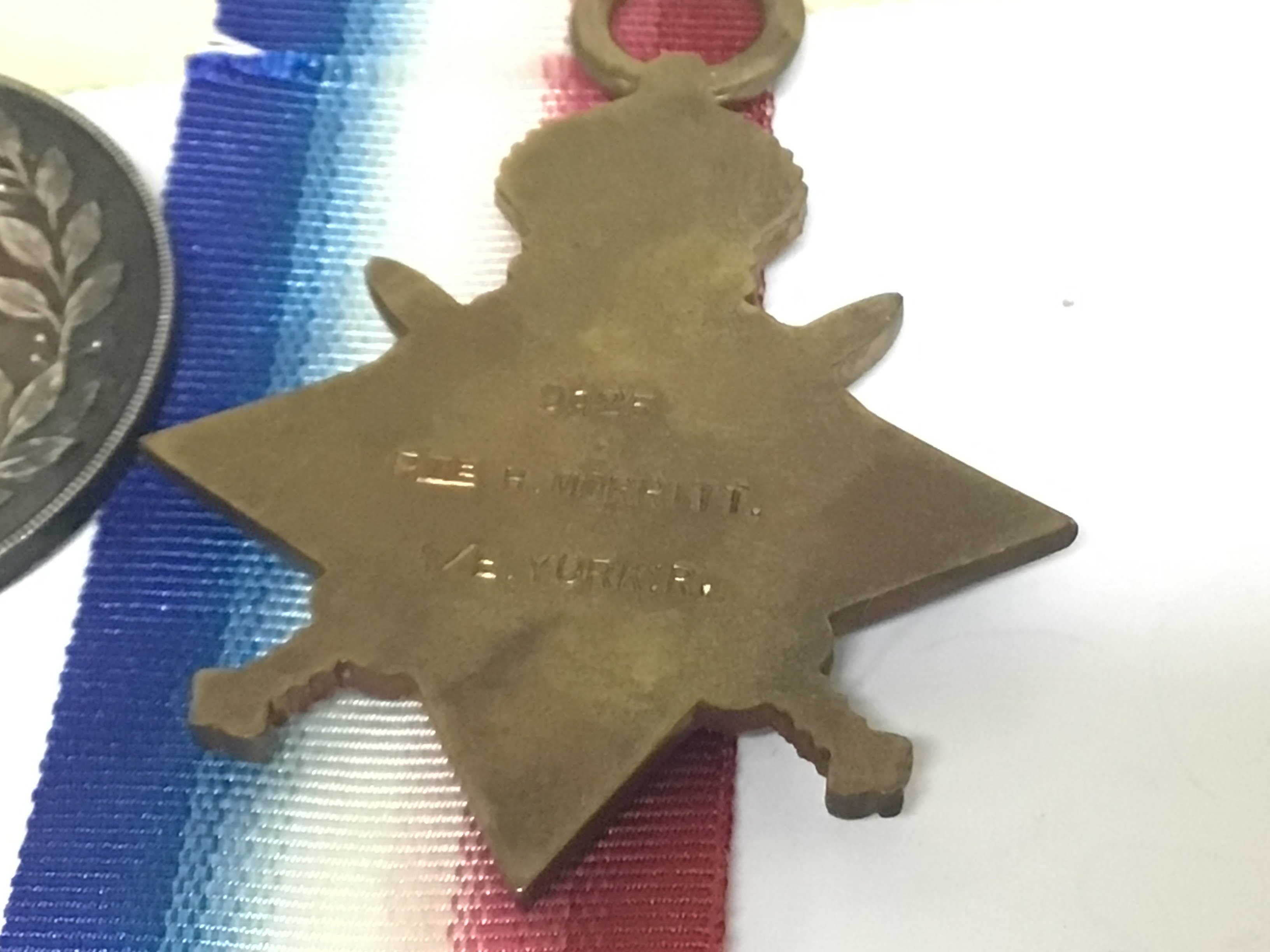 A I world war medal 1914 star awarded to 9925 PTE H Morritt 1 E York R killed in action with memorial plaque imperial war grave paperwork dated 2/12/1926. With other intresting retrospective paperwork and a Sports medal won 28/April 1917.